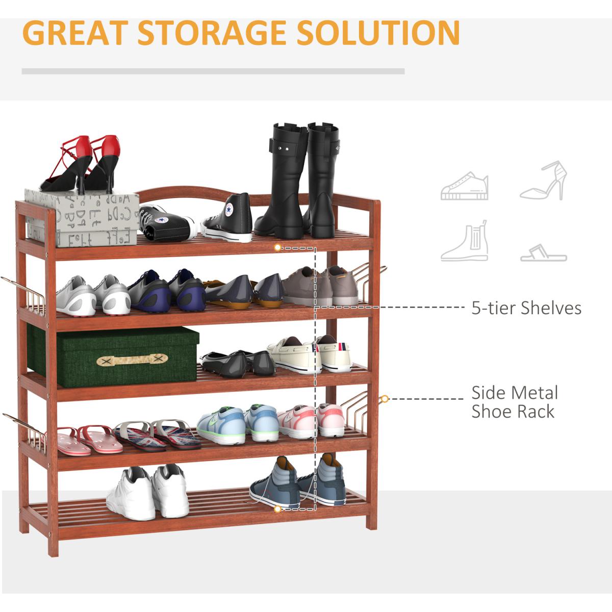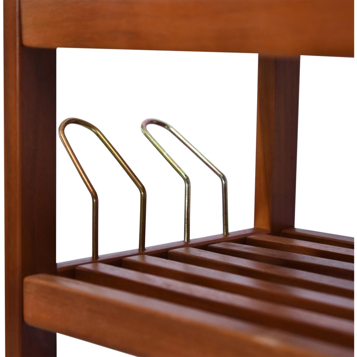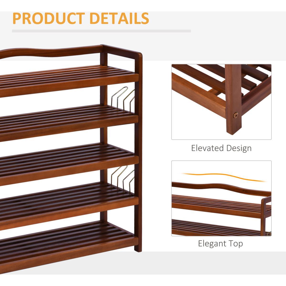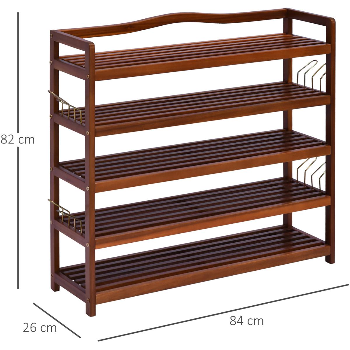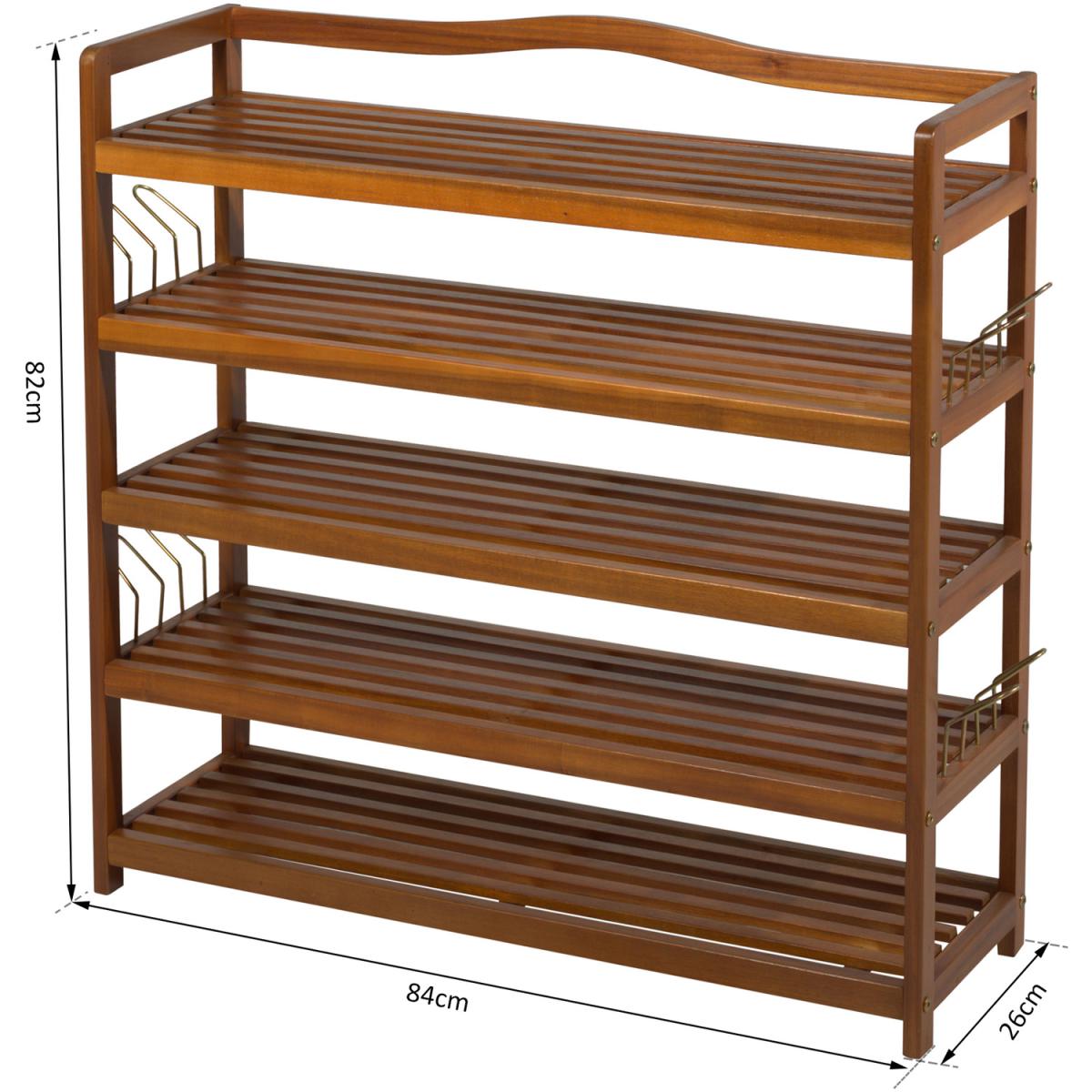 This wooden shoe rack by HOMCOM is a great solution for organising and storing your footwear. Made from Acacia wood in a 5-tier design, it is ideal for placing low ankle shoes on the 4 bottom tiers and if you have any boots to be placed on the top shelf. It also comes with side hangers for your slippers if needed. With a weight capacity of 80Kg per shelf, it can hold up to 25 pairs of shoes. Styled in a vintage look in a teak finish it adds an elegant touch to any decor of your room.