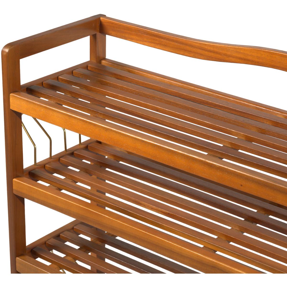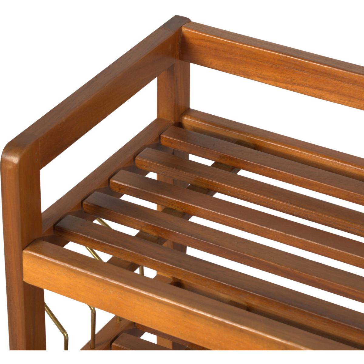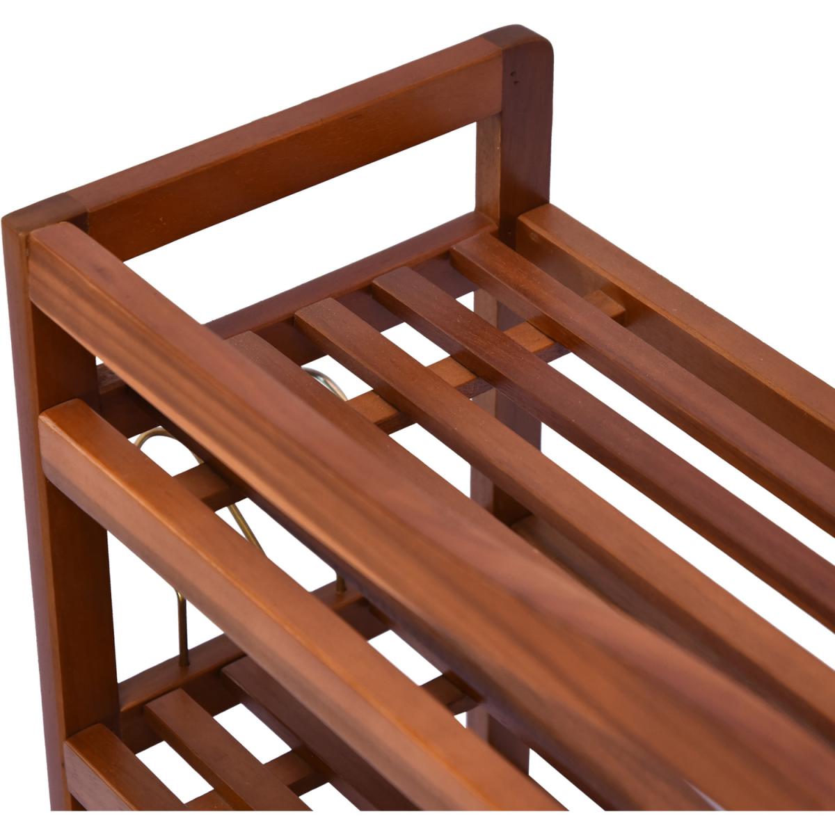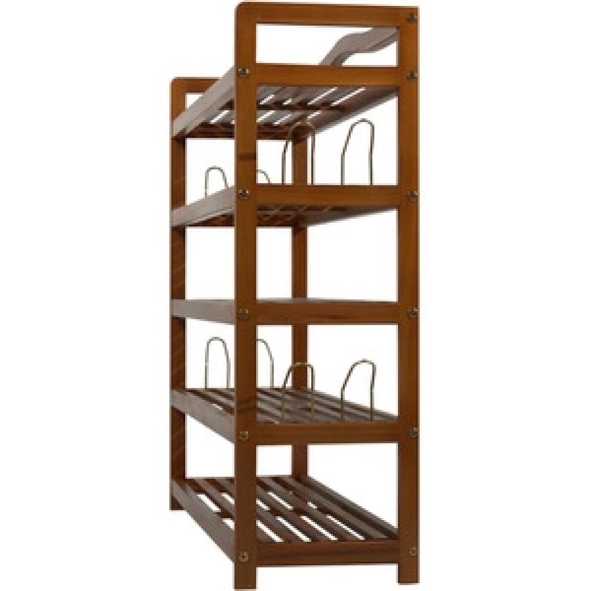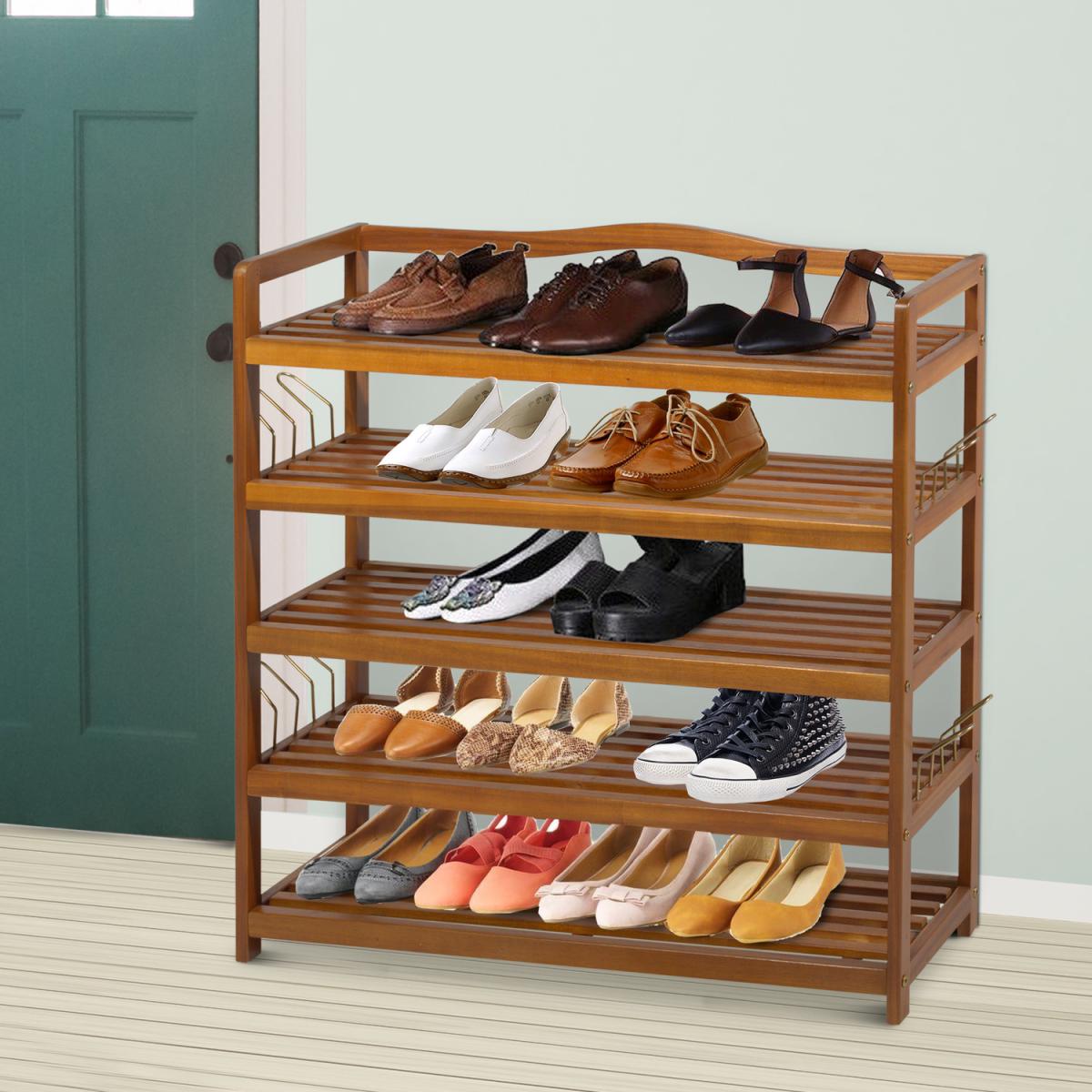 This wooden shoe rack by HOMCOM is a great solution for organising and storing your footwear. Made from Acacia wood in a 5-tier design, it is ideal for placing low ankle shoes on the 4 bottom tiers and if you have any boots to be placed on the top shelf. It also comes with side hangers for your slippers if needed. With a weight capacity of 80Kg per shelf, it can hold up to 25 pairs of shoes. Styled in a vintage look in a teak finish it adds an elegant touch to any decor of your room.