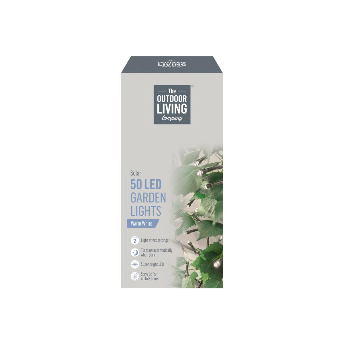 This set of 50 LED string lights are set out on a green cable which helps to blend them well into your garden and outdoor area. With their solar powered function and static setting, once charged will light up automatically for up 8 hours once dusk arrives. Giving off a bright warm white light to brighten up your garden. The lights have a 4.9m lit length range and a 2m lead cable from the solar charging panel, allowing you to place them in and around your garden or patio area. The solar charging panel requires 1 x AAA rechargeable batter which is included with the lights. These eco friendly LED lights are the perfect addition to lighting up your outdoor space and creating a welcoming atmosphere for all your friends and family to enjoy.