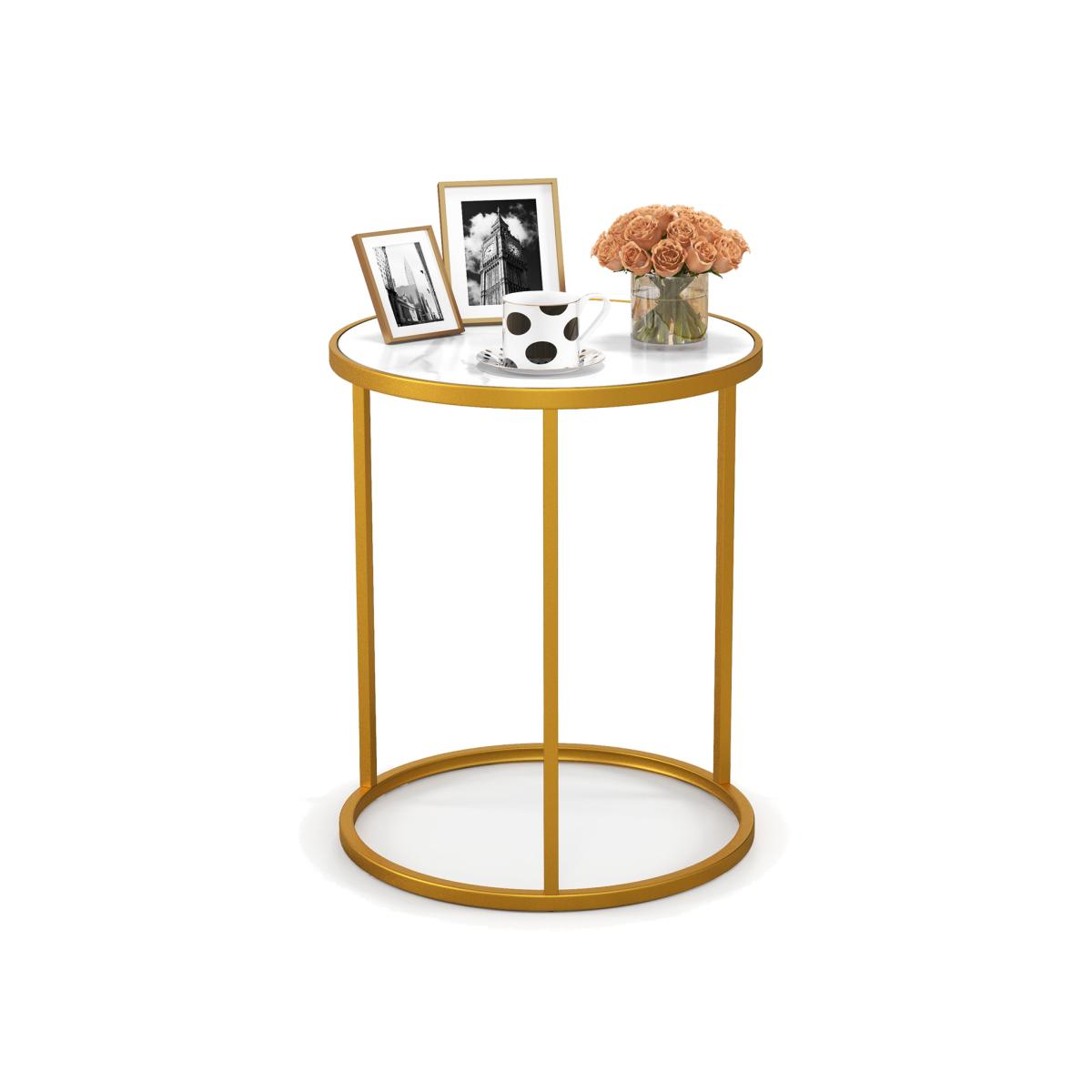 Featuring a white marble top and a gold-colored metal frame, this table exudes elegance and sophistication. Its compact size saves valuable space while offering extra room to hold a telephone, lamp, or other items. The non-slip feet provide stability, keeping the table securely in place. With its reliable structure and stylish appearance, our round side table combines functionality and aesthetics seamlessly, making it a must-have piece for any space.