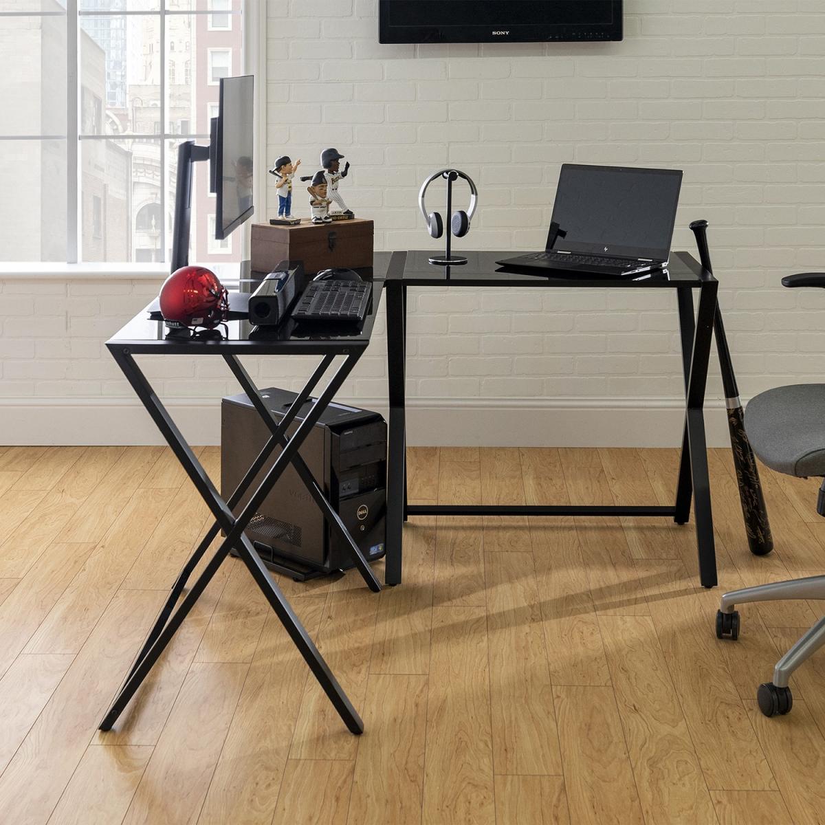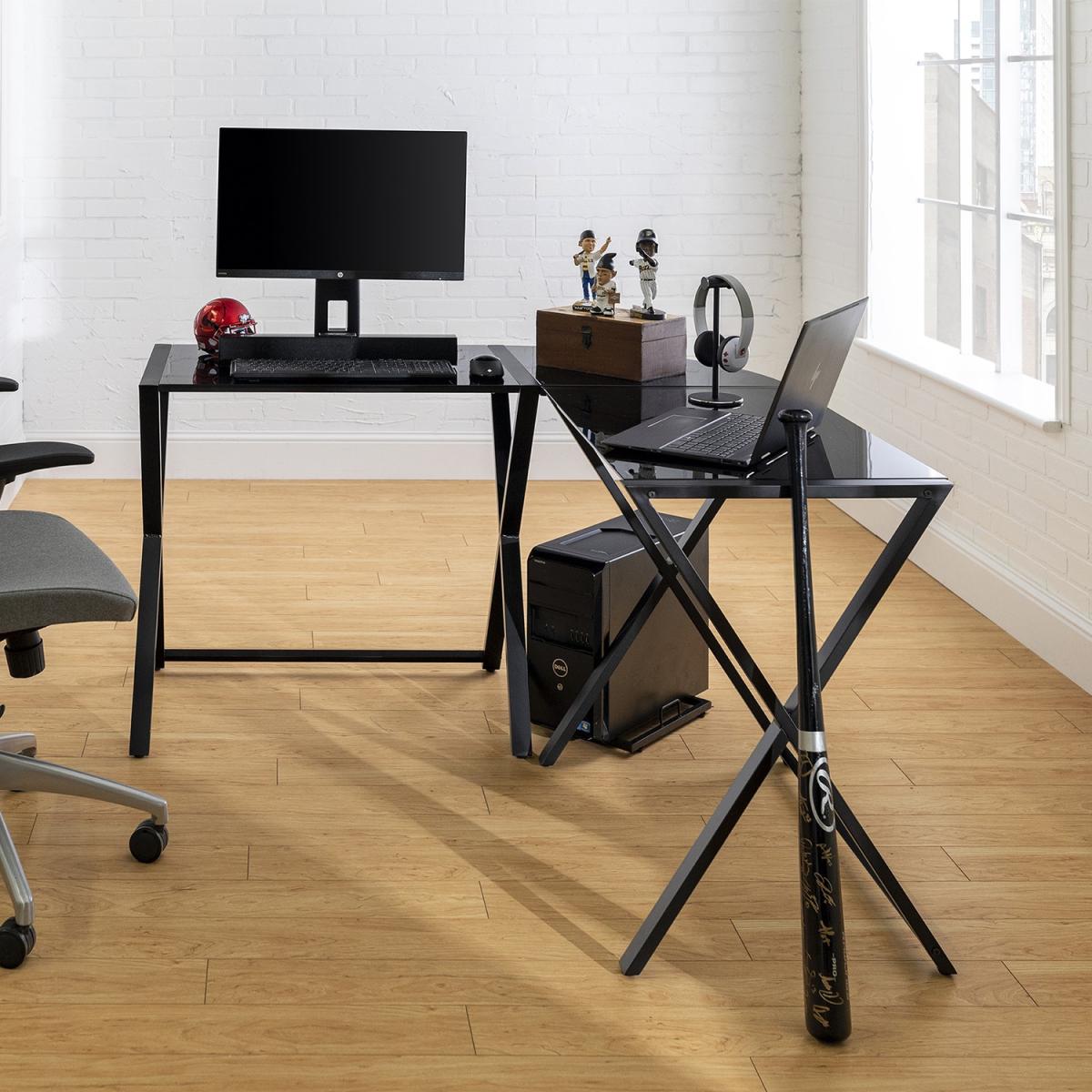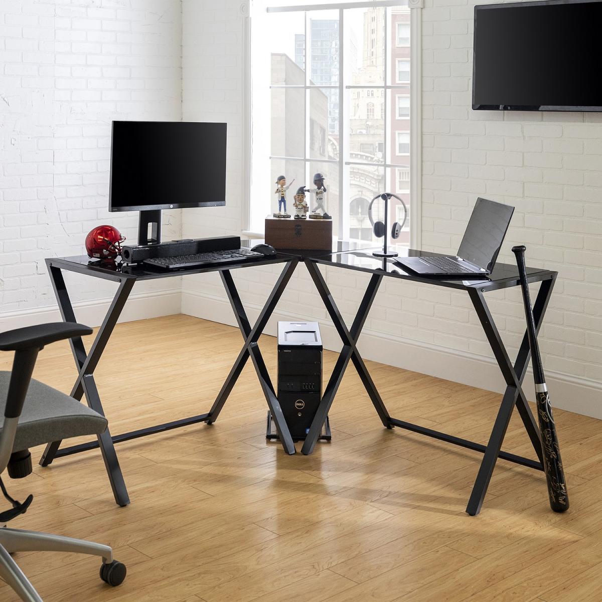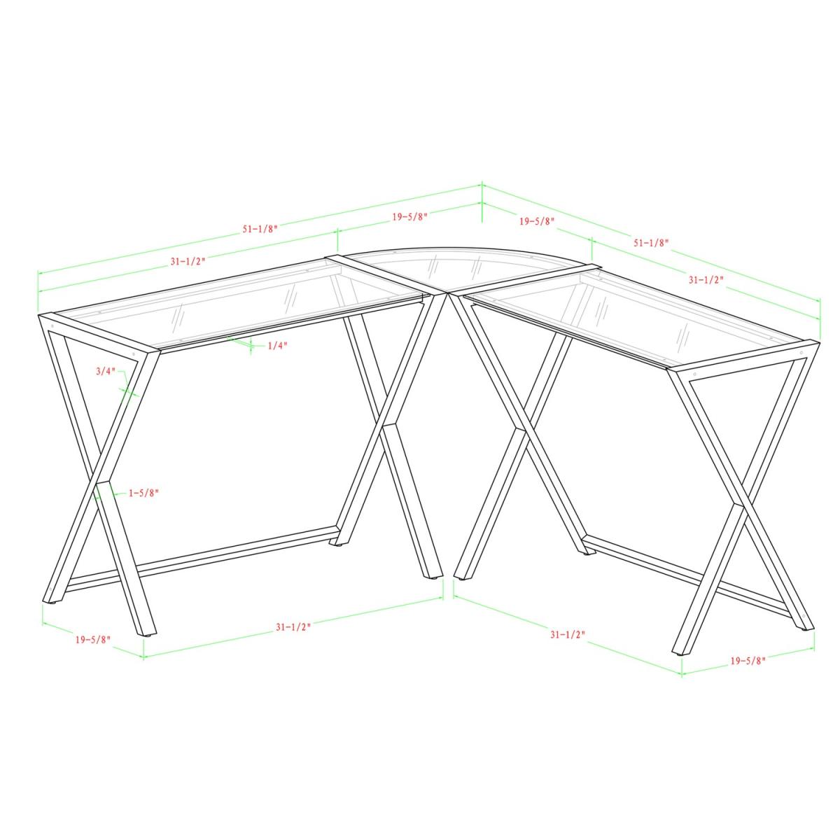 With x-frame designed legs, this versatile l-shaped desk gives a modern feel to your home. Having an angled design made of sturdy, steel metal with a powder coated finish with a tempered glass top, this contemporary desk can fit in just about any corner space, from your home office to your living room. Decorate with vases and framed family pictures, while using it to write on or to work on your computer.