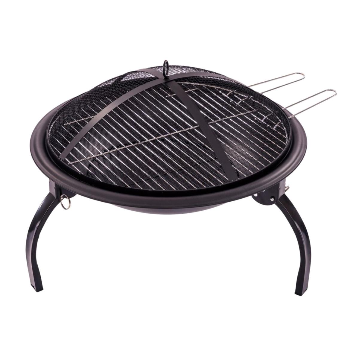 Be the envy of your neighbours this summer with our sleek and stylish folding firepit. Ideal for small patios or gardens, this firepit is made of durable steel with a high temperature black paint finish. It features a large 47.5cm chrome plated cooking grill allowing you to use it as a BBQ as well as a firepit. The firepit has three folding legs for easy storage and transport making it ideal to take along with you on camping trips and days out on the beach. The firepit also features a mesh lid, charcoal grill and includes a poker.
