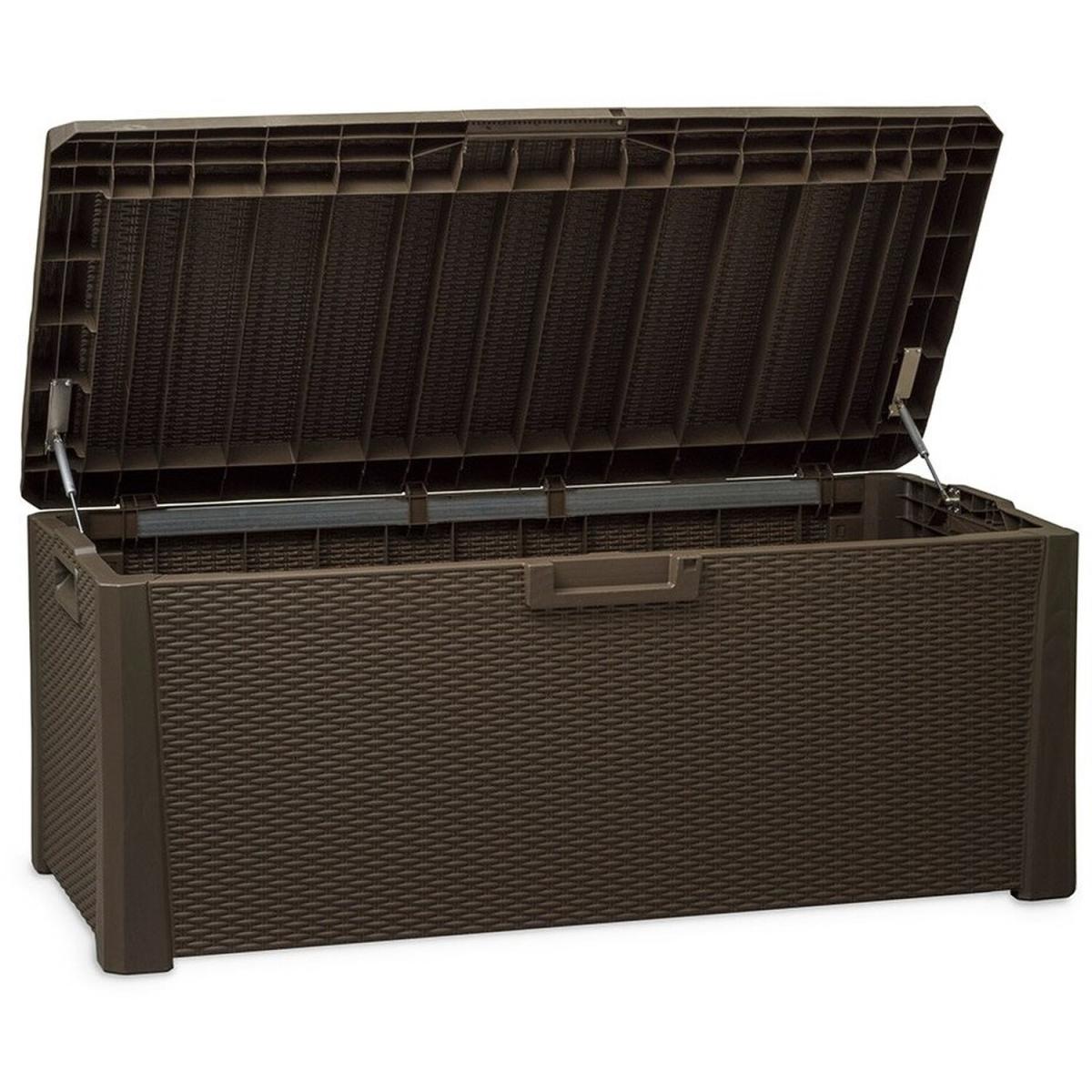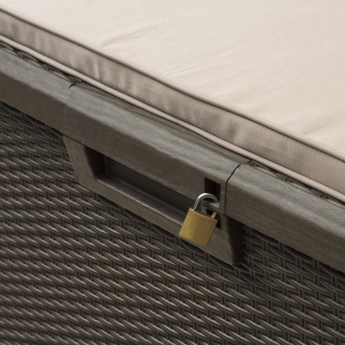 Huge 550 Litre plastic garden storage chest in a brown Rattan effect with a padded, removable cushion for the lid to make a comfortable seat. Suitable for indoor or outdoor use. Made from sturdy weatherproof plastic. Features a hinged lid with gas lift arms which can be locked with a padlock (not supplied).