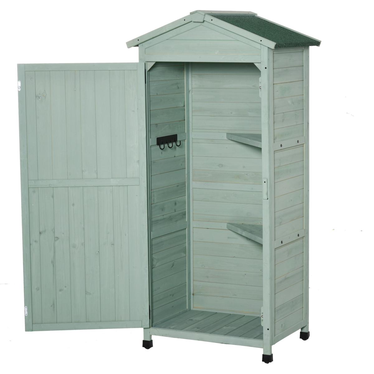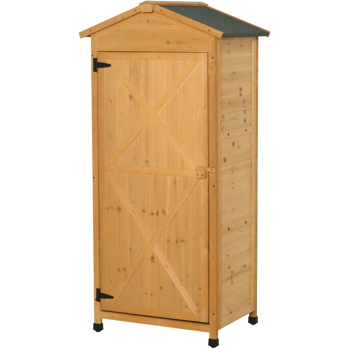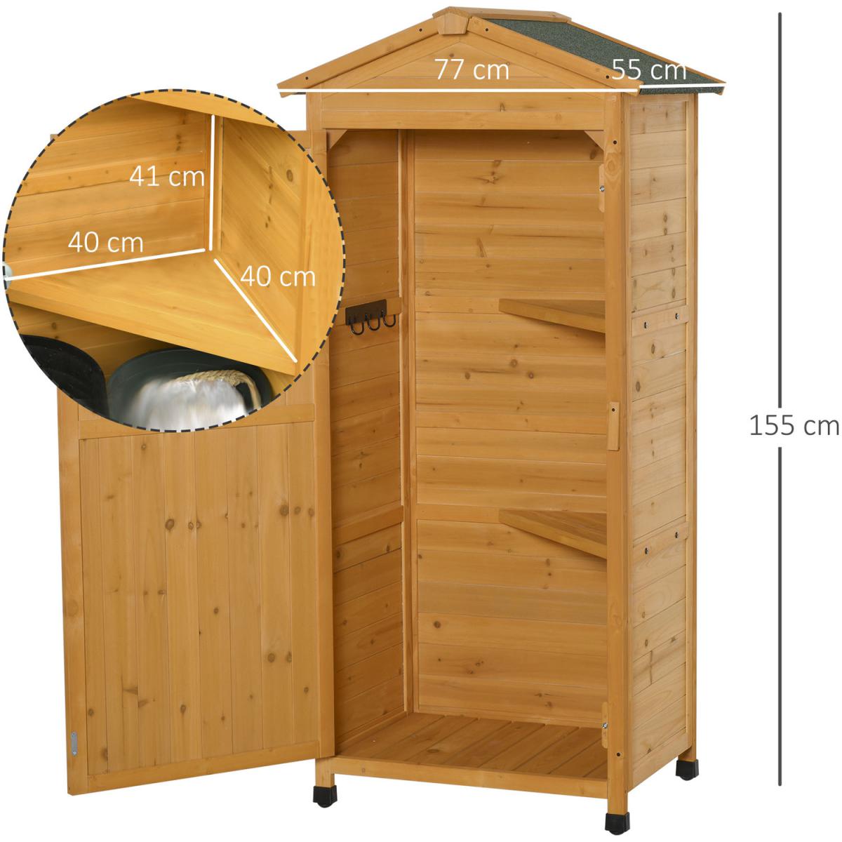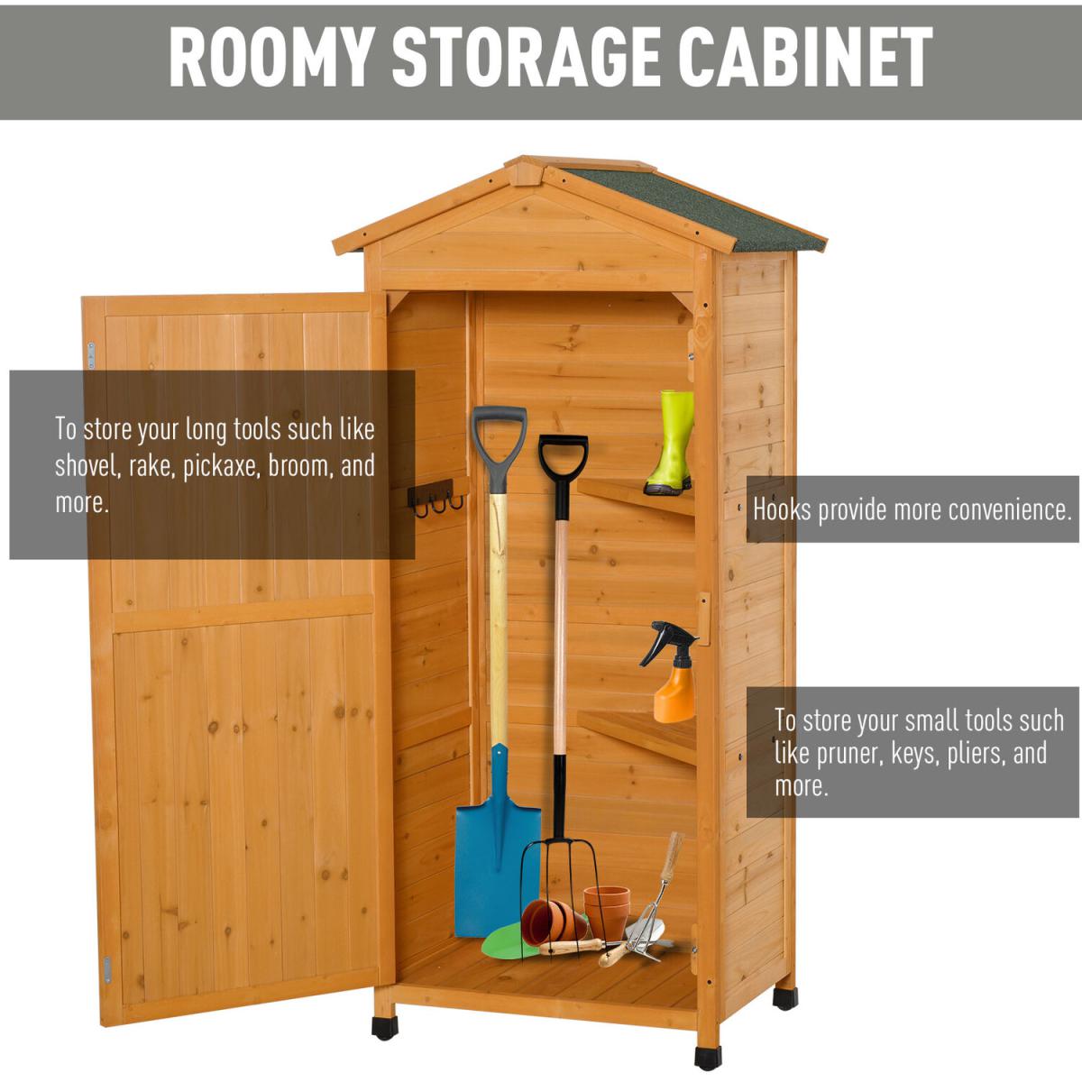 Reclaim garden space with this tall and narrow vertical storage shed from Outsunny. Made from fir wood, this tool cabinet is covered with a coat of protective paint, which helps protect the structure from light to mild weather damage for extra wear. Inside there are two shelves on the right side, creating three levels to organise. Hooks on the left of the outdoor shed for extra hanging space. A sloped roof prevents water build-up, with asphalt covering so liquid doesn't seep through. It's finished with a hinged door with a handle to open easily, with the lock making it secure. A handy piece suitable for all outdoor spaces.