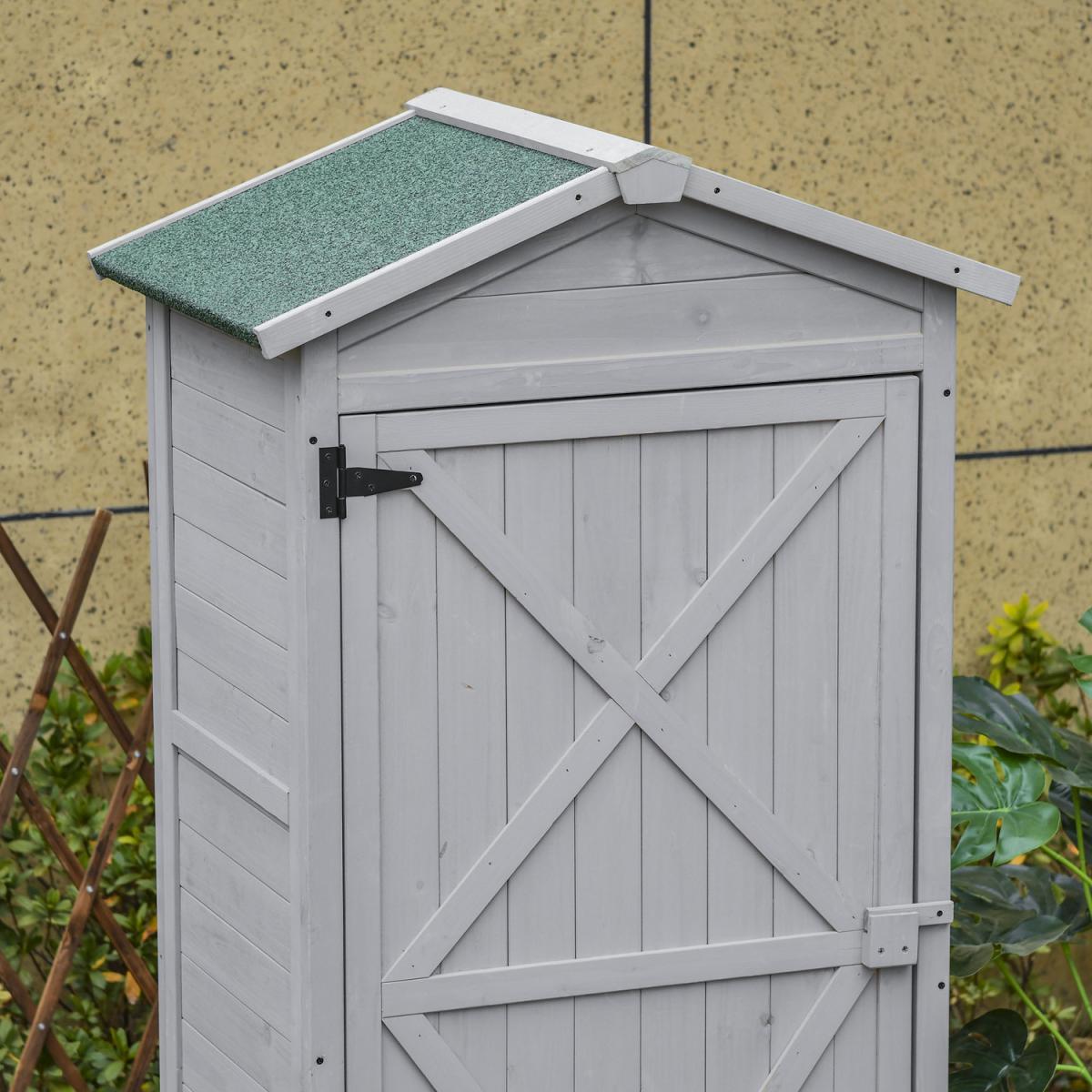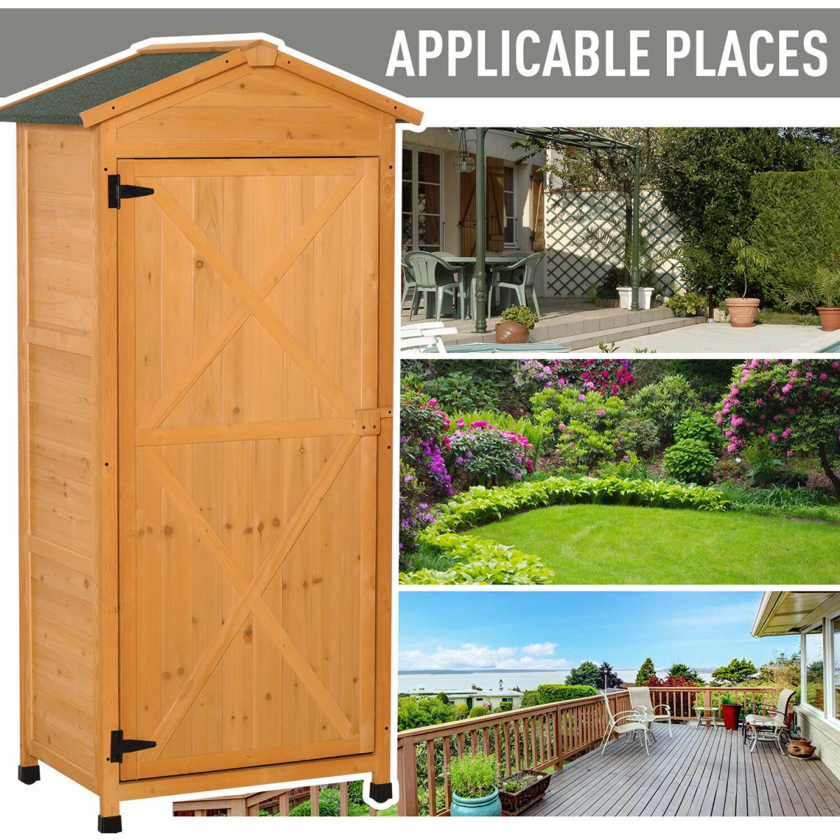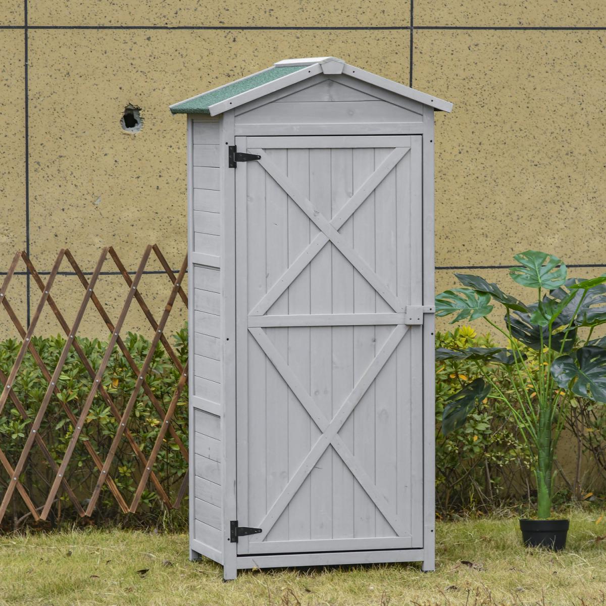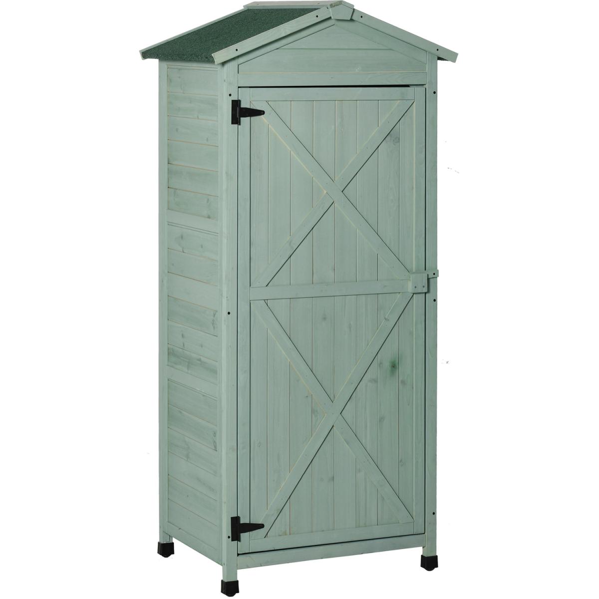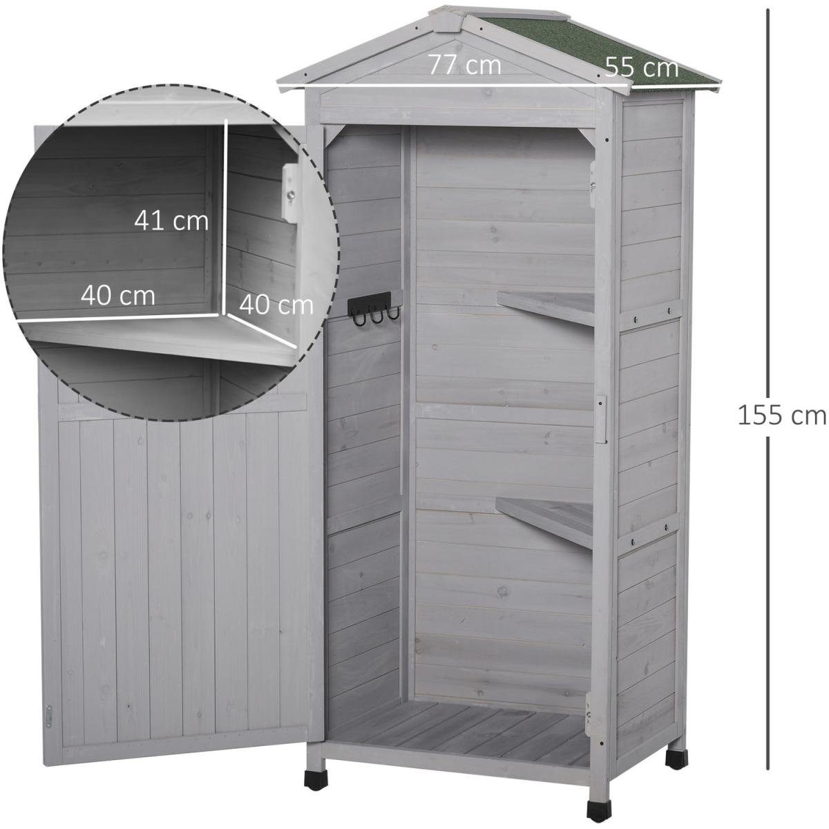 Reclaim garden space with this tall and narrow vertical storage shed from Outsunny. Made from fir wood, this tool cabinet is covered with a coat of protective paint, which helps protect the structure from light to mild weather damage for extra wear. Inside there are two shelves on the right side, creating three levels to organise. Hooks on the left of the outdoor shed for extra hanging space. A sloped roof prevents water build-up, with asphalt covering so liquid doesn't seep through. It's finished with a hinged door with a handle to open easily, with the lock making it secure. A handy piece suitable for all outdoor spaces.