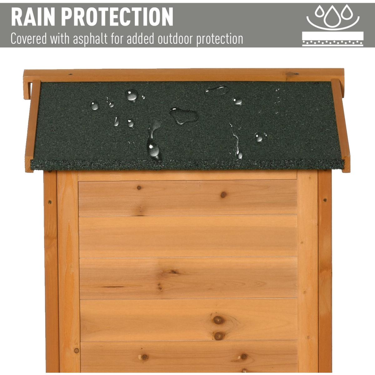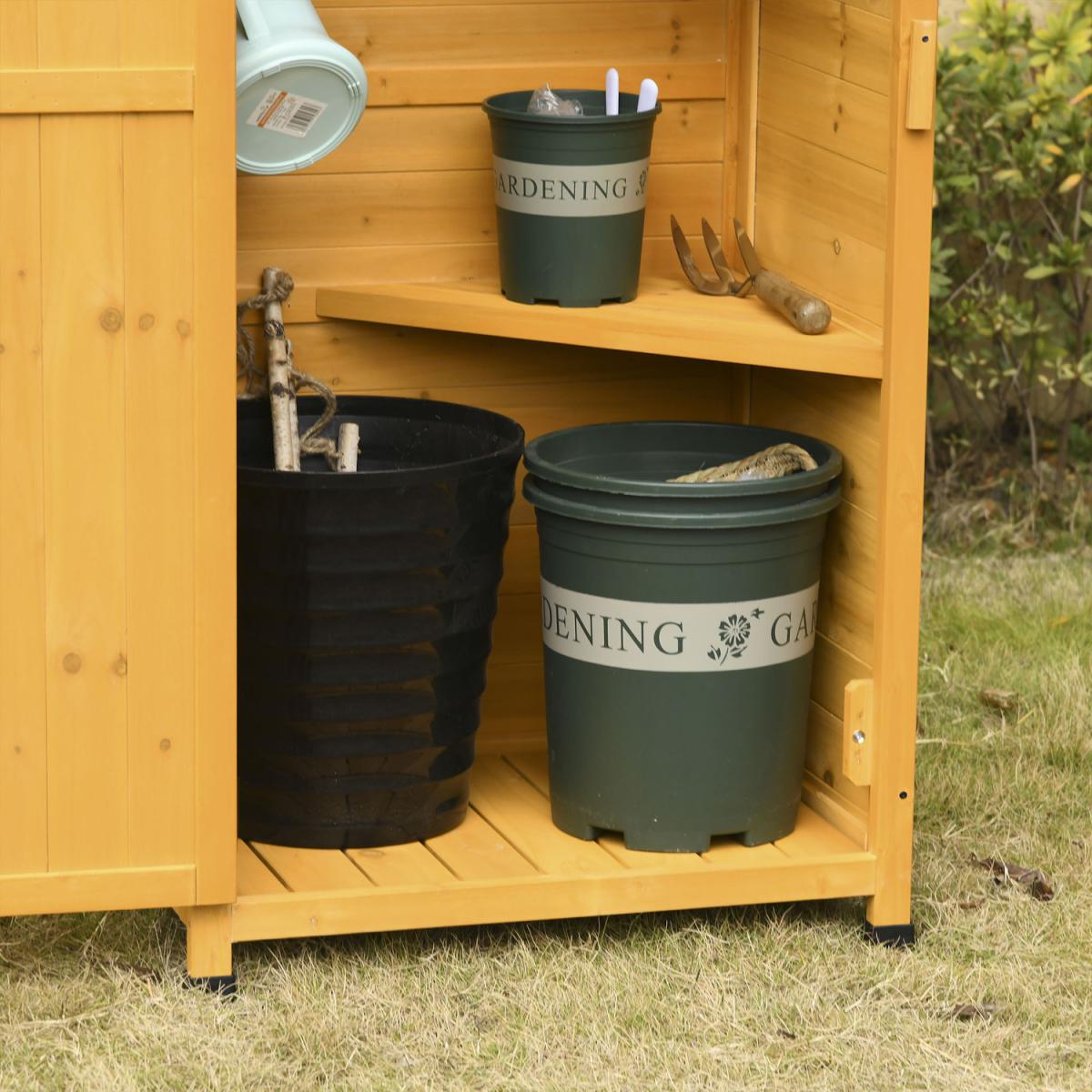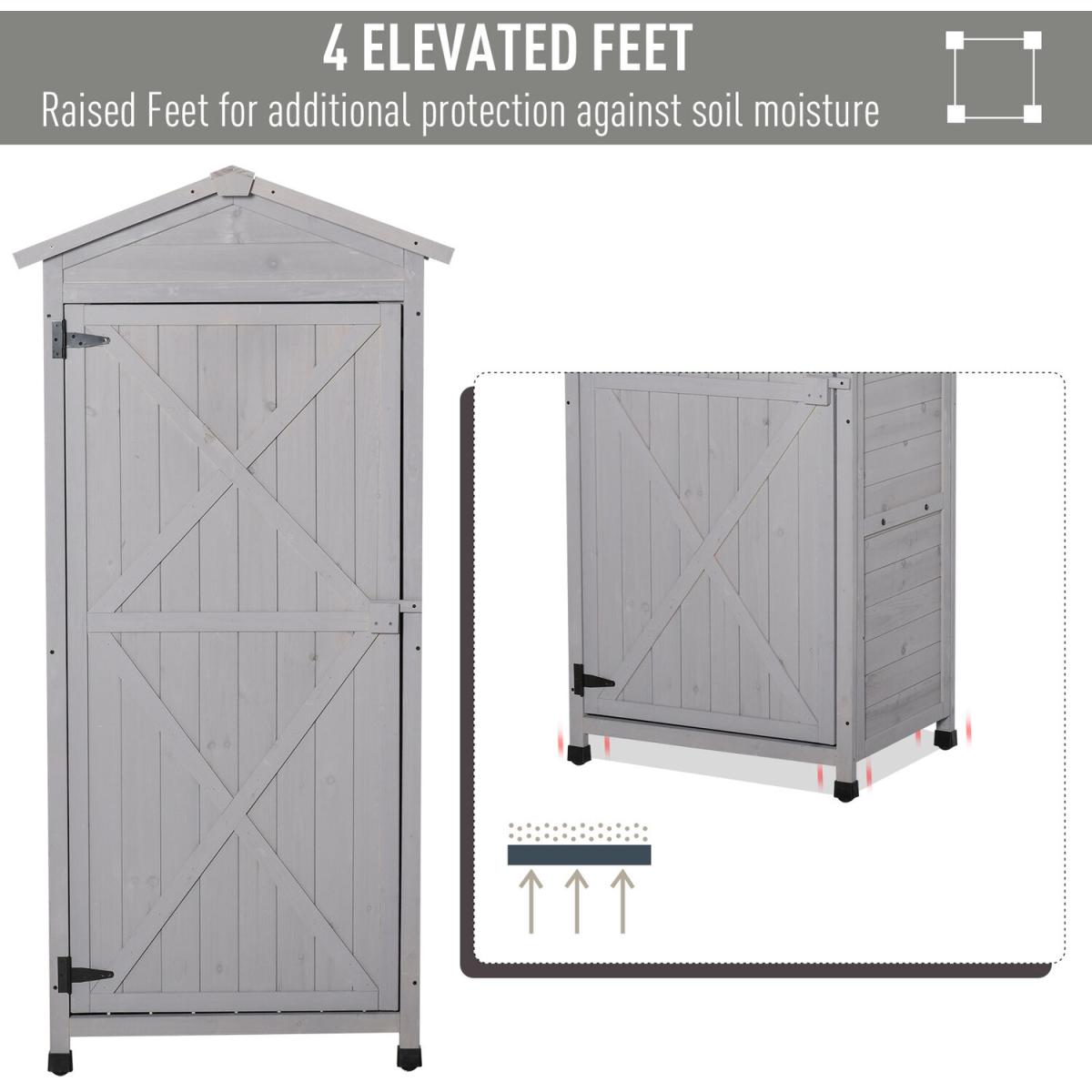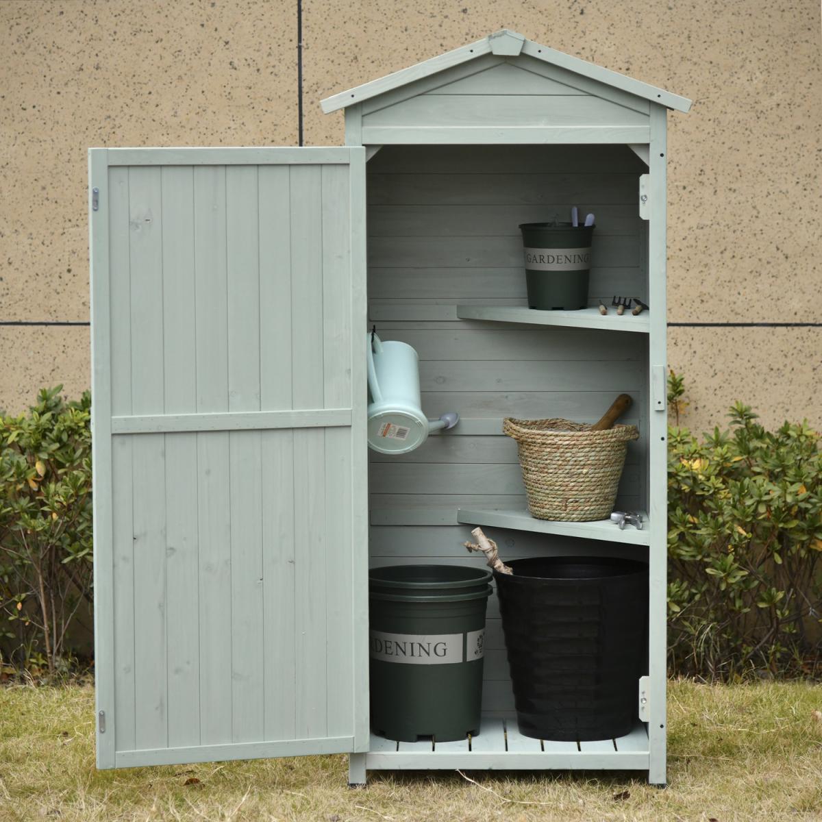 Reclaim garden space with this tall and narrow vertical storage shed from Outsunny. Made from fir wood, this tool cabinet is covered with a coat of protective paint, which helps protect the structure from light to mild weather damage for extra wear. Inside there are two shelves on the right side, creating three levels to organise. Hooks on the left of the outdoor shed for extra hanging space. A sloped roof prevents water build-up, with asphalt covering so liquid doesn't seep through. It's finished with a hinged door with a handle to open easily, with the lock making it secure. A handy piece suitable for all outdoor spaces.