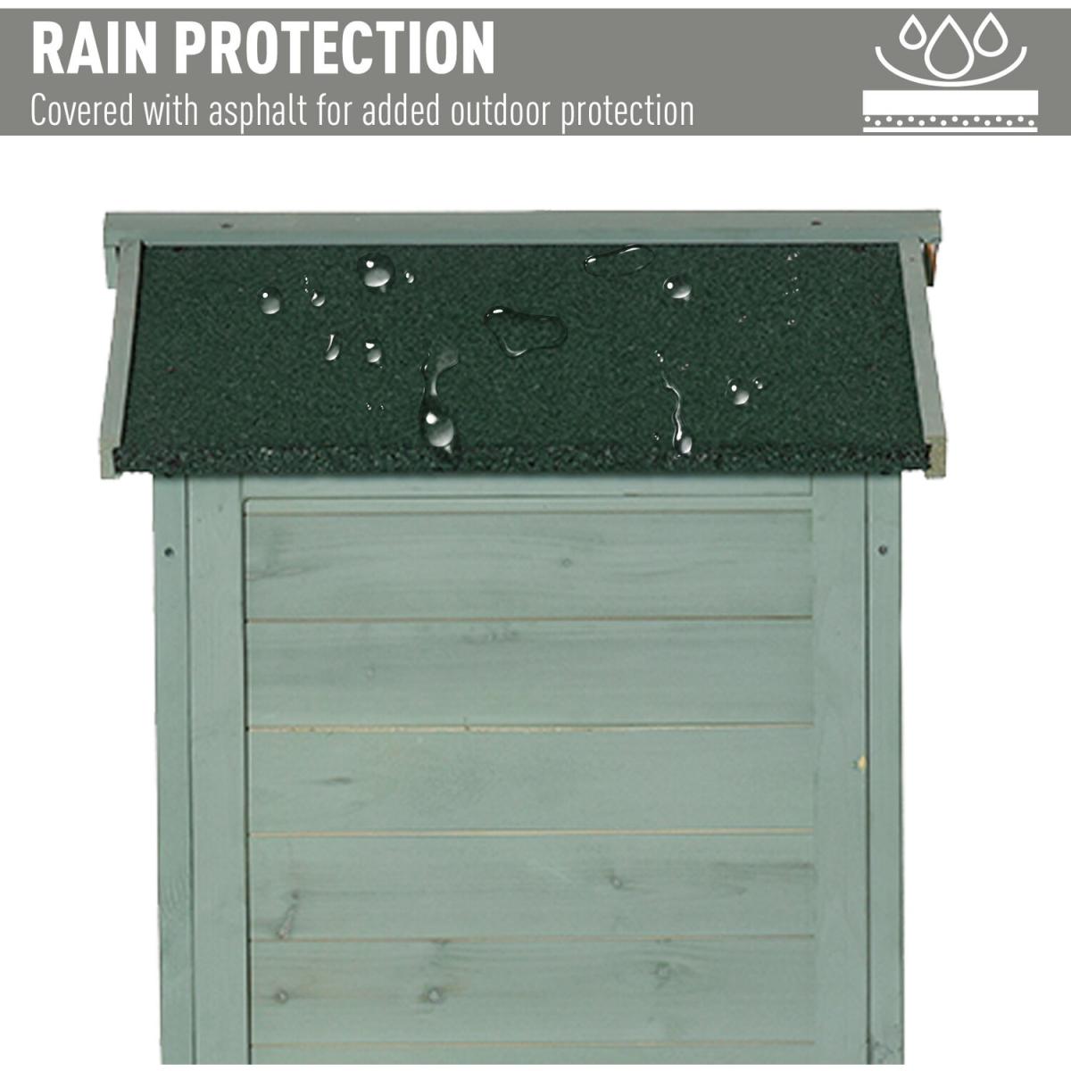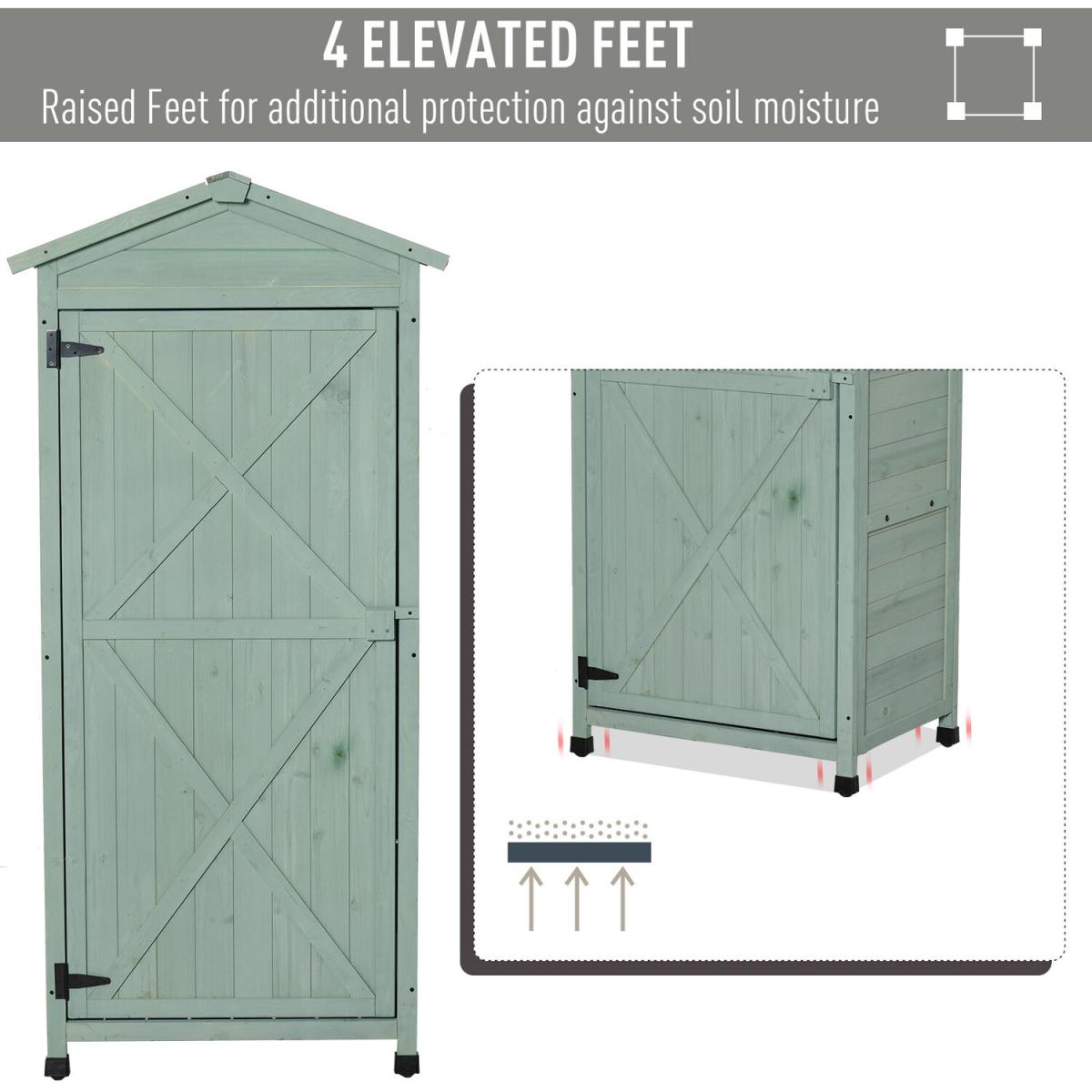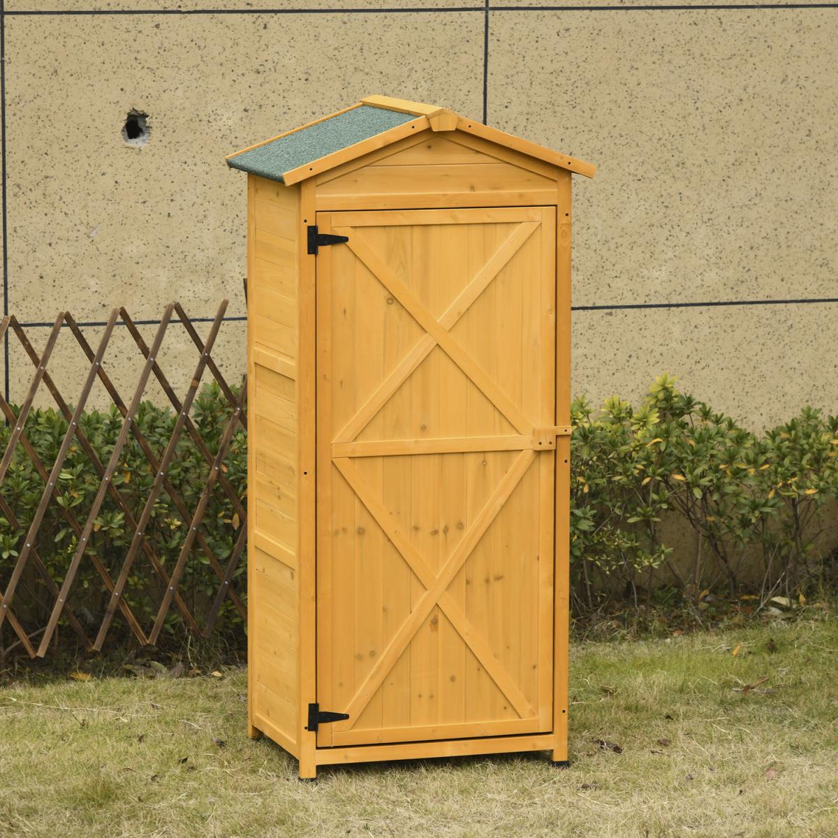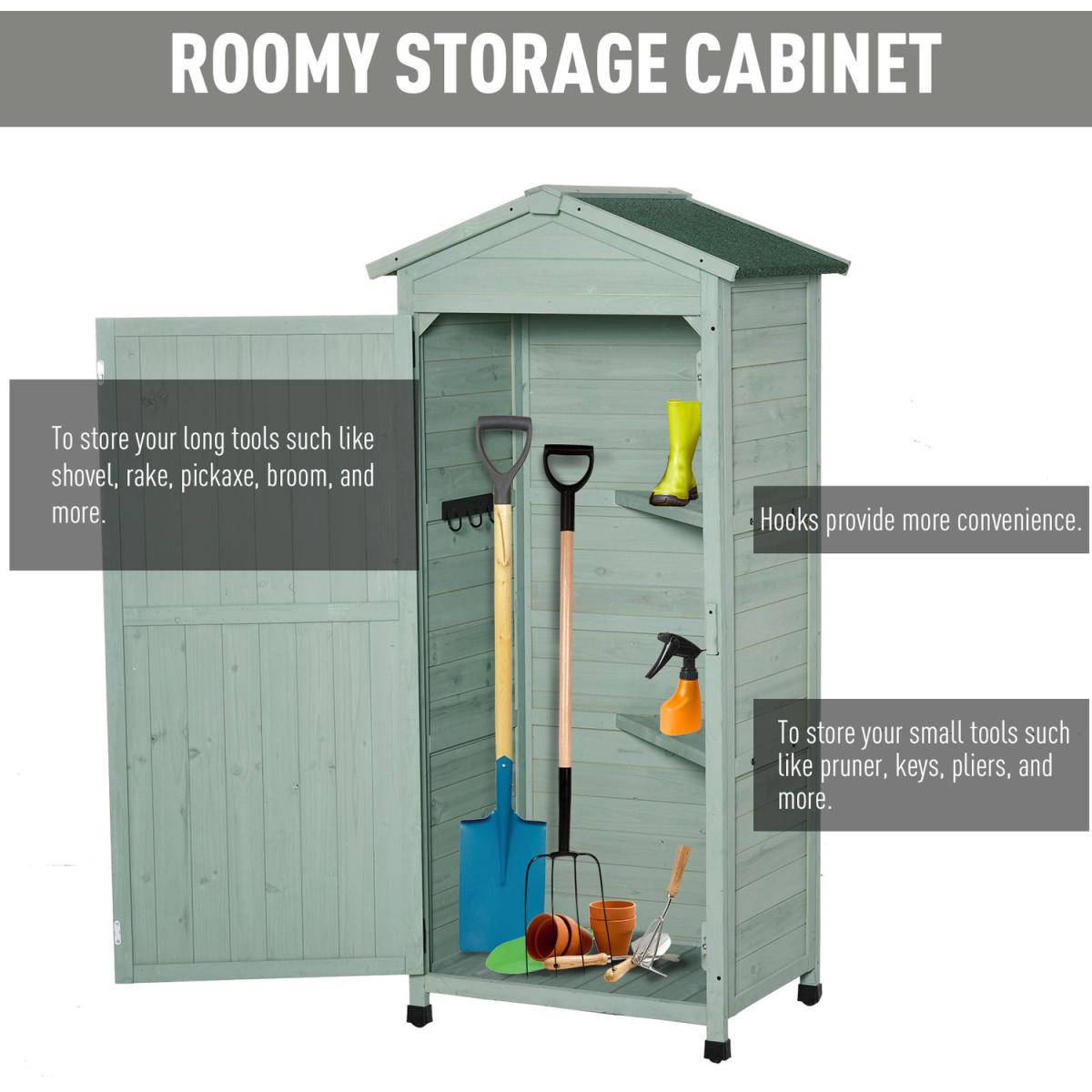 Reclaim garden space with this tall and narrow vertical storage shed from Outsunny. Made from fir wood, this tool cabinet is covered with a coat of protective paint, which helps protect the structure from light to mild weather damage for extra wear. Inside there are two shelves on the right side, creating three levels to organise. Hooks on the left of the outdoor shed for extra hanging space. A sloped roof prevents water build-up, with asphalt covering so liquid doesn't seep through. It's finished with a hinged door with a handle to open easily, with the lock making it secure. A handy piece suitable for all outdoor spaces.