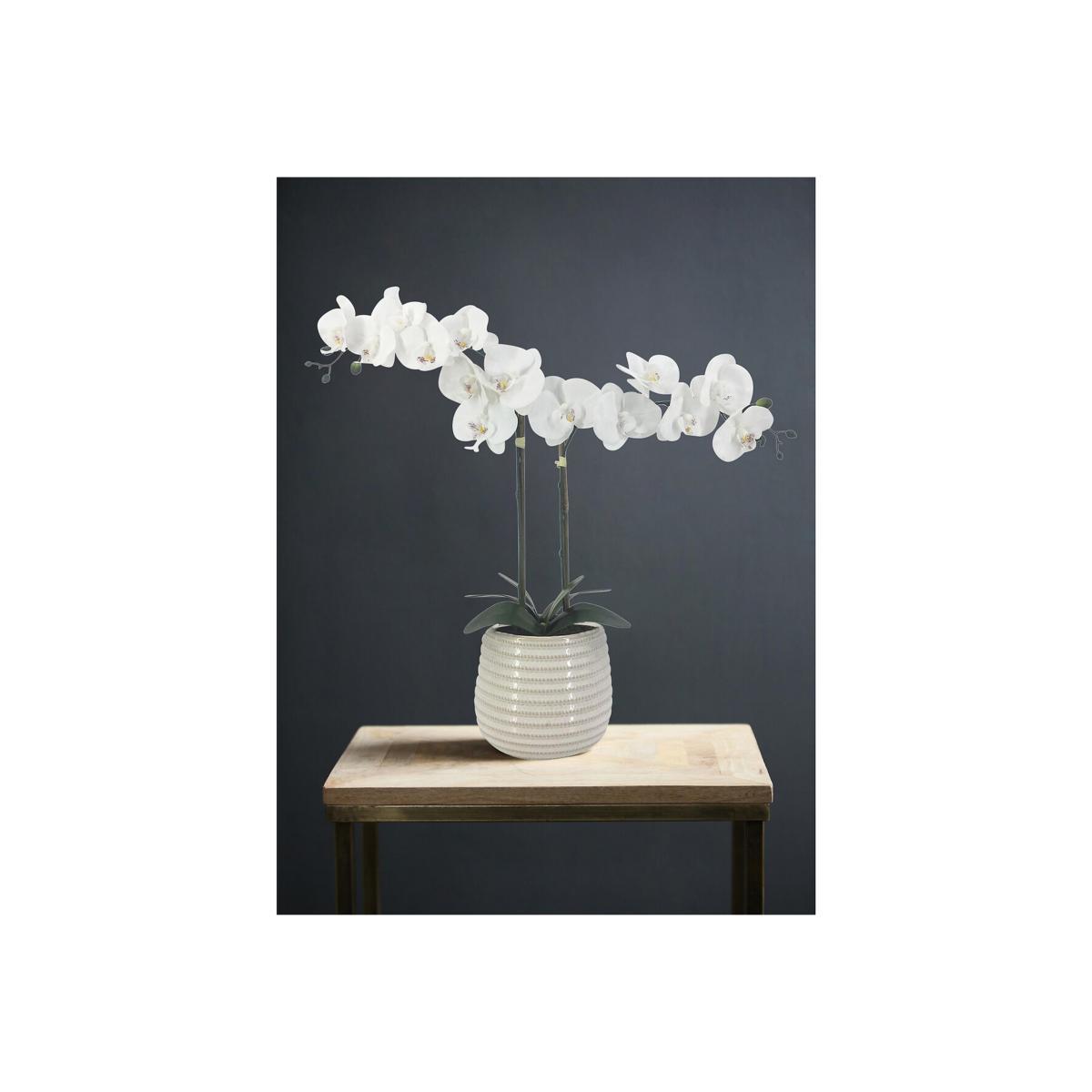This product will be dispatched by one of our trusted suppliers. You’ll be contacted by their selected courier about your delivery. Brighten up your home with this beautiful white faux double orchid in a ribbed ceramic pot. Realistic in look and touch, it will add a touch of charm to any room without the burden of a real plant.