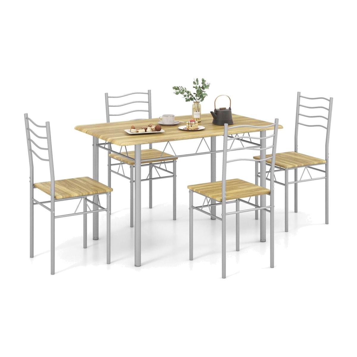 Our dining table set includes a dining table and 4 chairs, which is suitable for enjoying a joyful meal time with your family and friends together. Constructed with a sturdy steel frame and wood-look tabletop, this kitchen set has great load capacity and stability. Since the smooth surface, it is easy to clean after dinner with a damp cloth. Besides, the stylish outlook can decorate your home better and offer you a comfortable sitting experience.