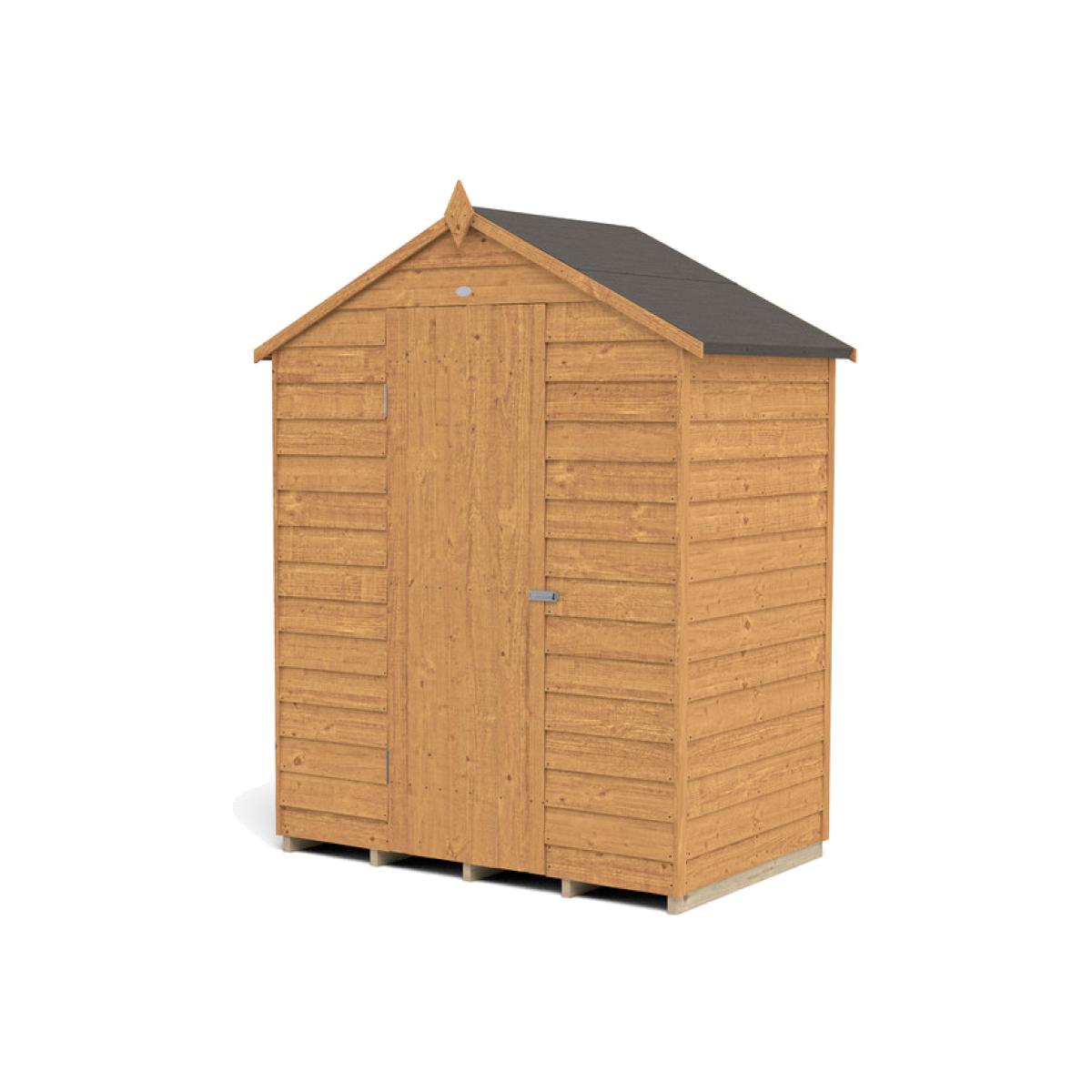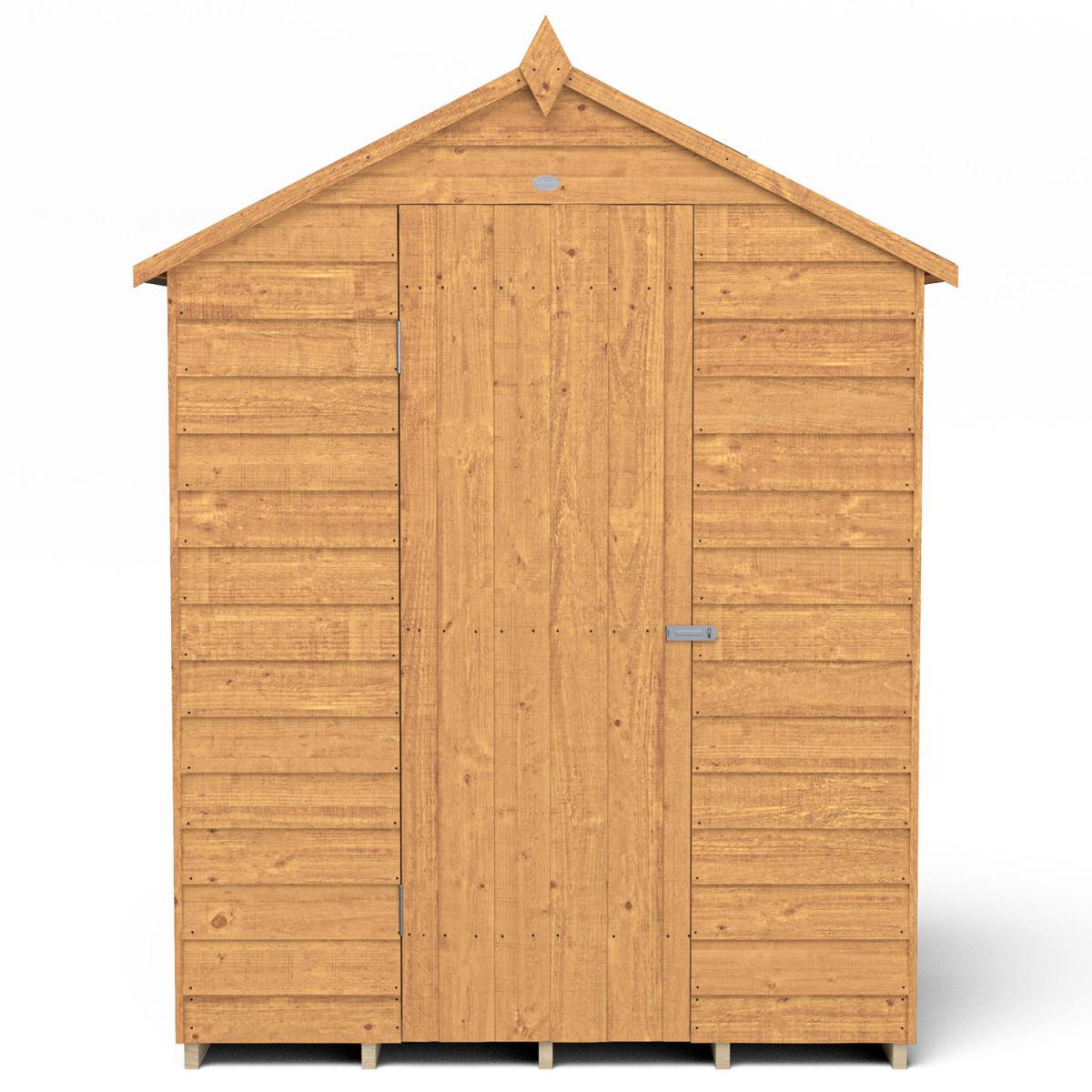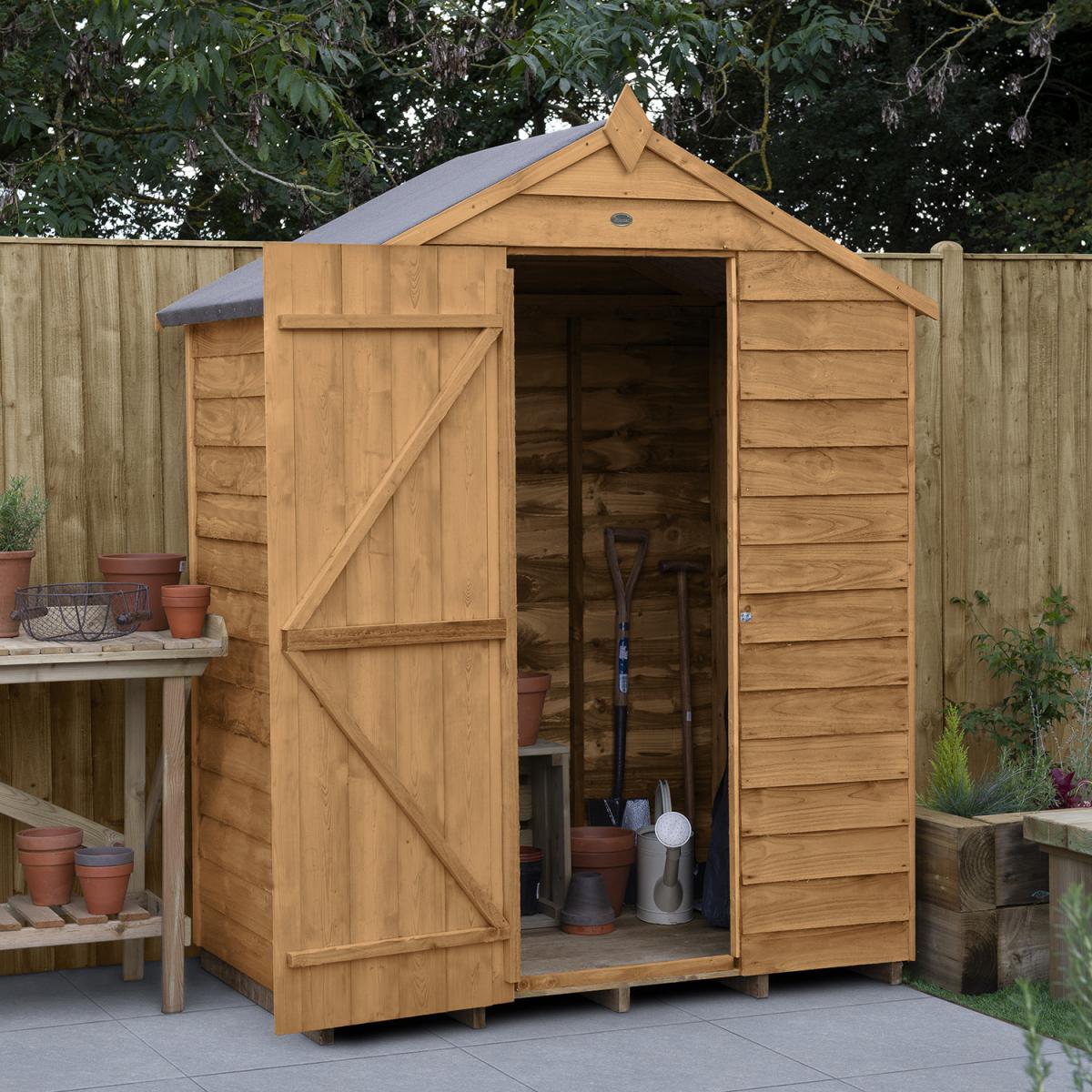 The Overlap Dip Treated Apex Shed is an ideal storage place for all your garden equipment. With a classic apex roof, generous headroom, and final decorative touches, this shed is ideal will look brilliant in your garden. It's ideal for garden machinery and tools, bikes, kids' outdoor toys, and much more, helping you keep all your outdoor equipment well stored and safe. The shed features a diamond finial at the peak of the roof, helping to add more height, and the natural wood grain throughout will help this shed fit in with any natural garden. With a lovely and vibrant golden brown colour from the dip treatment, finished with the black sand felt roof, this shed won't only be a great storage place, but help to bring a stylish as well. Constructed using dip treated timber, this shed will stay strong and durable for years to come. It is resistant to rot and fungal infections, and the overlap design of the timber boards allows for natural movement of the timber during changing weather conditions and aid in water run-off. With increased framing to give the building a stronger construction, the shed comes with a solid timber floor, which is much hardier than more common OSB, making it ideal for storing heavier gardening equipment. The shed also comes with hidden security measures, featuring anti-tamper hinges that can't be seen or accessed from the outside, as well as a hasp and staple latch that allows you to padlock the door. Installation by a team of professionals is available for an extra yet affordable price, and all fittings and fixtures are included with this shed, as well as easy-to-follow instructions are included for any DIY hobbyists who want to really make this shed their own by building it themselves.