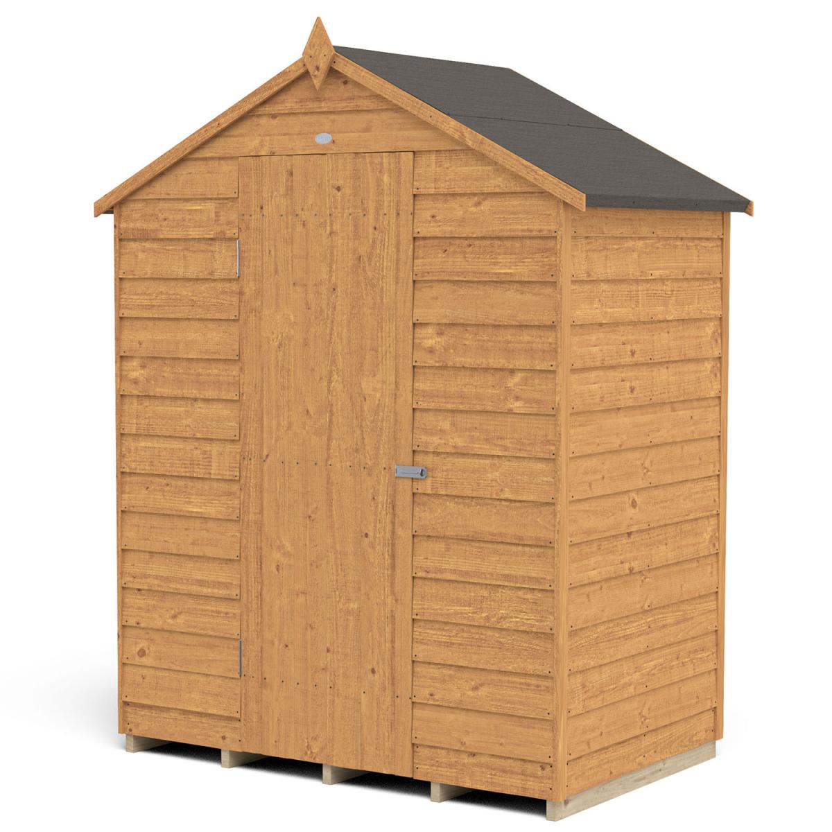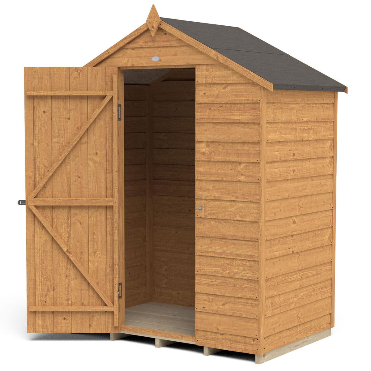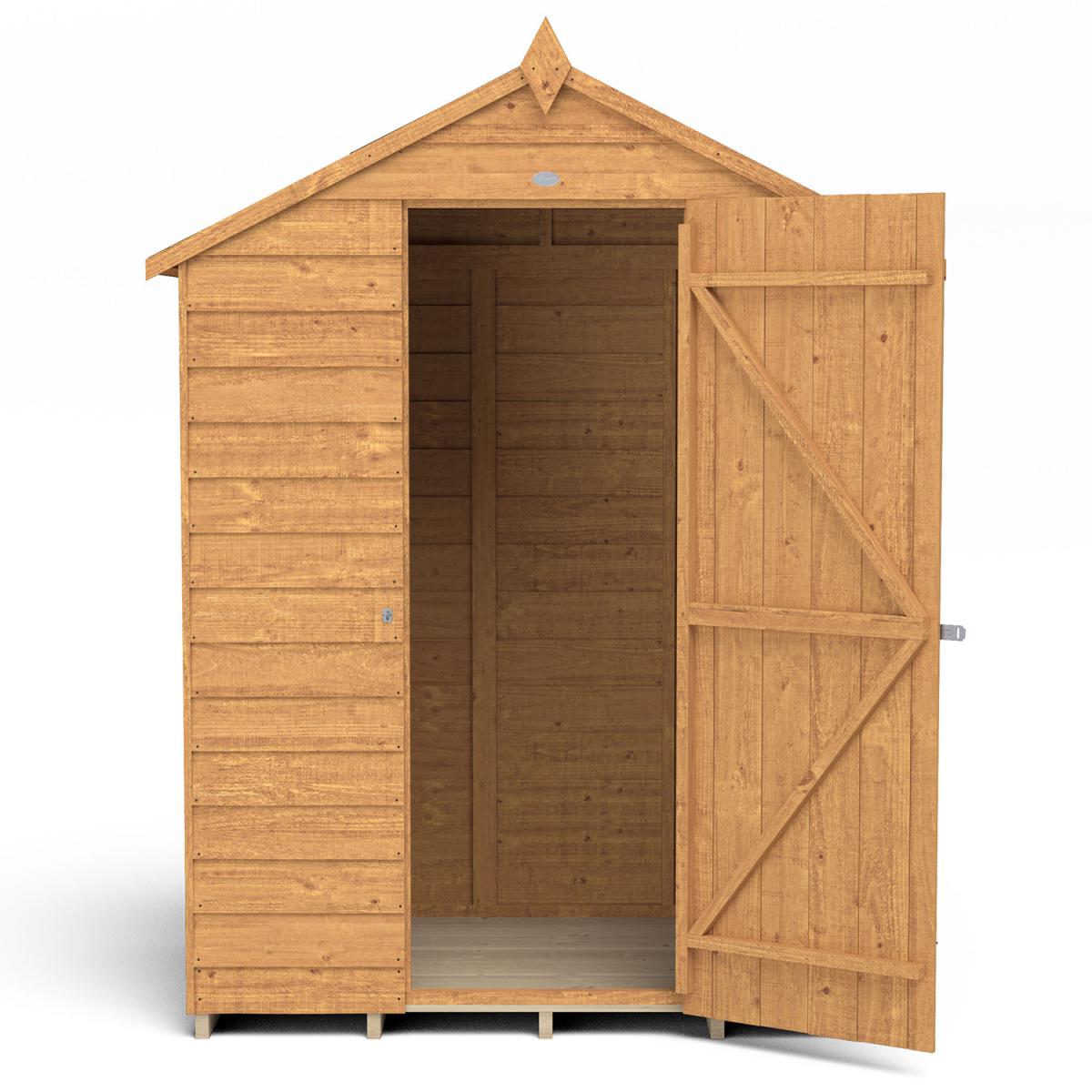 The Overlap Dip Treated Apex Shed is an ideal storage place for all your garden equipment. With a classic apex roof, generous headroom, and final decorative touches, this shed is ideal will look brilliant in your garden. It's ideal for garden machinery and tools, bikes, kids' outdoor toys, and much more, helping you keep all your outdoor equipment well stored and safe. The shed features a diamond finial at the peak of the roof, helping to add more height, and the natural wood grain throughout will help this shed fit in with any natural garden. With a lovely and vibrant golden brown colour from the dip treatment, finished with the black sand felt roof, this shed won't only be a great storage place, but help to bring a stylish as well. Constructed using dip treated timber, this shed will stay strong and durable for years to come. It is resistant to rot and fungal infections, and the overlap design of the timber boards allows for natural movement of the timber during changing weather conditions and aid in water run-off. With increased framing to give the building a stronger construction, the shed comes with a solid timber floor, which is much hardier than more common OSB, making it ideal for storing heavier gardening equipment. The shed also comes with hidden security measures, featuring anti-tamper hinges that can't be seen or accessed from the outside, as well as a hasp and staple latch that allows you to padlock the door. Installation by a team of professionals is available for an extra yet affordable price, and all fittings and fixtures are included with this shed, as well as easy-to-follow instructions are included for any DIY hobbyists who want to really make this shed their own by building it themselves.