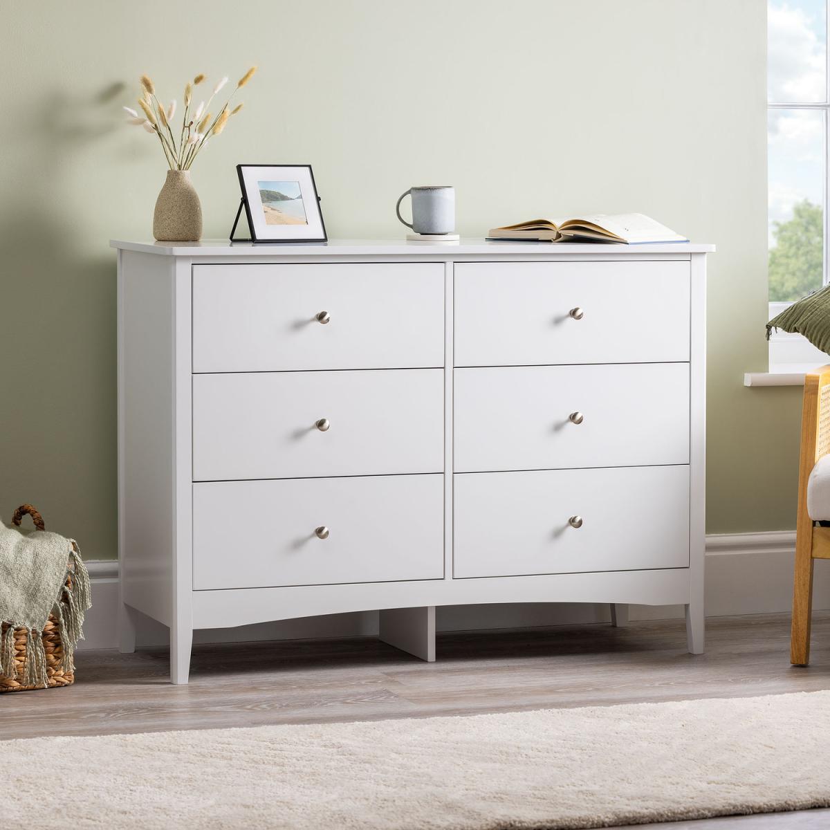 The Islington 6 Drawer Chest of Drawers combines a clean, classing look with modern functionality. Sleek and stylish with 6 drawers to easily organise clothes and essentials. It's a perfect size for most rooms. Not only does it look fantastic in a bedroom, but it offers ideal storage for a living room or hallway, too. Made from premium-quality MDF for optimal strength and stability. Finished with UV lacquer paint for a silky satin finish. Plus, easy to wipe clean without risk of discolouring or peeling. Painted to complement colour schemes, as well as traditional and modern settings. Perfect for adding a soft, light feel to darker rooms or pairing with lighter decor.