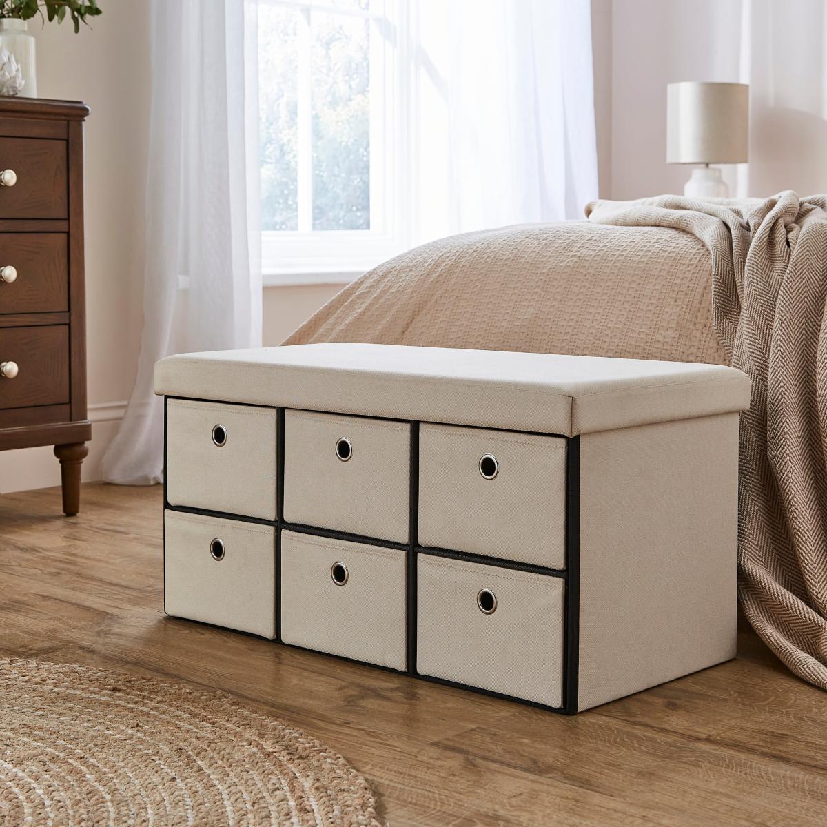 * Includes 6 draws* Available in multiple colours* Made from polyester Assemble this faux linen ottoman in seconds, no tools required. It doubles as a seat, storage box, or footrest, providing a sleek and practical solution for your space.