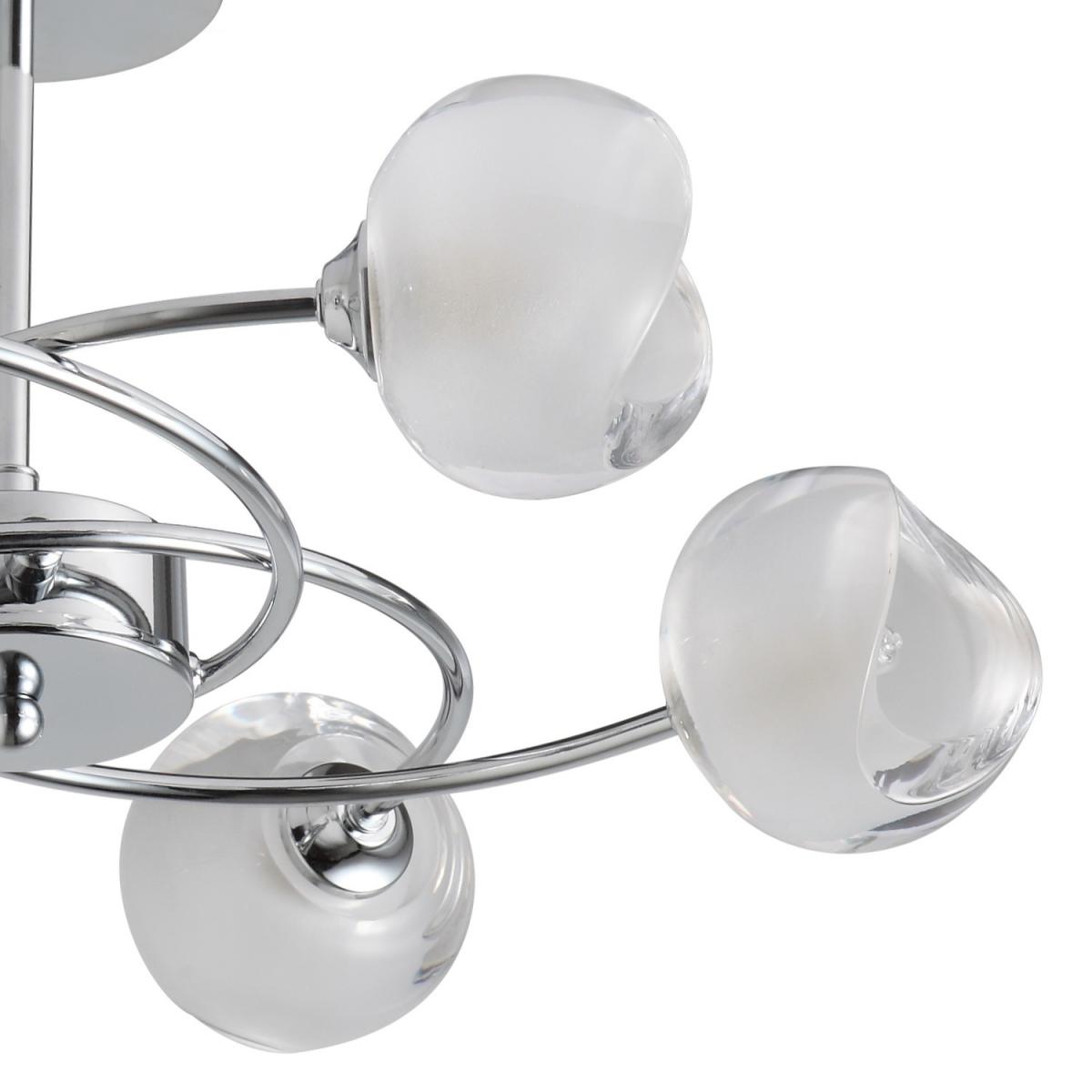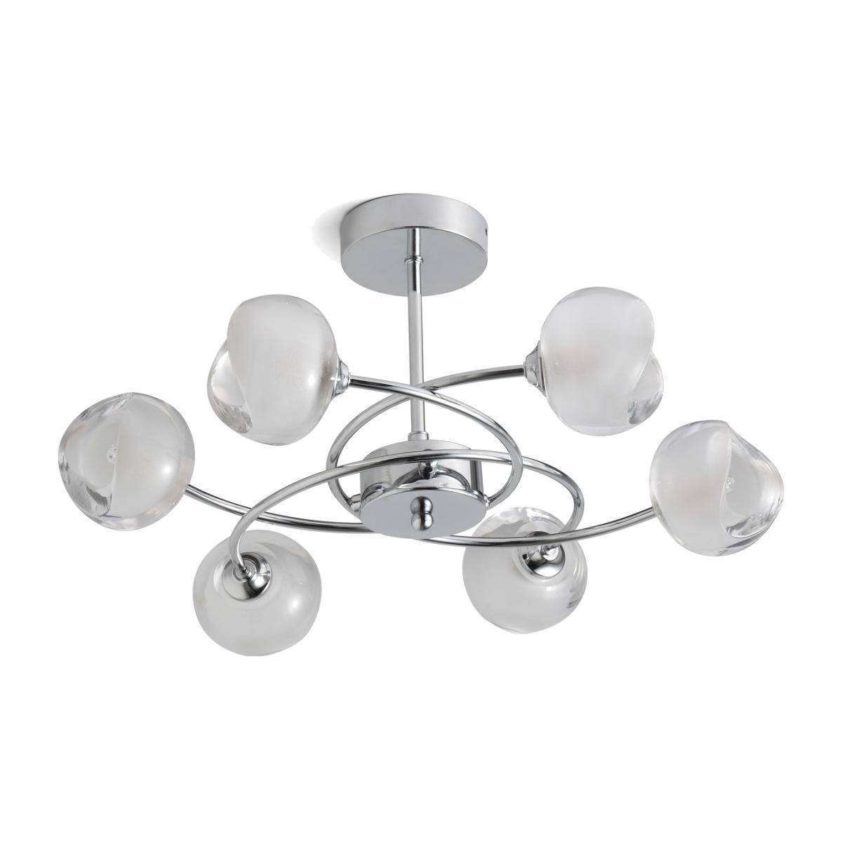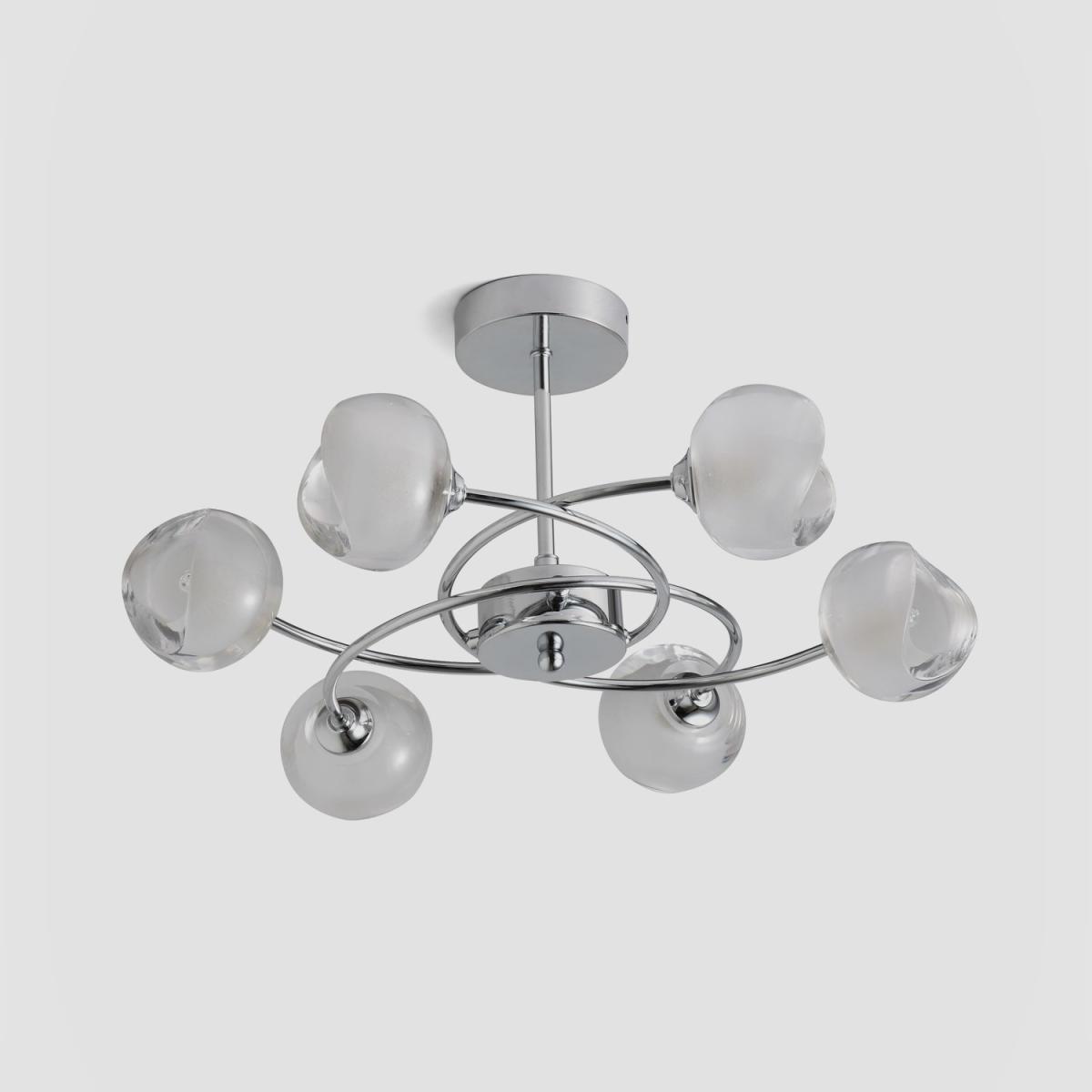 Features we love It's an ideal ceiling light for usage in living rooms bedrooms or hallways with low ceilings. Unique curved twisted arm design creates an eye-catching look in both traditional and modern settings. The frosted silver glass shades contrast beautifully with the gleaming chrome finish arms. The combination of glass and metal gives it that premium look All about me. Featuring a gleaming chrome finish and a series of curved twisting arms that hold five frosted glass globes to create a head-turning light fixture. It's completed by a sleek silver finish canopy that brings it all together to ensure the light looks great in bedrooms living rooms and hallways. The semi flush design makes it the perfect lighting solution for rooms with low ceilings. Essential info. Bulb type. G9 Fixture Design. Semi-flush light Number of Lights. 6 Material. Metal and glass LED Compatible. Yes Max Wattage. 28W Bulb Included. No Dimmer compatible. No Fixings included. Yes Dimensions. W55 x H30 x D55 cm Weight. 1.9Kg Colour. Chrome/Silver Warranty. 1 Year..