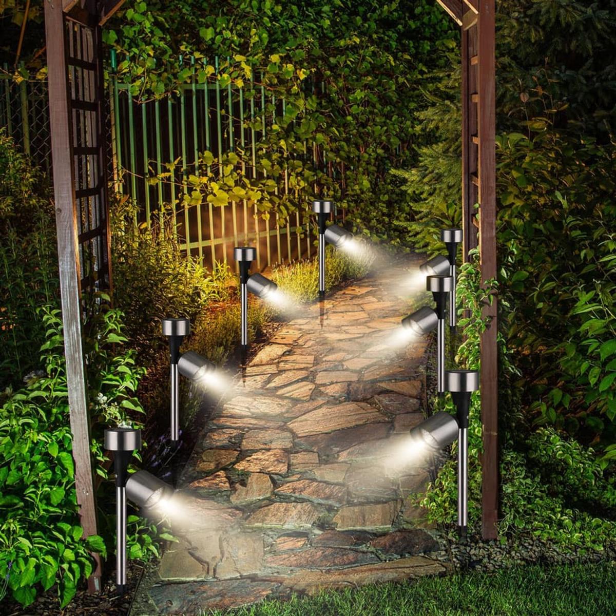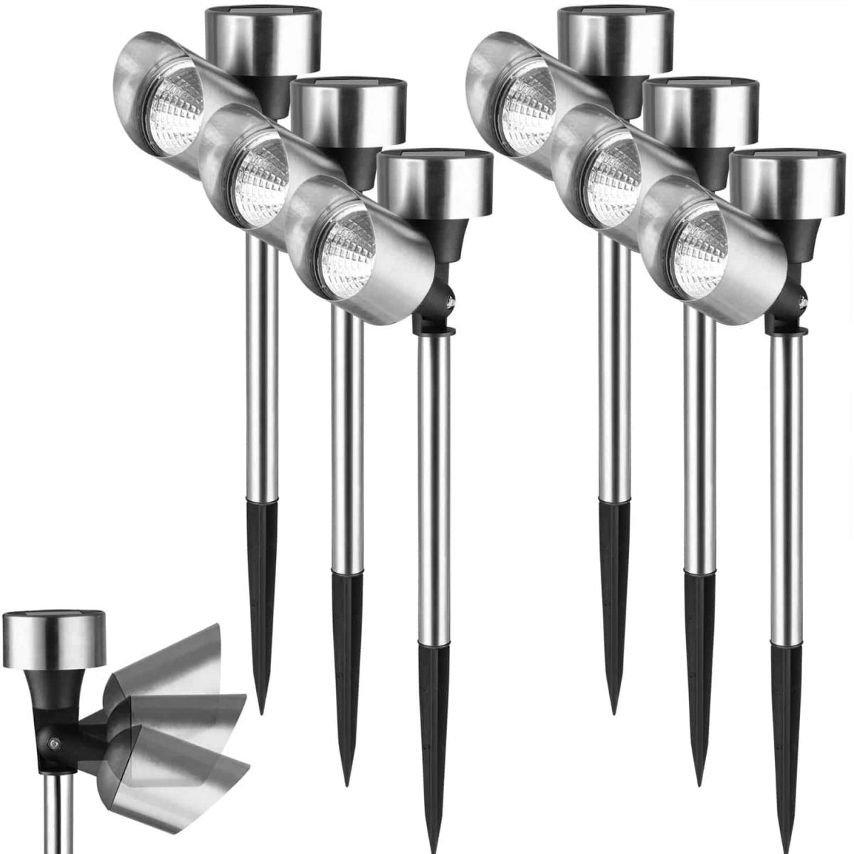Draw attention to your garden. The practical lights with battery and solar panel can be used as orientation lights or for decorative purposes. The LED automatically switchs on at twilight and switches off again when it gets light thanks to the integrated twilight sensor. Depending on light and weather conditions the LED solar lights can give light up to 8h. They have a swivelling light fixture and can be grounded into the soil with a ground spike. Product advantages:Durable high power LEDs. Up to 8h burn time Light body made of stainless steel Battery included. Splash proof Twilight sensor. Swivelling light body 180 Degree. Can be fixed with a ground spike Technical data:Dimensions (Hx. W): 36.5 x 13.5 cm Material: Stainless steel ABSProtection category: IP44 Burn time LED: 8h. Battery: Ni MH 1.2 V, 600 MAScope of delivery:6 x LED Solar light