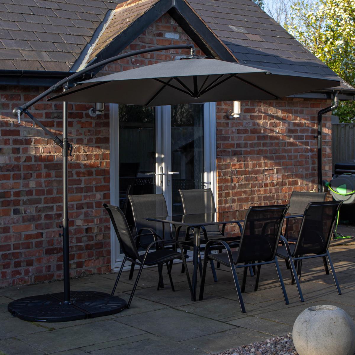 Relax and enjoy your leisure time this summer with this attractive glass top outdoor dining table and 6 chairs set with grey banana parasol and base weights. This stunning set will become the focal point to your garden, terrace or patio area making it ideal for dining on or just enjoying drinks in the summer sun and has space for up to 6 seats. Having an outdoor patio furniture set can greatly enhance your outdoor living space and creates a comfortable and inviting space for you to relax, entertain, and enjoy nature. The set includes a black, rectangular tempered glass top table with 6 chairs, grey banana parasol and parasol base weights. Having a black steel set will blend seamlessly with its surroundings. It adds sophistication and a sleek, modern touch to your patio or garden. The frame of the table and chairs are made from steel and have been finished with a powder coating for added strength and durability. The chairs have a textilene backing and they can easily be stacked on top of each other when not in use for easy and convenient storage. With a grey banana parasol and base weights included, you can shield yourself from the sun. With a 3m canopy, this parasol is designed to provide ample coverage allowing you to stay cool, comfortable and protected in your outdoor space. This garden parasol offers a sleek and modern design with it's grey canopy which will add that touch of sophistication to any outdoor setting. Wind the crank handle to open and close the umbrella for a smooth and easy to use experience. Simply, fill each base weight with sand or water to keep your parasol in place whilst in use. Secure the weights with the included metal clips. The set is supplied flat packed and self assembly is required.