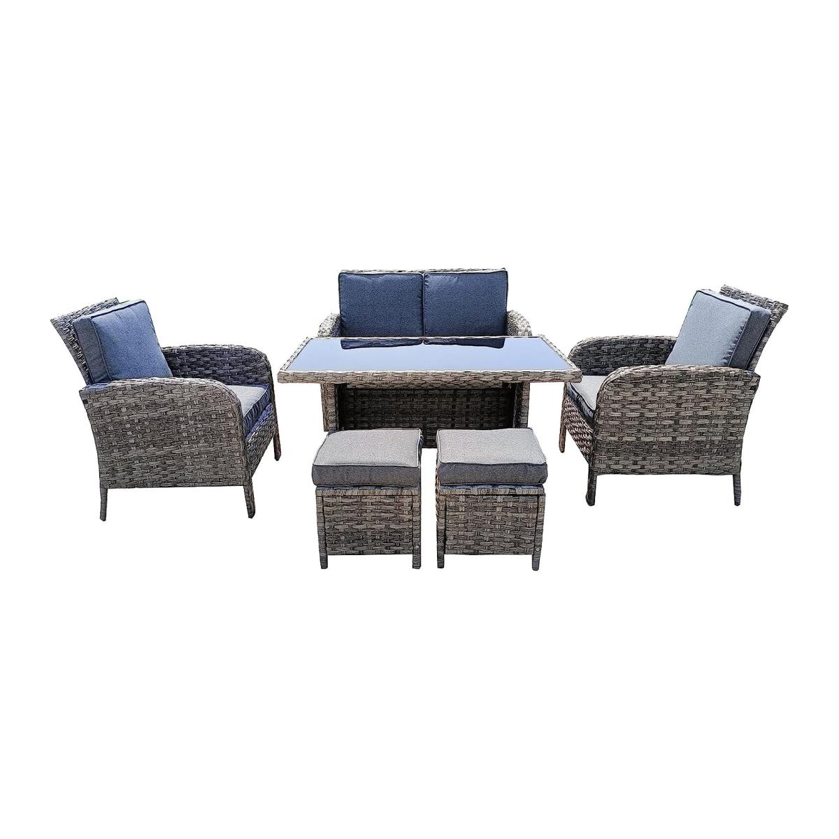 Our six-piece outdoor furniture set brings indoor comforts outside. Everything is all in a place a loveseat, two chairs, a pair of ottoman footrests and a long faux wood dining table. Enjoy the perks of home, like tilted backrests and soft cushions in the great outdoors. Make memories eating and laughing with friends when you invest in an outdoor dining space. Made of water-resistant handwoven PE rattan, this set was made with outdoor in mind. Get inside out with Furniture One. 6 Pieces Patio Dining Set Rattan Furniture Set with Cushions - Grey