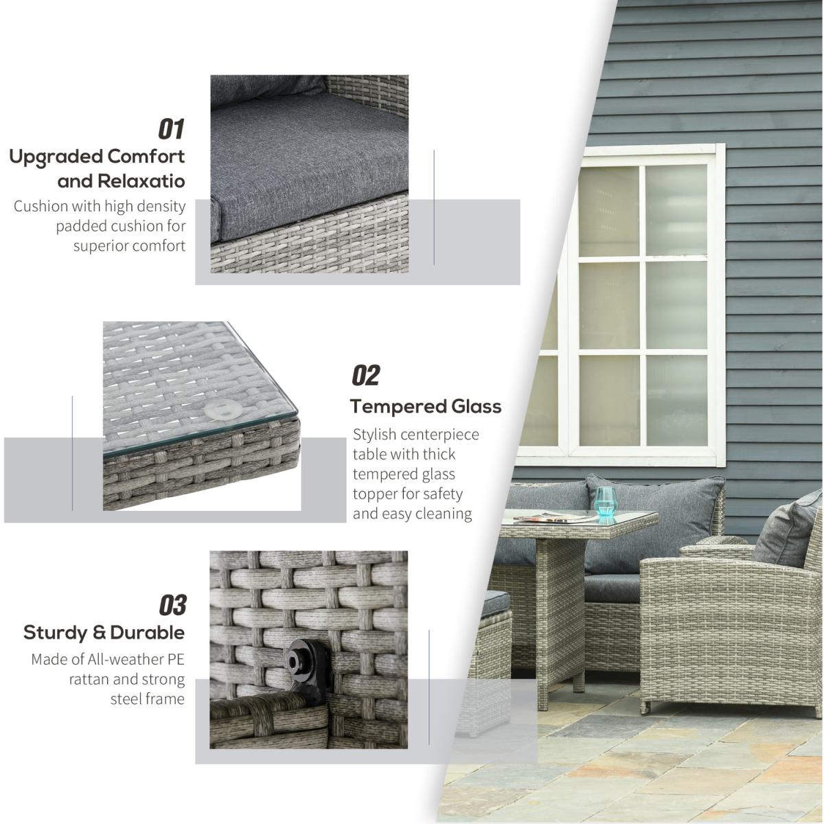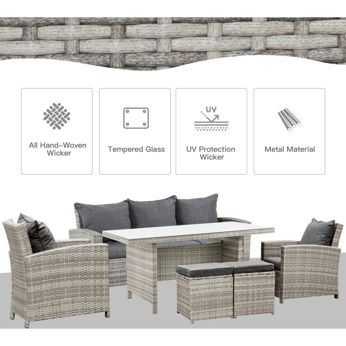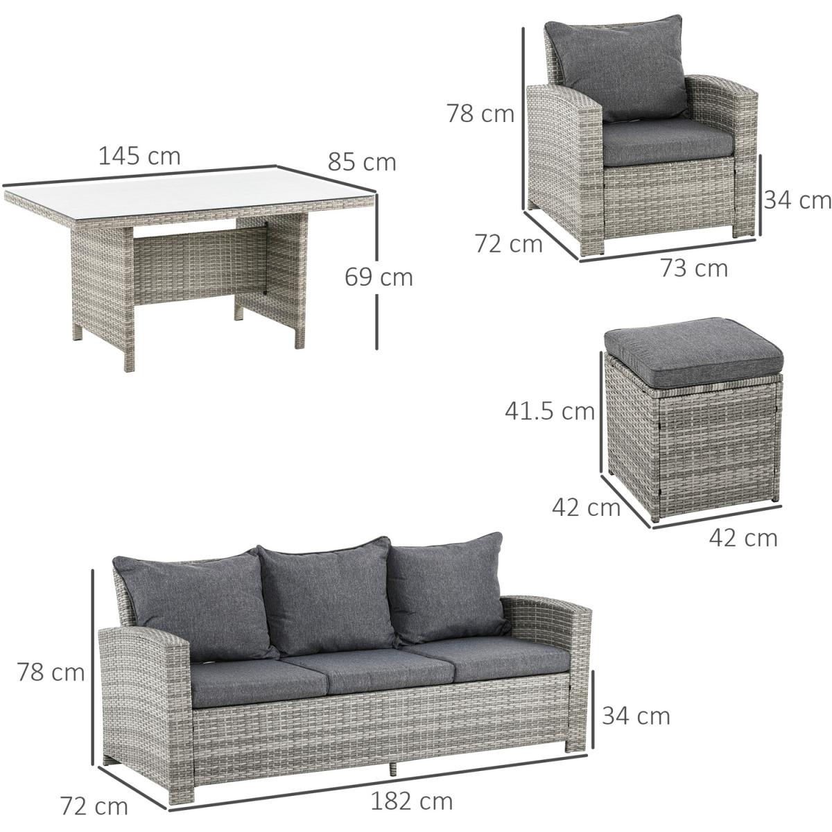 Ensure there's plenty of sitting space outdoors for friends and family with this six-piece set from Outsunny. Made from handwoven PE rattan with a steel frame underneath, each piece has been built to last, providing solid and reliable use time and again. Including a three-seater sofa, two armchairs, two stools and a large table, it will accommodate up to seven people easily. With plush padded cushions all over, this set has been made with comfort in mind, allowing you to relax for hours on end and it is finished with a forever stylish tempered glass top on the table for easy maintenance.