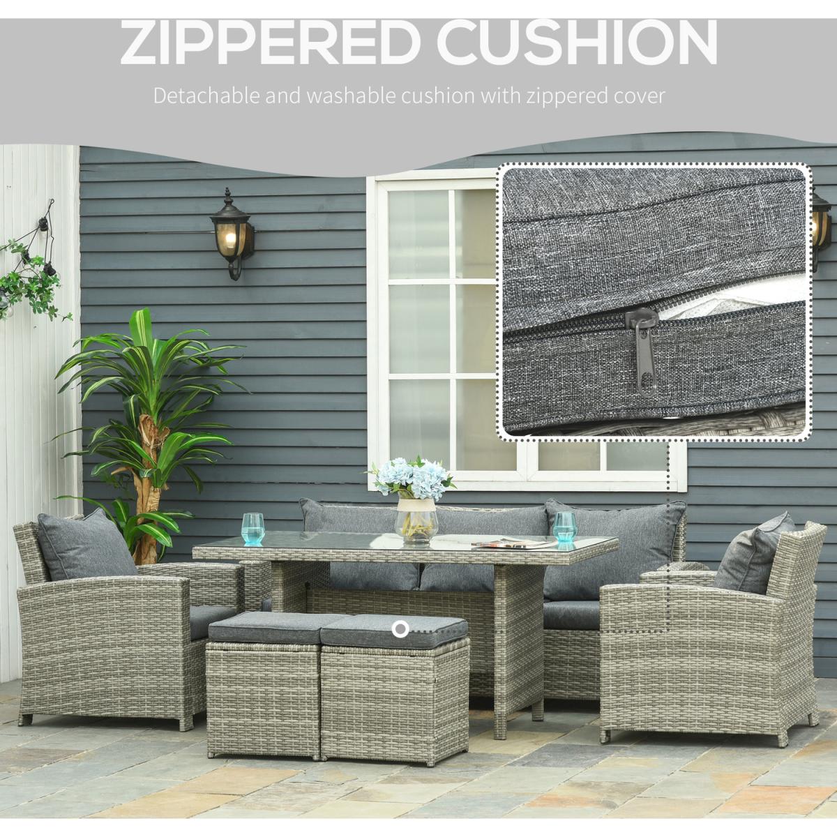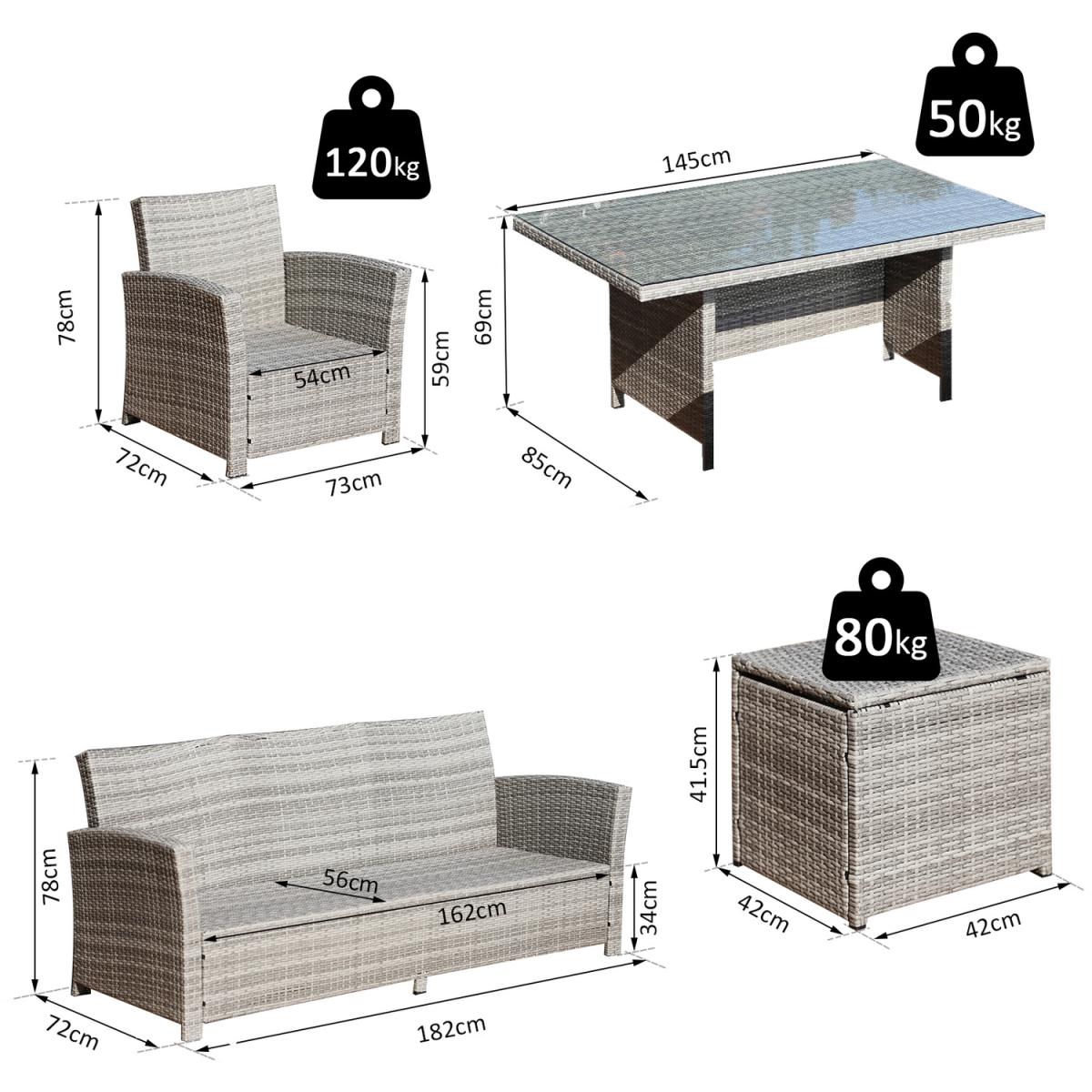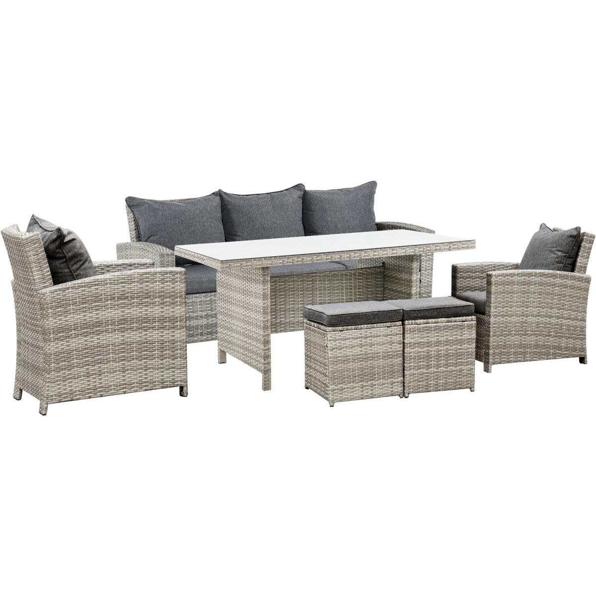 Ensure there's plenty of sitting space outdoors for friends and family with this six-piece set from Outsunny. Made from handwoven PE rattan with a steel frame underneath, each piece has been built to last, providing solid and reliable use time and again. Including a three-seater sofa, two armchairs, two stools and a large table, it will accommodate up to seven people easily. With plush padded cushions all over, this set has been made with comfort in mind, allowing you to relax for hours on end and it is finished with a forever stylish tempered glass top on the table for easy maintenance.