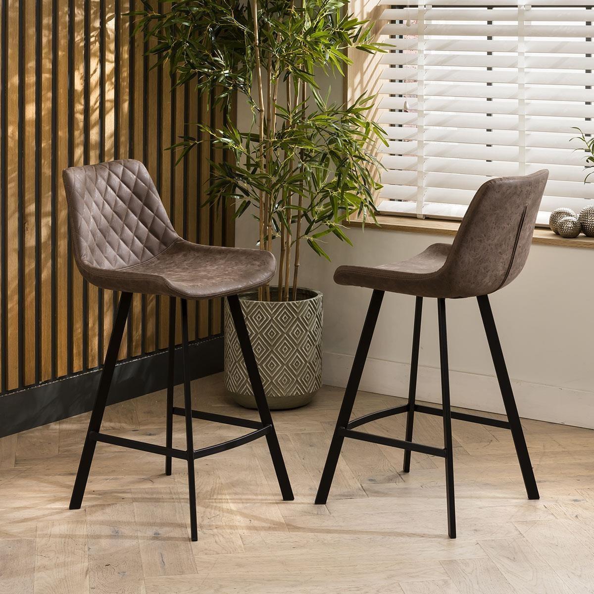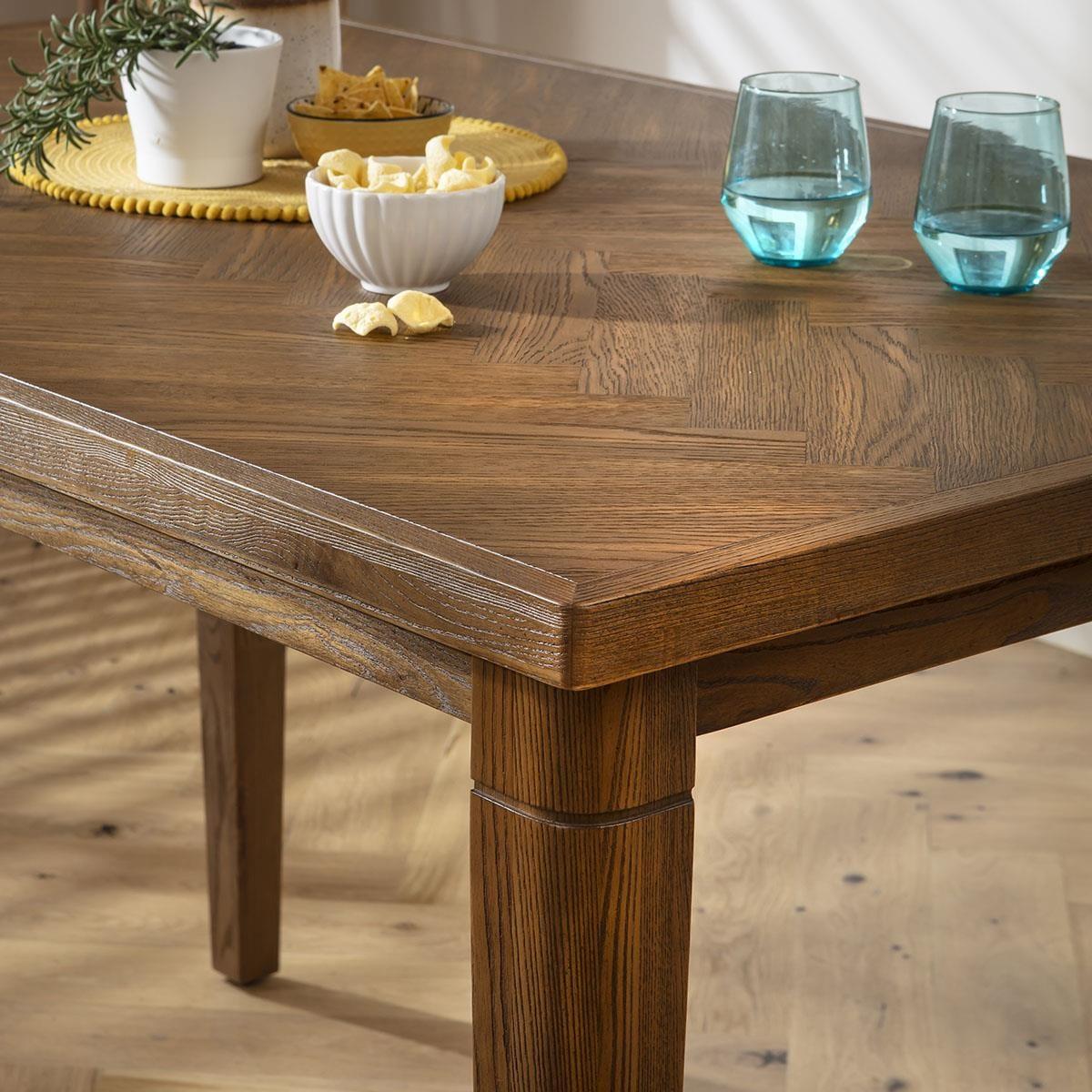 This 6 seater bar stool and table set includes counter bar stools with antique brown faux leather upholsetry and black metal legs, with the large, modern counter height bar table, crafted from solid oak with a herringbone veneer top. This modern bar set is crafted for durability and comfort. The large, modern counter height bar table is perfect for kitchen or breakfast bar seating, providing a spacious and stylish area to gather. Standing 92cm high, it comfortably seats 6. Crafted from solid oak with a herringbone veneer top, this 6-seater high kitchen table combines industrial style with rustic warmth. Featuring 6 Parker counter bar stools, the bar set is enhanced with the clean lines and a retro industrial flair, while quilted detailing on the back adds a touch of sophistication. Covered in antique brown faux leather with a padded seat and back, these stools are perfect for everyday family life. This 6 seater bar set combines modern Parker chairs with the stunning Gemini table. Whether you love the Parker bar chairs and would like to purchase them individually, or you think the Gemini bar table would complete your dining room decor better with another stool, you can easily mix and match our modern bar tables and stools to curate something truly unique. Table Size W150cm D96cm H92cm Chair Size W50cm D50cm H92cm Modern Bar Stool and Table Set For 6