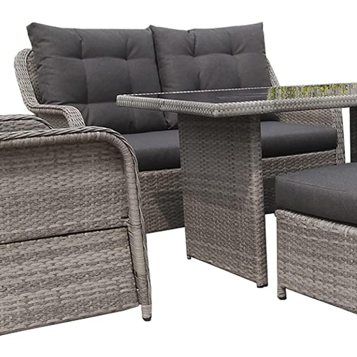Durable Aluminum Frame -- The sofa set is constructed with a durable aluminum frame, wrapped in PE rattan, which makes it more sturdy, weatherproof, and UV-resistant. Premium PE Rattan -- Made from high quality, durable PE rattan weatherproof, UV-resistant, anti-fade, low maintenance, and long-lasting use. 8CM Soft Cushion -- Thicken 8CM showerproof cushions, and cushions and pillows cover can be removed and machine washed, saving your clean work. Tempered Glass Table Top -- 130*70*68CM dining table which will provide ample space for you to put various items. The glass top makes the cleaning easier.