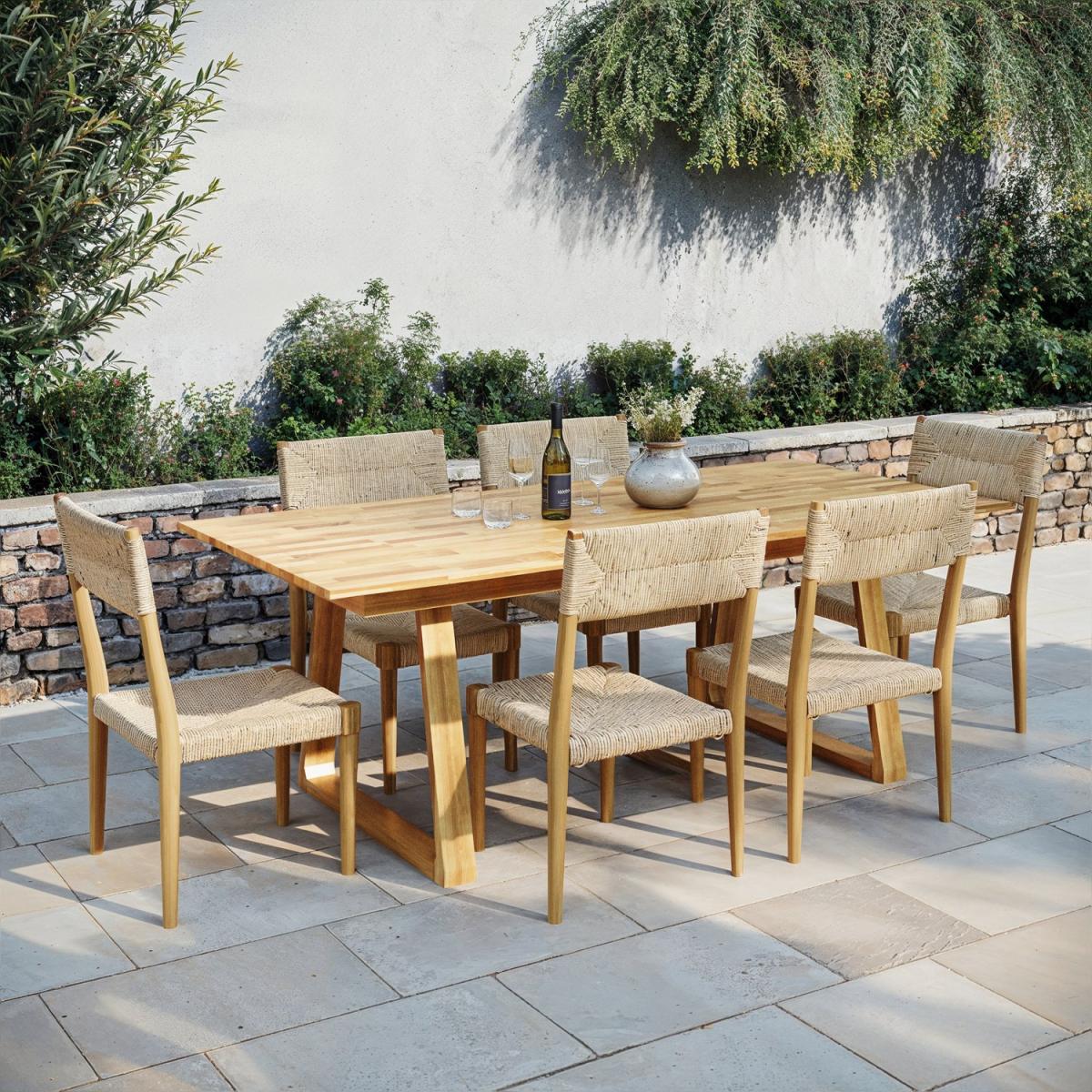 Naturally weather-resistant, extremely durable, and has a rich grain finish. Space-saving, easy to move and store in small spaces when not in use. The chairs feature a unique, contemporary design that enhances both comfort and aesthetics. Built to withstand outdoor use, resisting sun, rain, and daily wear and tear. Ideal for patios, gardens, terraces, balconies, or conservatories. Enhance your outdoor dining experience with this beautifully crafted 6-seater garden dining set. Made from premium solid Acacia wood, this stylish yet provides comfort, practicality and longevity. The twisted wicker on the chairs offers an elegant, handwoven look featuring triangle-shaped patterning on the seat and over the front and back of the backrest while providing superior support. This set is perfect for alfresco dining, garden parties and more. It’s low maintenance and easy to clean too, so you can keep it looking good all year round.