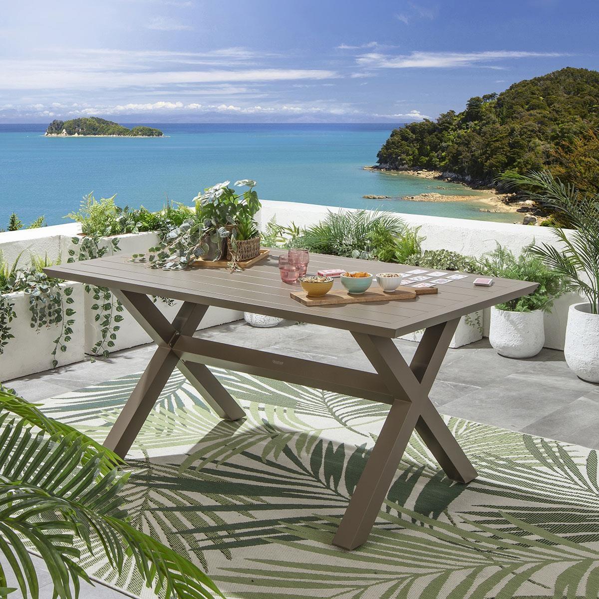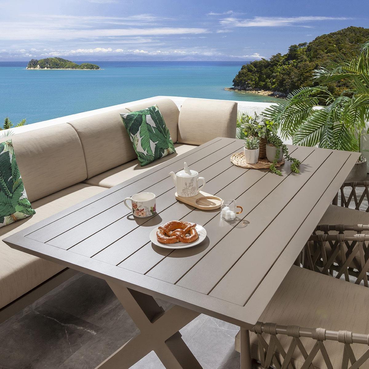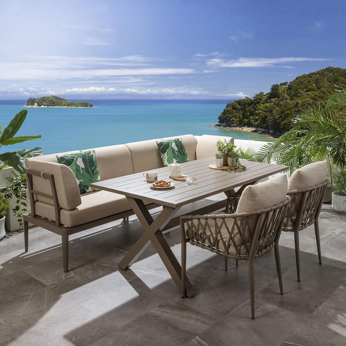 Upgrade your outdoor space with this 6-seater all-weather garden bench dining set, featuring the stylish Ada bench, Verity chairs, and the Star dining table. Crafted from high-quality aluminium with a premium beige finish, this modern outdoor table and chairs garden dining set is built to last season after season. The Ada outdoor bench features a sleek modern design, crafted from durable aluminium with premium cushions. Benches clip together for flexible configurations and seat two people each. The Verity chairs boast a solid welded aluminium frame and a unique fabric weave backrest, paired with super-comfortable cushions. The Star garden dining table is a 160cm full-aluminium piece, featuring a farmhouse-inspired X-leg design. Completely all-weather, this outdoor patio table can remain uncovered year-round with no issues, making it a low-maintenance yet stylish addition to your space. This S1 garden table set includes 2 Ada bench sections, 2 Verity chairs, and a Star outdoor dining table. Protective covers are included for added longevity, shielding from tree sap, bird mess, and debris. Cushions should be stored when not in use for maximum durability. Table Size W160cm D93cm H76cm Bench Section Size W123cm D73cm H81cm Chair Size W60cm D63cm H83cm