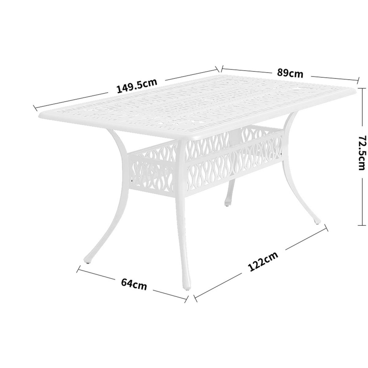 Transform your outdoor haven with this extraordinary patio table chairs set, meticulously crafted with a unique vintage design that radiates fine craftsmanship, infusing an artistic flair into your surroundings. Crafted from anti-rust cast aluminium, these pieces are not just enduring but surprisingly lightweight, making it a breeze to rearrange your outdoor space to suit your mood. The intelligently designed table incorporates a convenient umbrella hole, allowing you to savour your outdoor haven in the shade or under the sun's warm embrace. And with a generous six chairs, each generously cushioned for maximum comfort, relaxation becomes second nature. Whether you're hosting lively gatherings on your patio, unwinding amidst the lush garden, soaking up the sun by the poolside, or cherishing a moment of serenity on your balcony, this versatile and stylish furniture ensemble is your ideal companion, adding a welcoming touch to all your outdoor adventures.