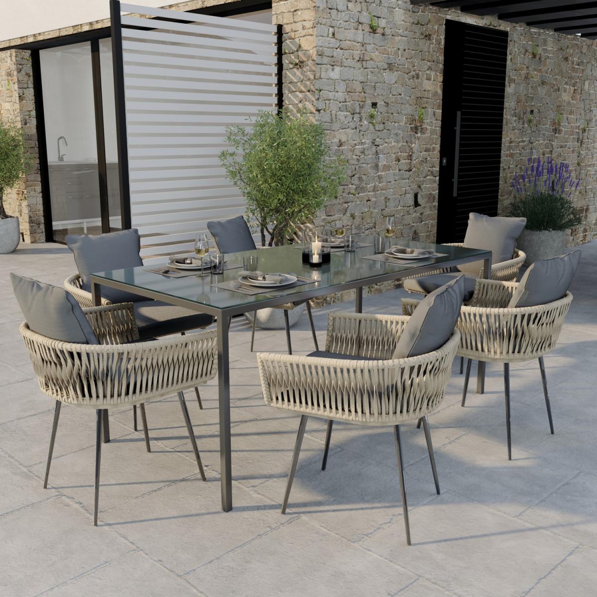 Make a statement in your outdoor space with this 6 seater dinning set. Perfect for entertaining into the late summer evenings with friends and family. The champagne gold aluminium frame and weaving role is weatherproof and waterproof. The cushion covers can be removed, and machine washed to be kept fresh. It's the ideal all-year-round set. Enhance the life of your garden furniture- This product has been designed to be used outdoors. To make the most of your furniture, we recommend that you store it indoors, move it in a sheltered position or protect it by covering it up in bad weather and over the winter period. Why not invest in one of our garden stores to help keep upholstery (cushions) dry and prevent any mould or mildew from forming.