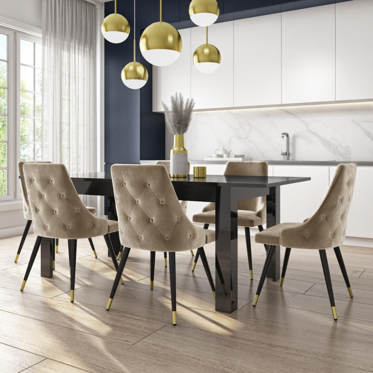 . This bundle includes Black High Gloss Dining Table Extendable 6 Seater - Vivienne. 1 x Pair of Beige Velvet Dining Chairs with Button Back & Black Legs - Maddy. Features we love Ideal for 4-6 diners – folding design saves space when not in use. Quickly make extra dining space with the extension leaf mechanism. Clean design with a sleek finish adds a modern touch to the dining space Smooth high gloss finish – super easy to wipe clean. In jet black it easily coordinates with other dining furniture. Including just the table you're free to pair it with the chairs of your choice All about me. This contemporary Vivienne dining table has a hidden secret it features a clever table top design where the top pulls apart to lift up an extra table leaf giving extra dining space. It comes in handy for increasing your dining space when guests come to call when the family are around for Sunday lunch or if you're simply serving up a feast and need more space for dishes. The table comfortably accommodates four diners when closed and when fully extended there's plenty of space for six diners. As it's neat and compact when closed it's great for saving space in your dining room or kitchen when it's not in use. The table comes on its own so you have the freedom to pair it with the chairs of your choice and the number that best suits your household. With a clean and linear design all in jet black the Vivienne table is super easy to coordinate with other dining furniture and many décor schemes. The sleek high gloss finish gives the table its own natural shine that reflects light beautifully plus the smooth nature of the table makes it super easy to wipe clean. Need to know. Dimensions (closed). H75 x W160 x D90 cm Dimensions (extended). H75 x W200 x D90 cm Size. 4-6 Diners Material. Wood combination Finish. Black high gloss Assembly required. Yes.