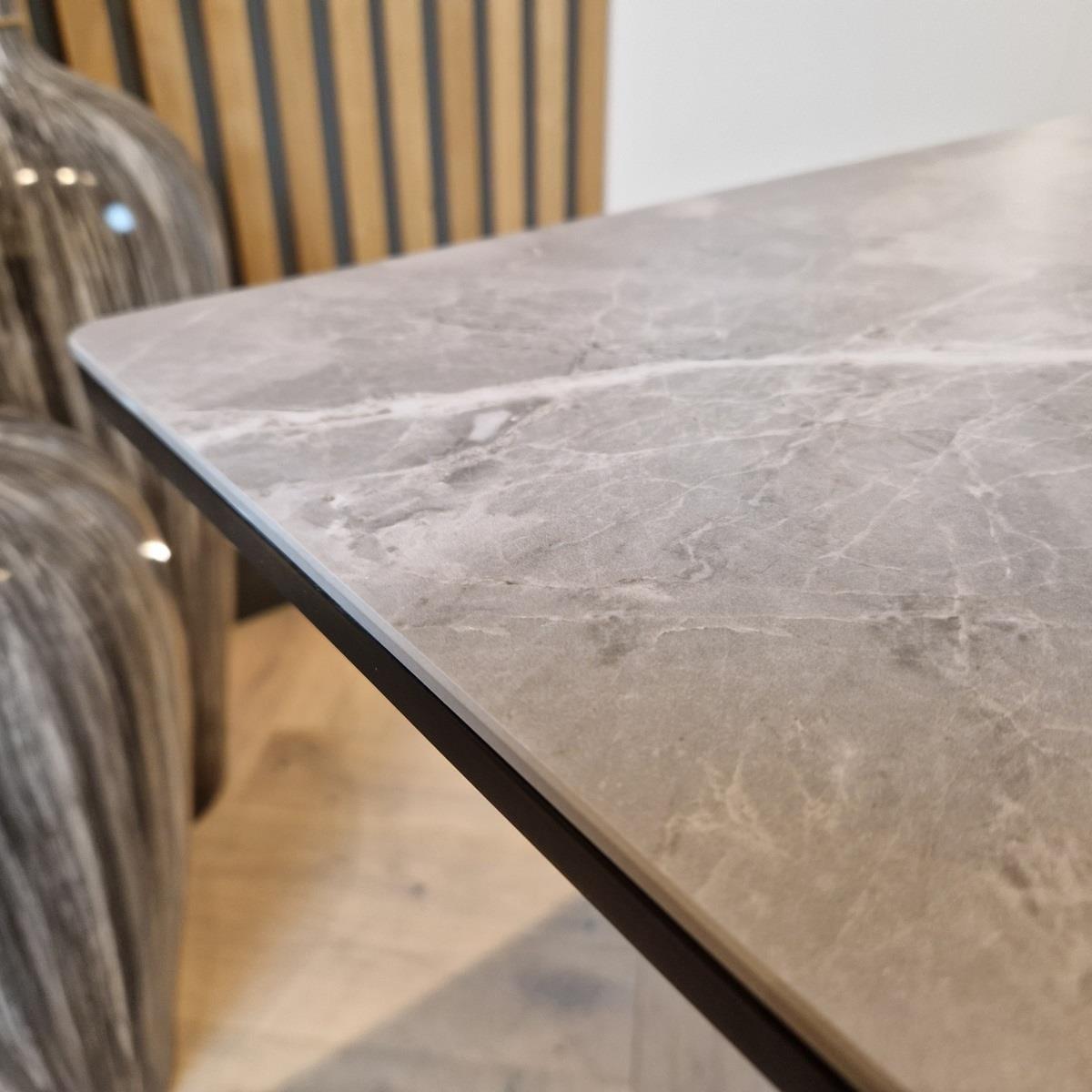 Glamify your space with this extending ceramic marble dining table. Sleek and elegant, the grey ceramic table is complete with gold-toned metal legs in a striking crossed design that supports the rectangular extendable ceramic top. This art deco inspired dining table has a 180cm tabletop that extends to 230cm. The JLA Performance Grey Velvet Carver Dining Chairs in this set introduce luxe elegance to your space. Resting on a golden tubular metal frame, this versatile dining chair has volumes of character and a charming curved shape. Sitting atop of a unique golden base, the chair design wraps around your back with its sweeping silhouette and supportive club chair design. These dining chairs are upholstered in stain-resistant performance velvet upholstery and feature dense foam padding to offer a very comfortable seat. W:180-230cm, D:89cm, H:76.5cm 6 Seater Dining Set Extendable Dining Table with Grey Ceramic Top Includes 6 Luxury Grey Velvet Chairs