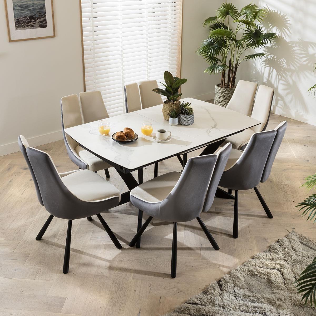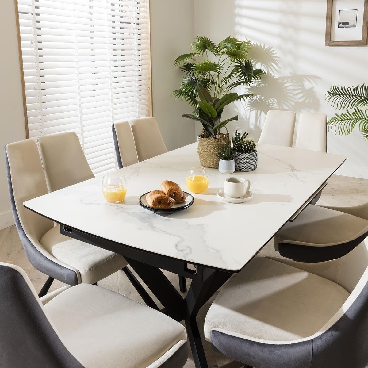 If you're looking to add a statement piece to your dining room with all the durable qualities of ceramic, Quatropi's Emperor 150-200cm extending white ceramic dining table has a generously large table top made of high-quality Italian ceramic in a white marble effect finish, which is applied to a stable plate made of safety glass. Featuring a solid 4-legged metal base design incorporates a premium black powder coated finish, that supports the self-stowing extension mechanism that extends the table from a 150cm to a 200cm 6 - 8 seater dining table. The JLA Dining Chair Collection is designed with a gorgeous split-back frame. This set of chairs is upholstered in premium creamy grey performance velvet, with metal black powder coated legs. The dining room chair is perfect to set in your living room, at your kitchen counter, or, of course, at your dining room table. W200cm D90cm H76cm Chairs expertly upholstered in performance velvet Set includes the dining table and 6 chairs