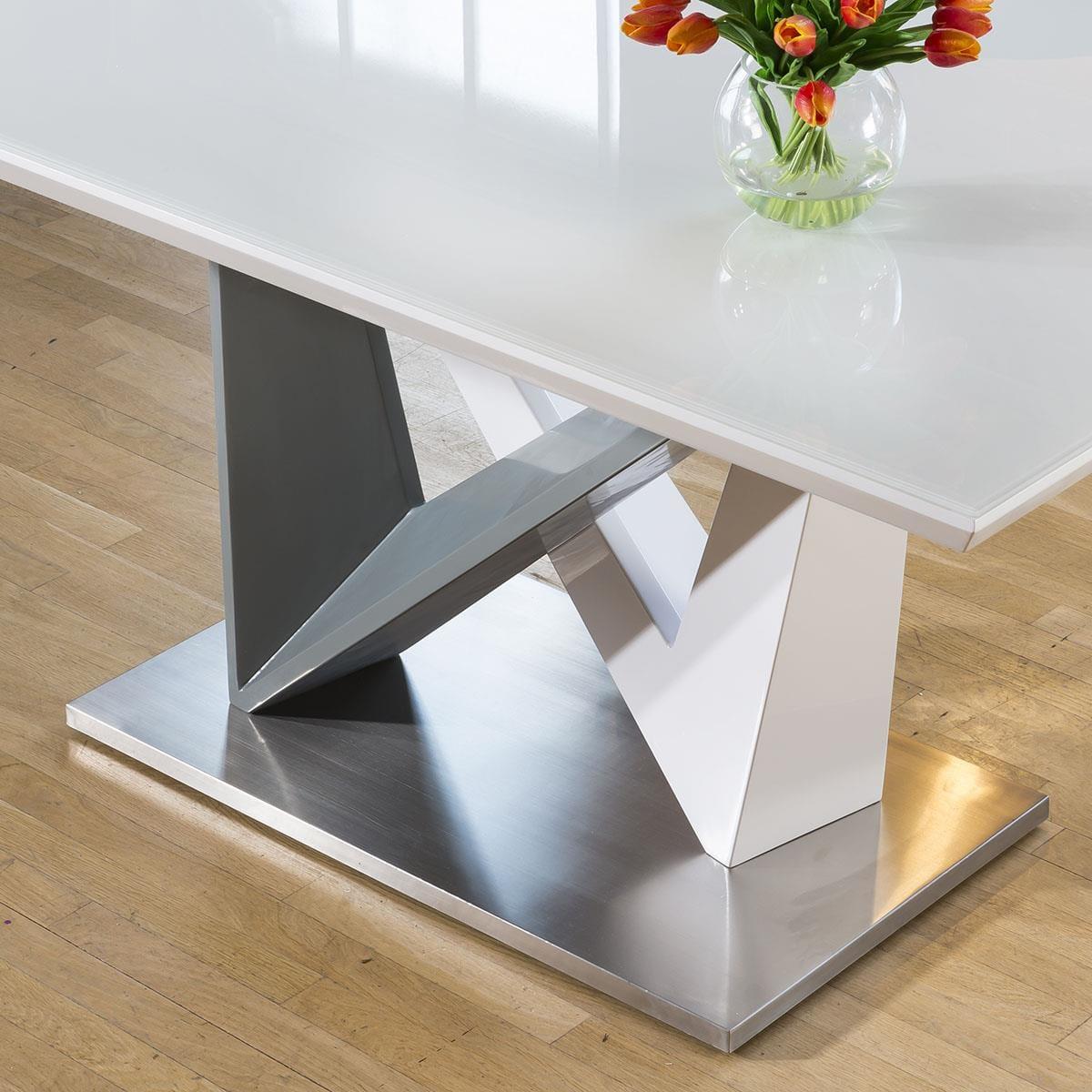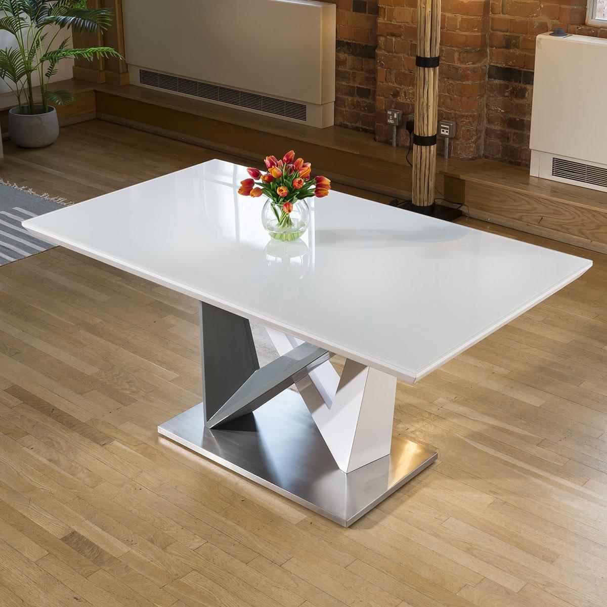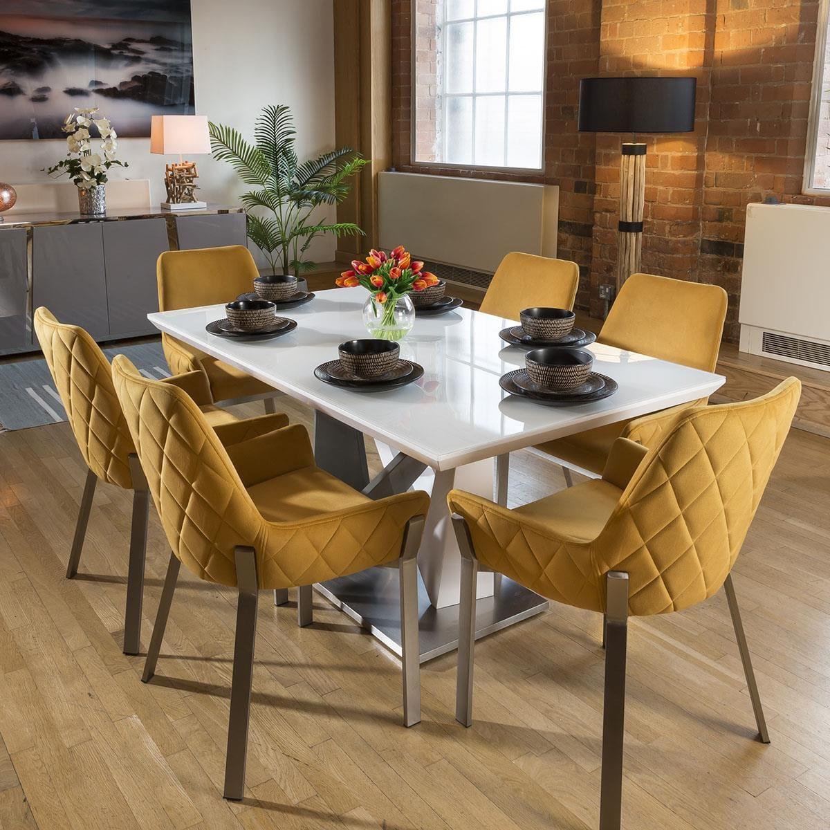 High Quality 1600mm Rectangular Dining Table With White Glass Top For Extra Durability. Superb quality with high specification super white glass top and white / grey gloss central pedestal. This dining set includes 6 Carver Dining Chairs With Mustard Quilted Fabric and Brushed Stainless Steel Legs, adding that perfect splash of colour. Quatropi Luxury Dining Sets have been designed to stand out in the most contemporary dining rooms and kitchens in the UK. The dining table sets have been put together by our expert designers to provide a large combination of choice from farmhouse style to prestige, including small or large dining table sets, long narrow tables, round breakfast tables, farmhouse solid oak sets, extendable dining sets, corner sofa bench sets - only to mention a few! Our range of dining chairs that we match to the dining tables provides you with a large choice of sets - these are available in many colours and made in many styles, such as carver, faux leather, suede, velvet and many more. Our range of dining chairs that we match to the dining tables provides you with a large choice of sets - these are available in many colours and made in many styles, such as carver, faux leather, suede, velvet and many more. W160cm D90cm H76cm Set includes 1 x dining table and 6 chairs Mix and Match any of our tables and chairs