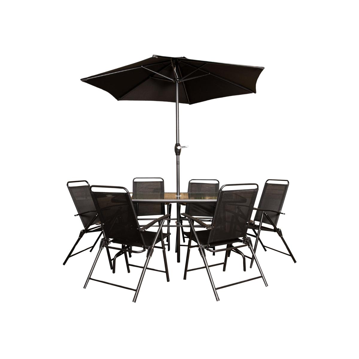 Elevate your outdoor space with this stylish 6-seater Samuel Alexander garden patio furniture set in black. Having a patio furniture set extends your living space allowing you to enjoy being outside and transform your garden or patio into a relaxing retreat. This sleek and contemporary set is sure to compliment any garden setting making this set perfect for dining on or enjoying drinks in the summer sun with family and friends. This modern set will become the focal point of your patio, garden or terrace area and features a tempered glass table top with 4 sturdy legs made from steel and comes complete with 6 multi-position, folding black textilene chairs and a matching black parasol. A 5cm parasol hole in the centre of the table allows you to enjoy the patio set with the benefit of shade. The set is supplied flat-packed and self-assembly is required with instructions included.