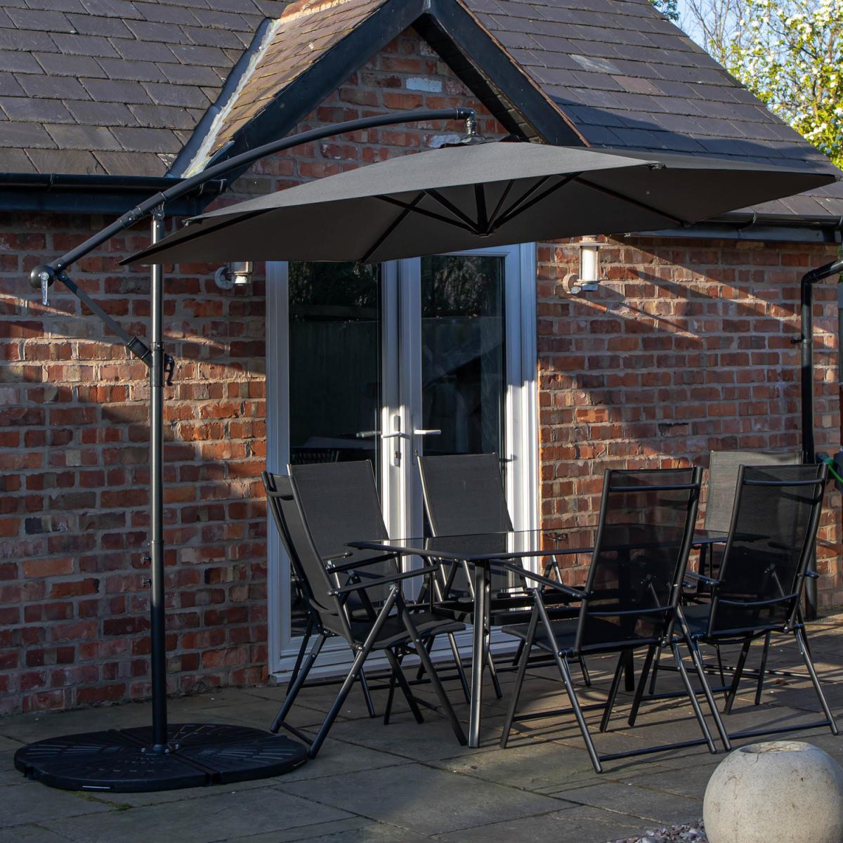 Relax and enjoy your leisure time this summer with this attractive glass top outdoor dining table and 6 chairs set with grey banana parasol and base weights. This stunning set will become the focal point to your garden, terrace or patio area making it ideal for dining on or just enjoying drinks in the summer sun and has space for up to 6 seats. Having an outdoor patio furniture set can greatly enhance your outdoor living space and creates a comfortable and inviting space for you to relax, entertain, and enjoy nature. The set includes a black, rectangular tempered glass top table with 6 multi-position chairs, grey banana parasol and parasol base weights. Having a black steel set will blend seamlessly with its surroundings. It adds sophistication and a sleek, modern touch to your patio or garden. The frame of the table and chairs are made from steel and have been finished with a powder coating for added strength and durability. The chairs have a textilene backing and they can easily be folded away when not in use for easy and convenient storage. Choose from various positions to recline by adjusting the seat handles to sit back and unwind. With a grey banana parasol and base weights included, you can shield yourself from the sun. With a 3m canopy, this parasol is designed to provide ample coverage allowing you to stay cool, comfortable and protected in your outdoor space. This garden parasol offers a sleek and modern design with it's grey canopy which will add that touch of sophistication to any outdoor setting. Wind the crank handle to open and close the umbrella for a smooth and easy to use experience. Simply, fill each base weight with sand or water to keep your parasol in place whilst in use. Secure the weights with the included metal clips. The set is supplied flat packed and self assembly is required.