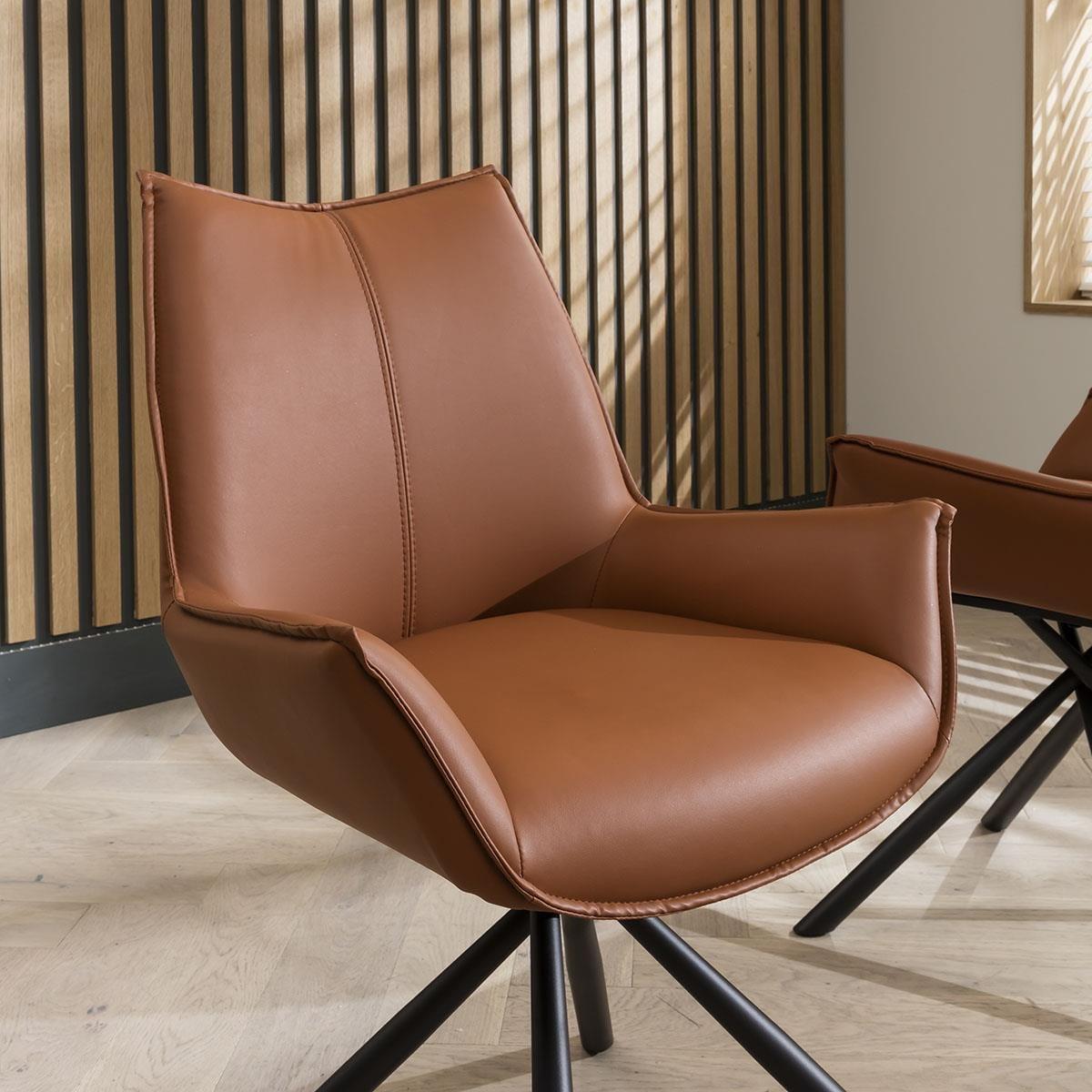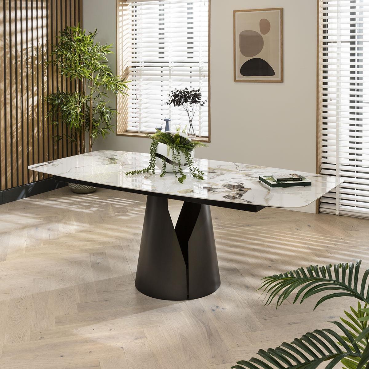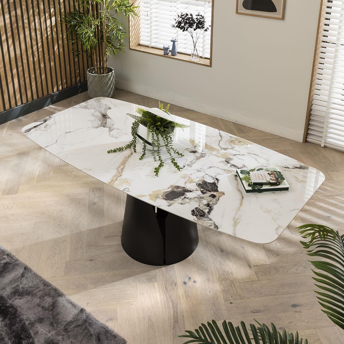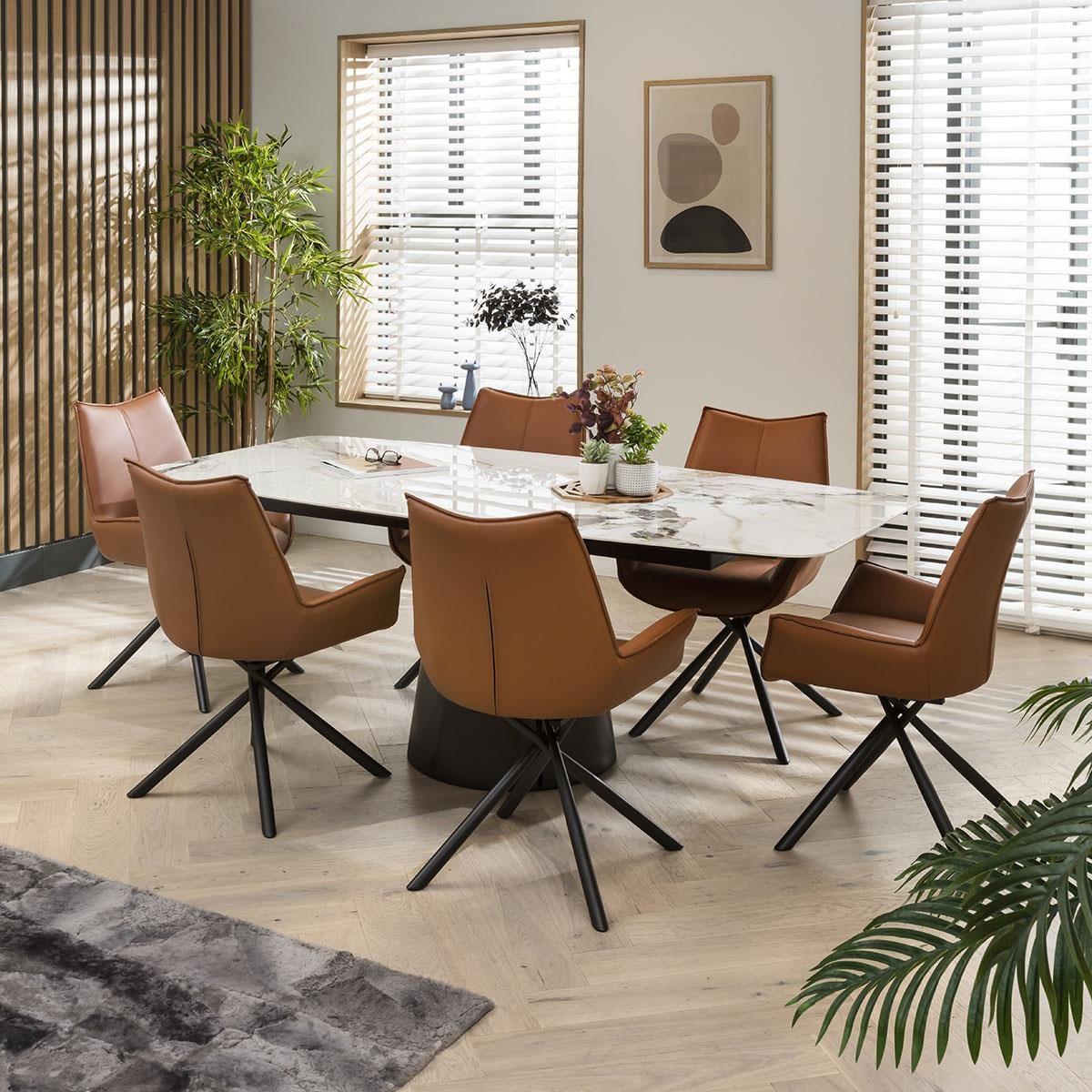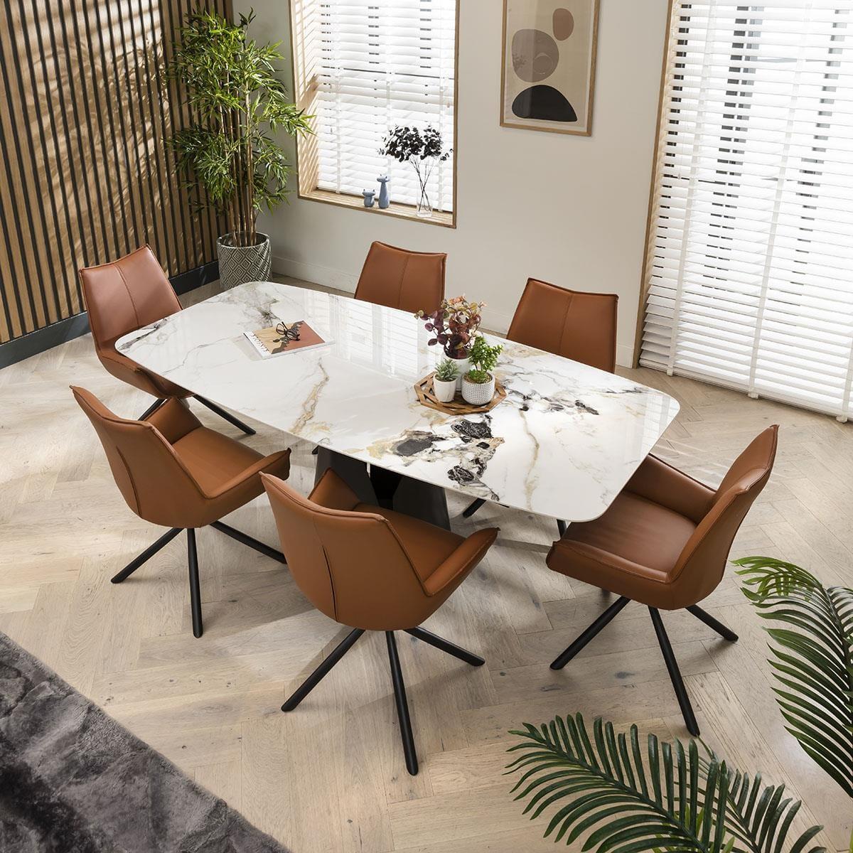 Exclusive to Quatropi. The Giano Crystalart Dining Table by Quatropi is definitely an dining room table with a great aesthetic impact, with a single conical central base, formed by two coupled shaped blocks, thus resulting in a shape that leaves room for imagination, without edges and corners. This 200cm Dining Table has a top made of premium ceramic marble. The steel pedestal base is finished in cool embossed graphite. The Cattelan table by Quatropi will be an element capable of personalising not only the space dedicated to it but the entire living area that will host it to which it will be able to give a modern and unusual cut. The Dining Set includes 6 sleek and streamlined contemporary swivel dining chairs, sure to compliment most modern dining tables, boasts in both style and comfort. The beautifully finished carver dining chair features tan faux leather upholstery and matt powder-coated black steel spider legs. The densely cushioned chair seat and backrest will provide all of your dinner guests with comfort, sat on a swivel base for added convenience at the dining table. W200cm D100cm H75cm 6 Seater Dining Set Durable Marble-effect Ceramic Dining Tabl