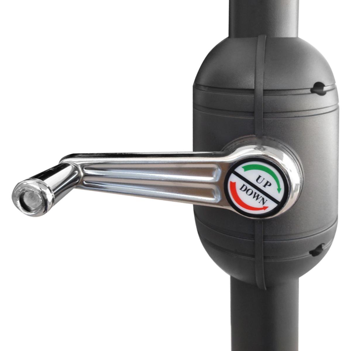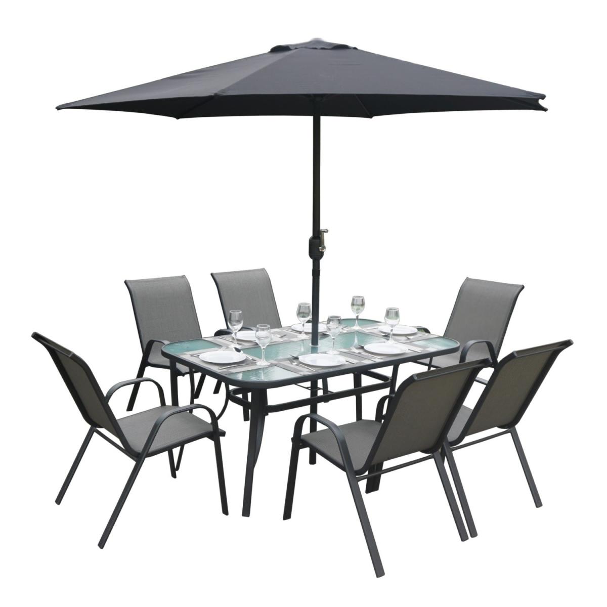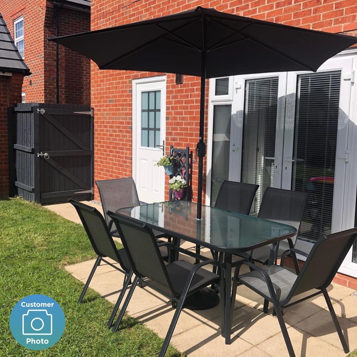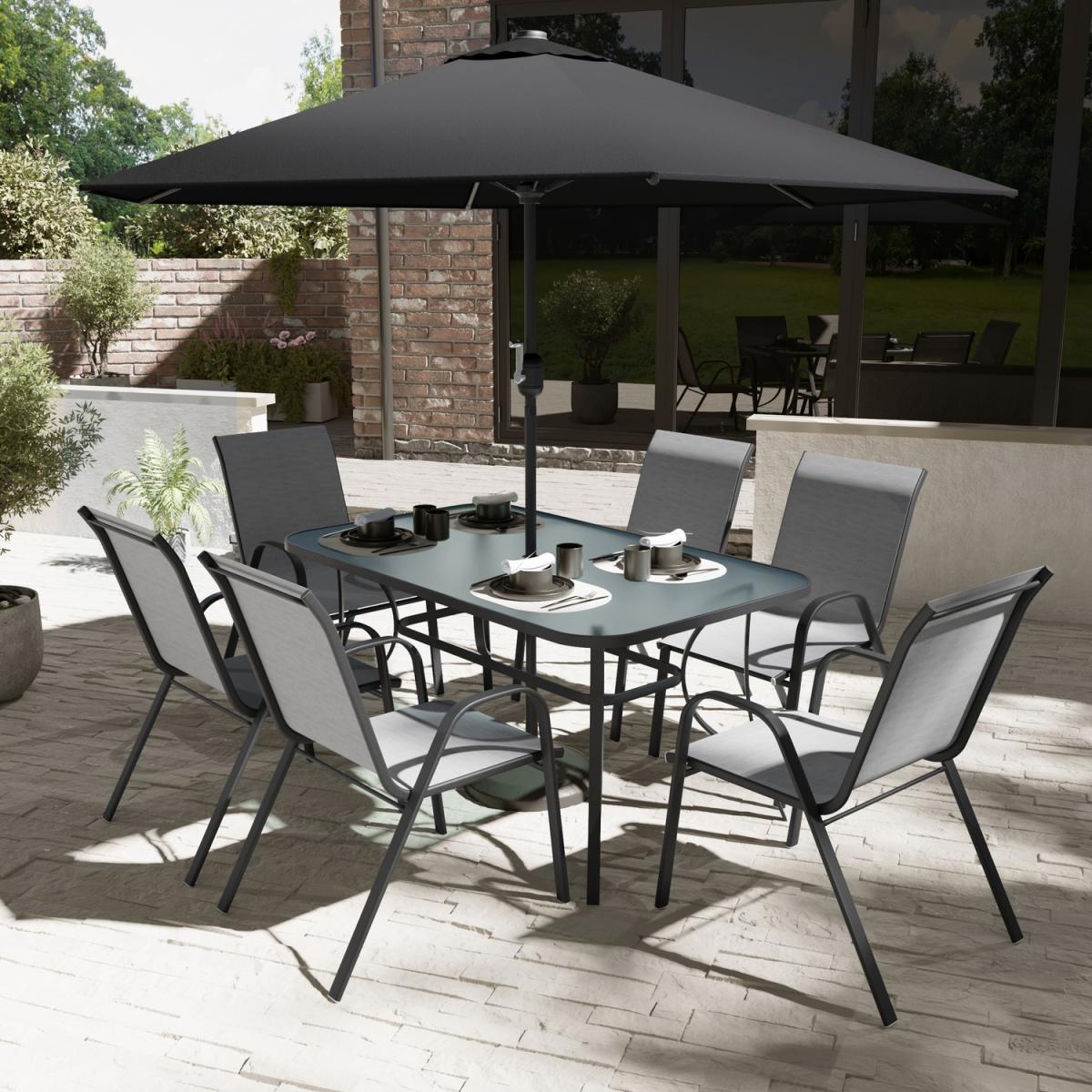 This summer, enjoy dining in your garden with our modern six-seater outdoor dining set. The slingback chairs feature armrests to ensure that you're comfortable. The large table is great for entertaining family and friends on a warm summer's day. The set includes a parasol with an easy crank mechanism to provide shade and shelter from light showers. It slots easily into the table's central parasol hole and is secured by the base. With all-weather steel frames, this dining set is a durable addition to your garden. It's designed for use outdoors. However, we recommend that you store it indoors during winter or in one of our garden stores.