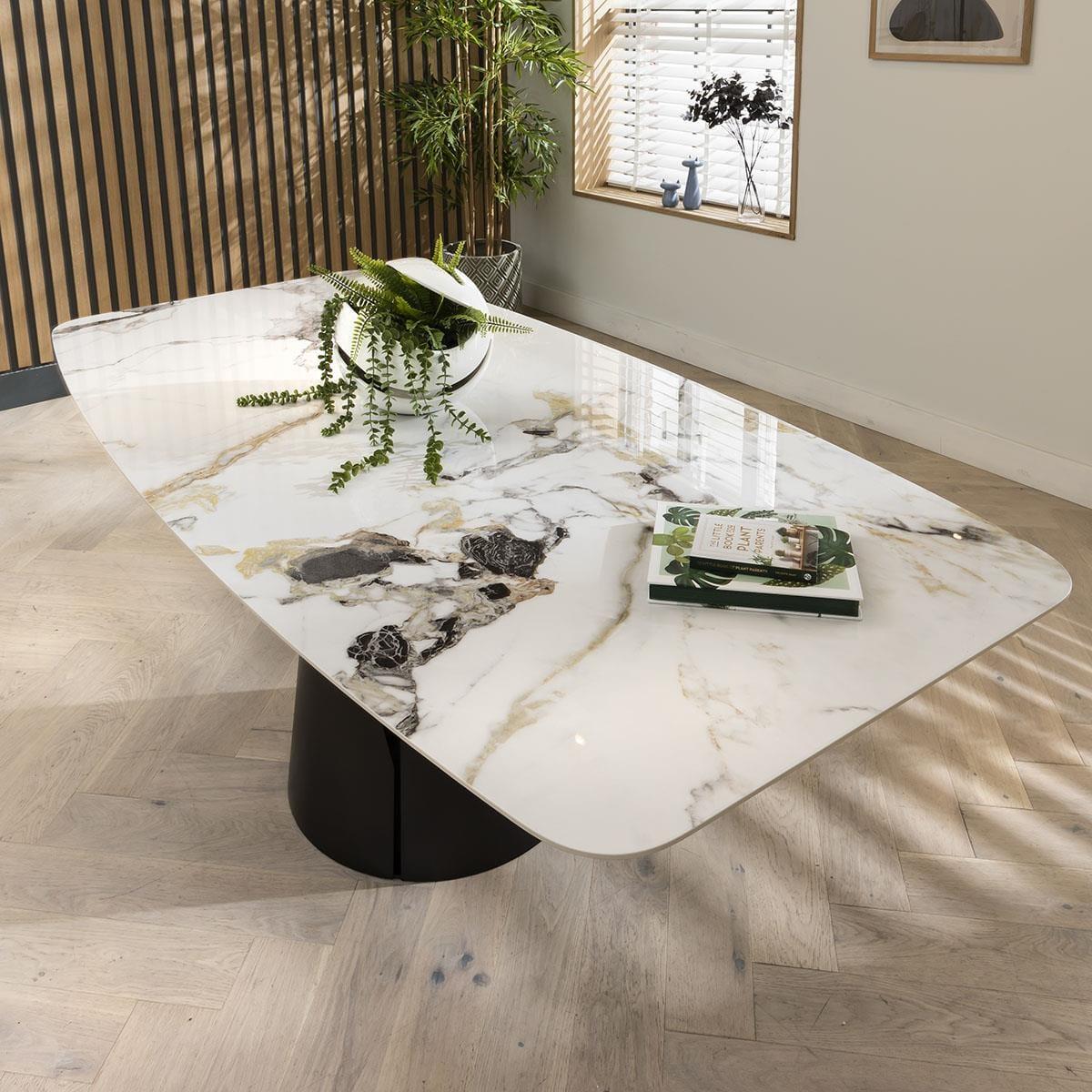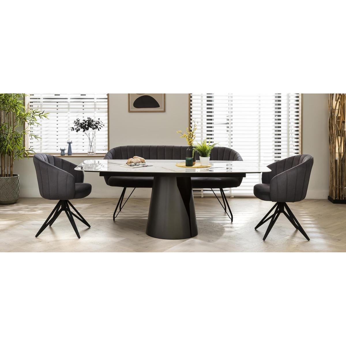 Exclusive to Quatropi. The Cattelan Dining Table Set by Quatropi features a dining room table with a great aesthetic impact, with a single conical central base, formed by two coupled shaped blocks, thus resulting in a shape that leaves room for imagination, without edges and corners. This 200cm Dining Table has a top made of premium ceramic marble. The steel pedestal base is finished in cool embossed graphite. The Cattelan table by Quatropi will be an element capable of personalising not only the space dedicated to it but the entire living area that will host it to which it will be able to give a modern and unusual cut. This 6 Seater Set includes a Dining Bench with Back and 4 additional dining room chairs. Upholstered in a gorgeous, soft touch velvet fabric and finished in a rich grey velvet colourway, the Detroit dining bench with back combines a vintage inspired design with modern industrial-chic and comes with a generously proportioned, soft fire-resistant cushioned seat with ribbed tufted detailing and gorgeous curves. The dining bench is perfect for a minimalist modern setting and a perfect addition to an industrial, Scandinavian, or vintage-inspired interior. Complete with complementary rough black powder coated stainless steel hairpin-inspired legs, this chair will add a touch of class to any dining space. The simple elegant style of an upholstered chair is enhanced by the plain structure, powder-coated metal legs, and shell-shaped seat with a half-moon recess. This swivel dining chair really has it all, clean contemporary lines, attractive ribbed upholstery detailing and a fully cushioned seat and back upholstered in premium dark grey fabric. The 9214 rotating grey dining chair with ribbed stitching, comes with splayed black metal powder-coated hairpin legs with a swivel mechanism, making it easy to get out of and into again. W200cm D100cm H73cm 6 Seater Dining Set Large Ceramic Marble Dining Table