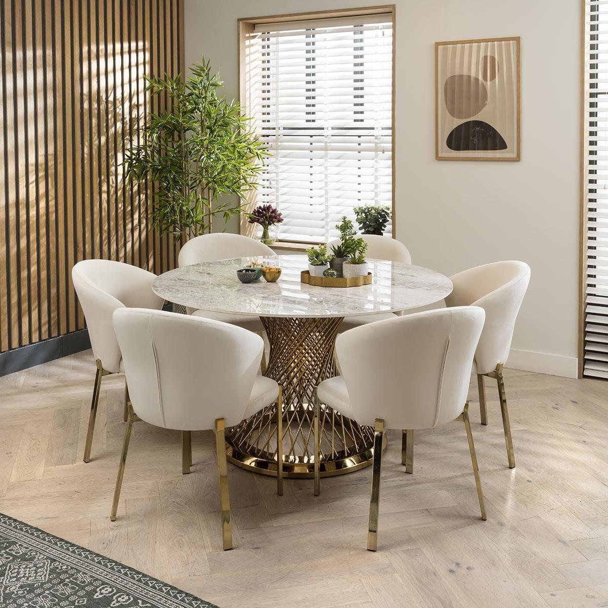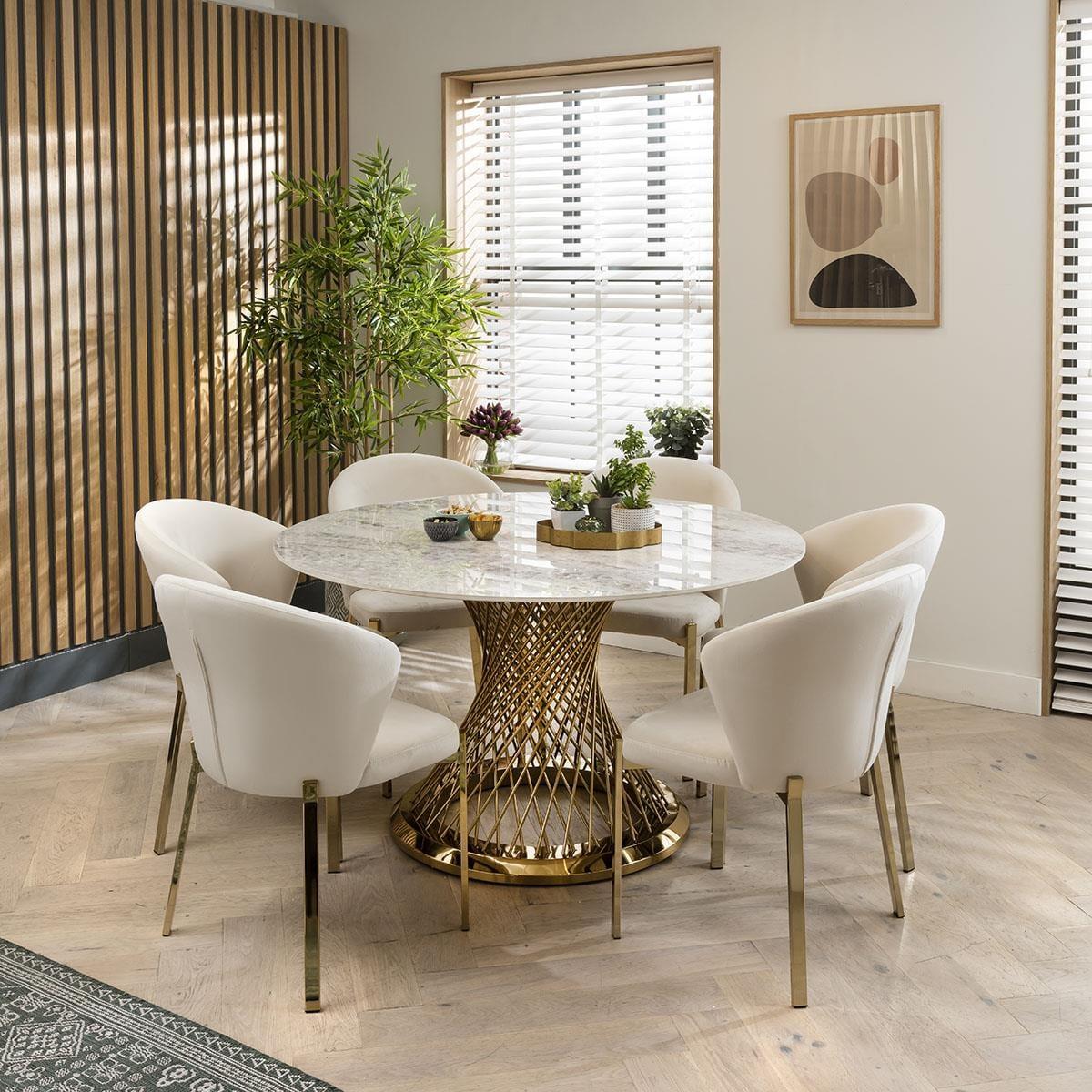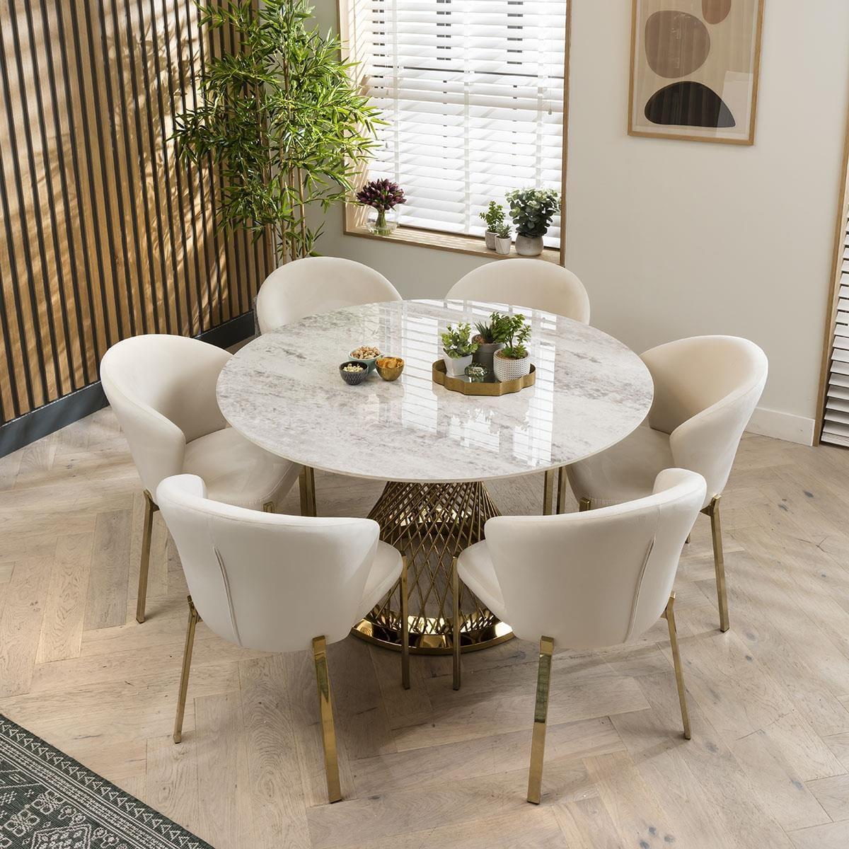 The Sunburst marble-effect round dining table, featuring a premium white ceramic marble top that exudes luxury and elegance. The scratch, stain, and heat-resistant ceramic material makes it an excellent modern dining table for families with children or frequent entertainers. The white dining table's pedestal base provides sturdy support, while the stand-out metal twisted spoke and gold stainless steel base offer a chic and modern touch. The 135cm round tabletop comfortably accommodates up to 6 diners, making it a perfect addition to any small dining area or breakfast nook. Indulge in opulence with our premium cream velvet chairs. Softly cushioned seats atop shiny gold legs offer both comfort and style. Included as part of this 6-seater dining set, this premium-quality design is sure to impress. W135cm D135cm H76cm Stunning gold stainless steel twisted spoke pedestal base 6 Seater Round White Ceramic Marble Dining Table And Chairs Set