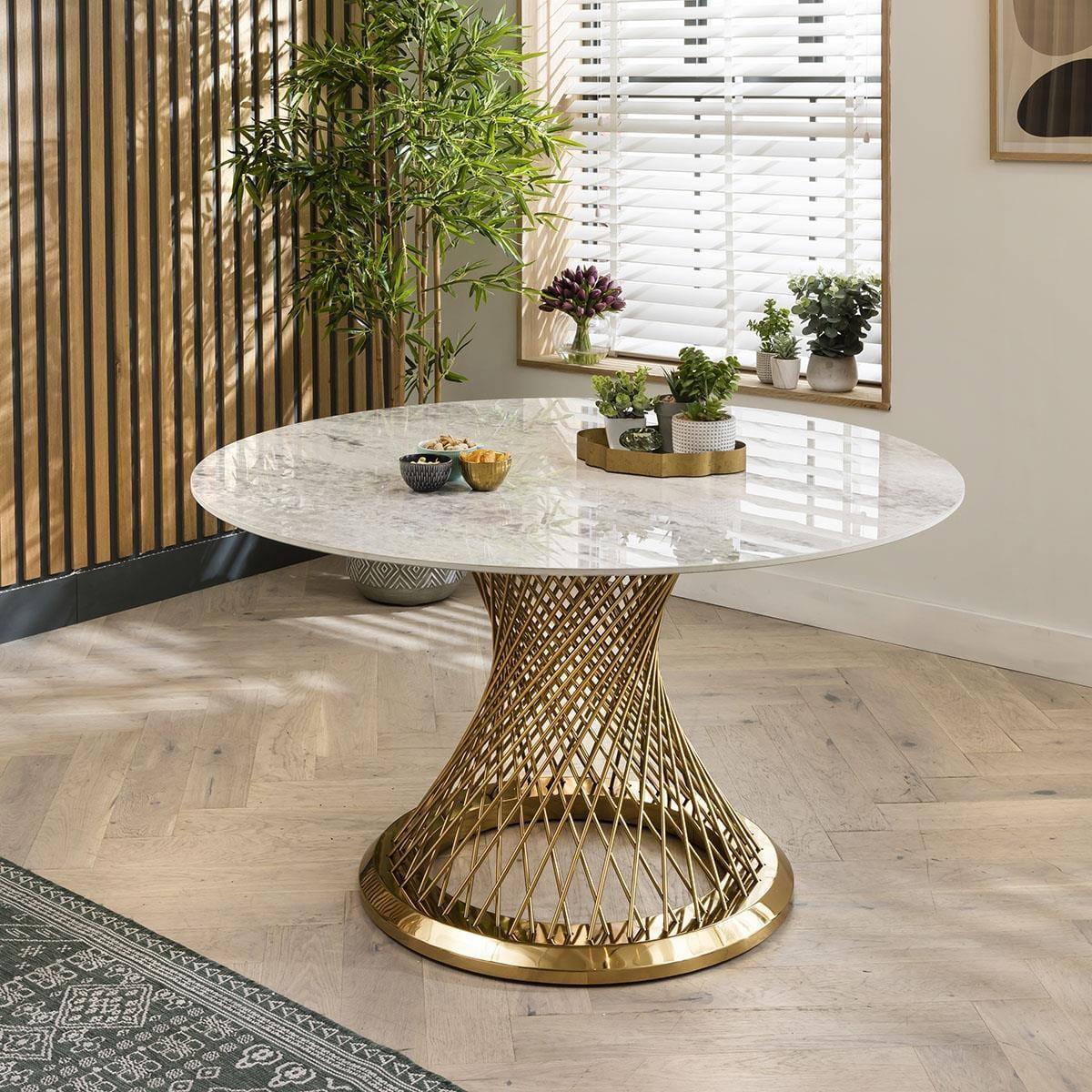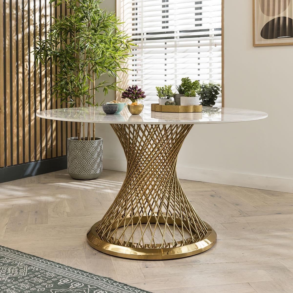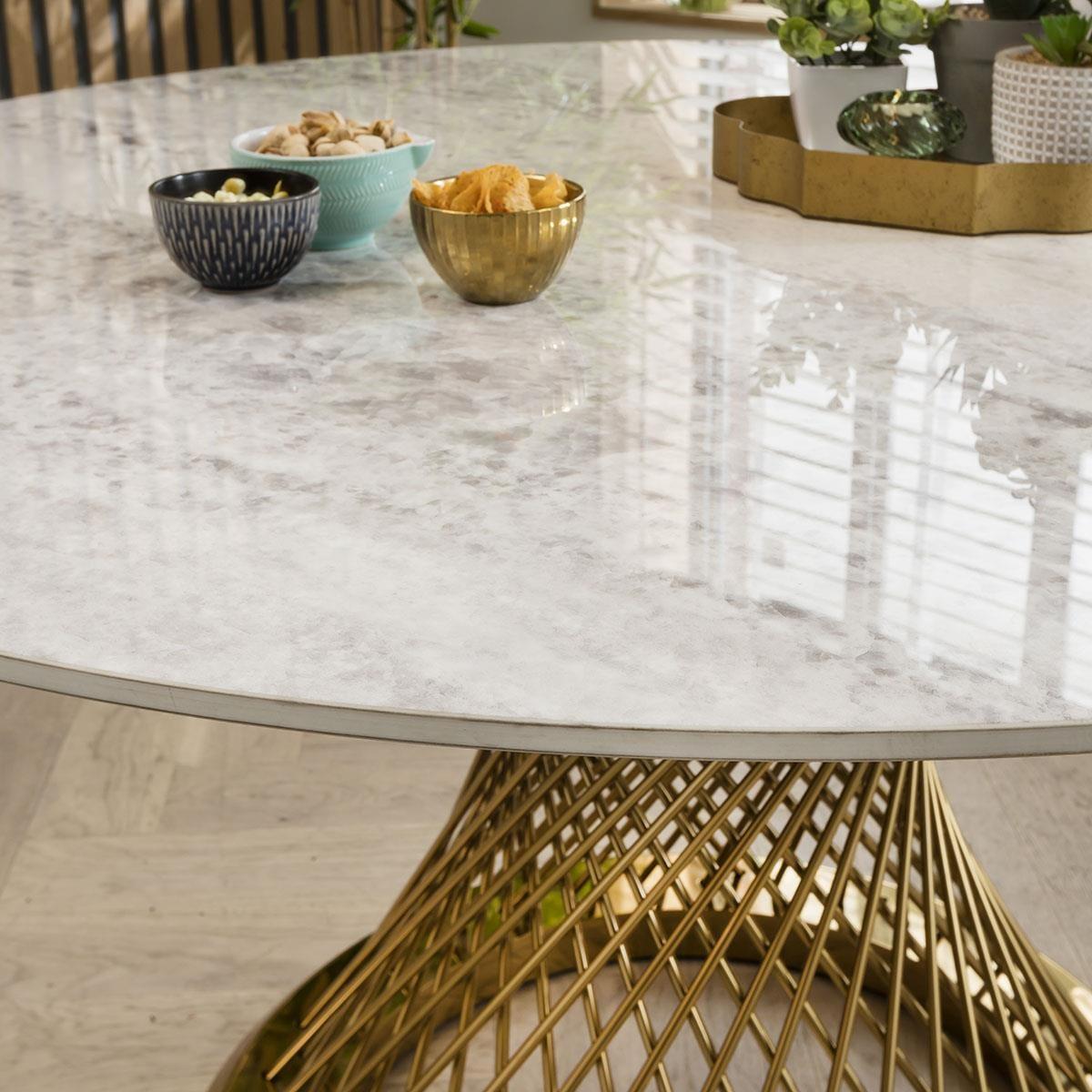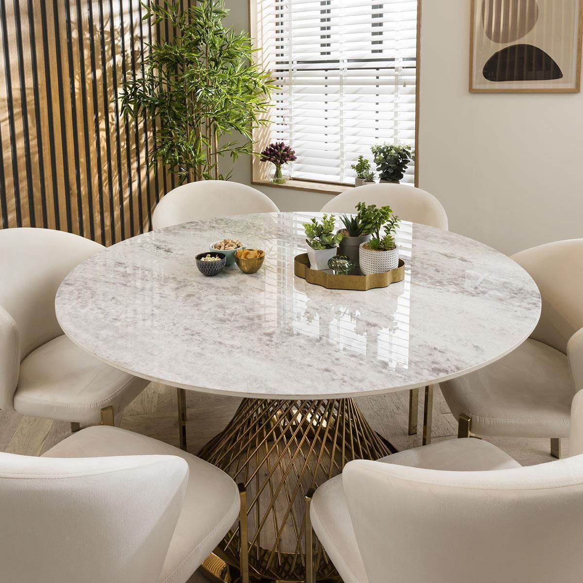 The Sunburst marble-effect round dining table, featuring a premium white ceramic marble top that exudes luxury and elegance. The scratch, stain, and heat-resistant ceramic material makes it an excellent modern dining table for families with children or frequent entertainers. The white dining table's pedestal base provides sturdy support, while the stand-out metal twisted spoke and gold stainless steel base offer a chic and modern touch. The 135cm round tabletop comfortably accommodates up to 6 diners, making it a perfect addition to any small dining area or breakfast nook. Indulge in opulence with our premium cream velvet chairs. Softly cushioned seats atop shiny gold legs offer both comfort and style. Included as part of this 6-seater dining set, this premium-quality design is sure to impress. W135cm D135cm H76cm Stunning gold stainless steel twisted spoke pedestal base 6 Seater Round White Ceramic Marble Dining Table And Chairs Set