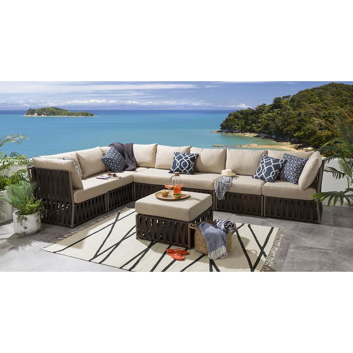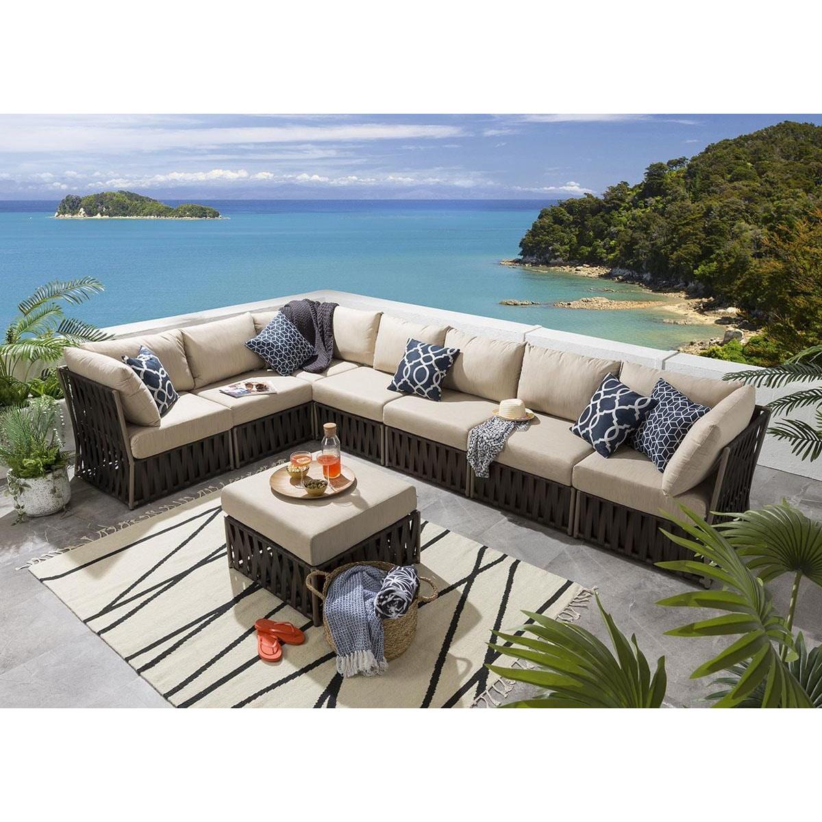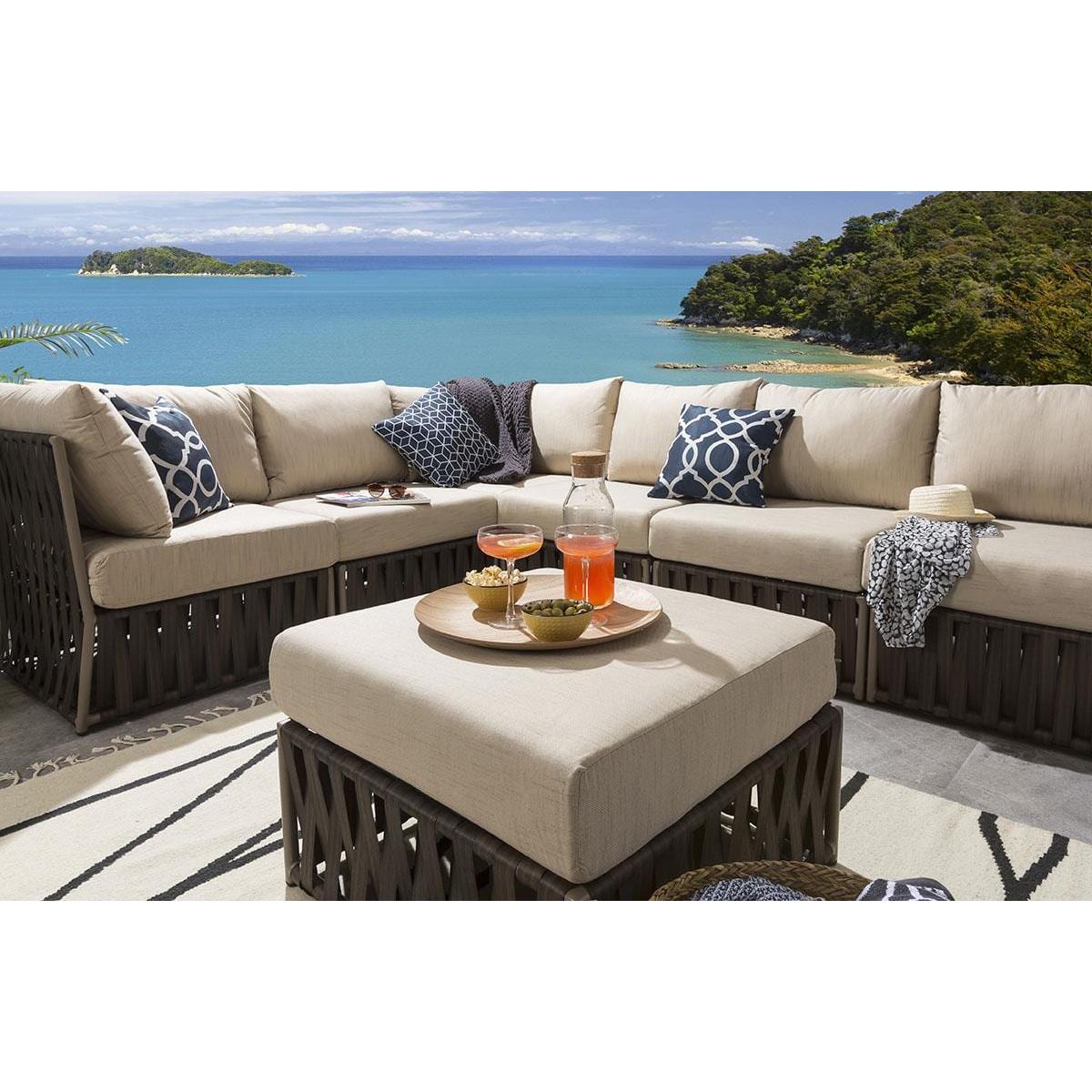 The Theo 6 seater premium brown thick rattan weave sofa range combines modular practicality with designer style and luxury comfort. Our extra large outdoor 6 seater garden corner sofa & footstool will make a gorgeous addition to your outdoor seating area or patio. All sections in this range come with a free winter cover. The outdoor sofa set comes complete with our signature luxuriously thick cushioning that offers unbeatable comfort, topped off with rich Beige high-end marine fabric which has amazing resilience to colour fading and damage caused by extreme weather conditions. Expertly crafted aluminium frames are highly durable, complemented by the intricate rattan weave that blends traditional with contemporary. It offers an unexpected alliance between the design minimalism of its metallic structure and the artisanal warmth of its UV and weather-resistant hand-woven rattan. The whole set is super-easy to clean, guaranteeing years of enjoyment with the modular garden sofa. If you need more information about this product, use the Live Chat service to speak to the team or send us a message. Spread the cost our with interest-free finance options. Minimum spend applies. W360cm D220cm H75cm Spacious 6 Seater Patio Corner Brown Rattan Sofa & Footstool Free beige protective cover included