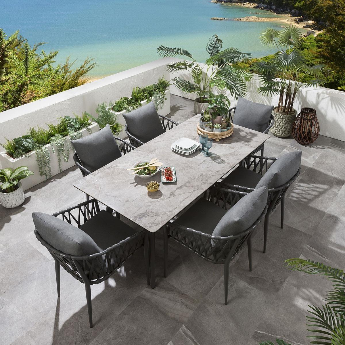 Our hard-wearing and spacious ceramic 180cm rectangular garden dining table makes a perfect addition to any contemporary, modern or minimalist outdoors, providing enough space for up to six people to enjoy dining in comfort. Made from robust and ultra-durable ceramic in a natural smooth grey marble-effect finish, atop a hard-wearing grey aluminium metal frame - which are set to last for years to come and comes with a free protective winter cover. Included in the set; fabulous all-weather grey rope-back garden dining chairs. The generously padded outdoor chairs are enhanced by a supportive back cushion for an extra layer of luxurious comfort. Our gorgeous rope back garden chairs will make a stunning addition to your outdoor seating area or patio. The garden chairs come complete with our signature luxuriously thick cushioning that offers unbeatable comfort, topped off with rich Grey high-end marine fabric which has amazing resilience to colour fading and damage caused by extreme weather conditions. Expertly crafted aluminium frames are highly durable, complemented by clean lines that lend contemporary style. It is robust and weather-resistant for outdoor use & the super cushioned seating offers comfortable support that's shower-resistant, but we advise that cushions are stored when not in use. W180cm D90cm H73cm 6 Seater Garden Dining Set Free beige protective cover included