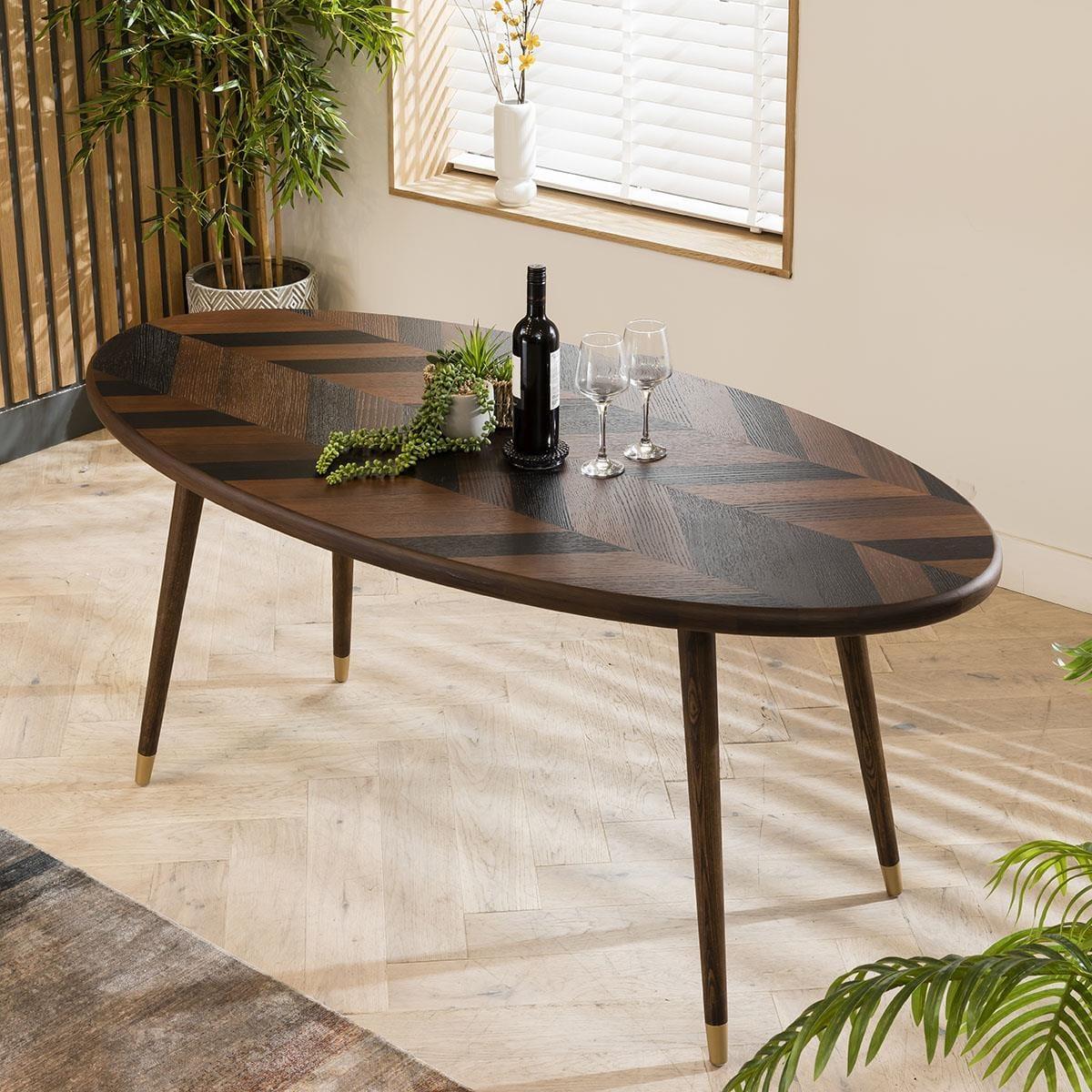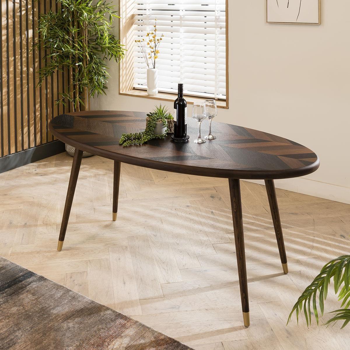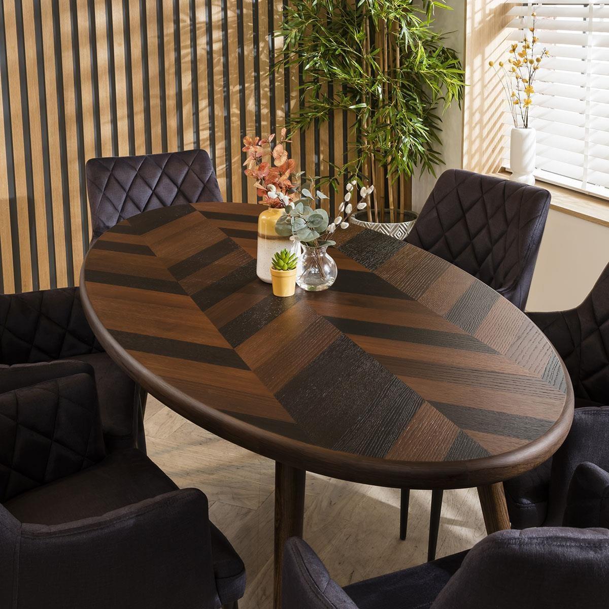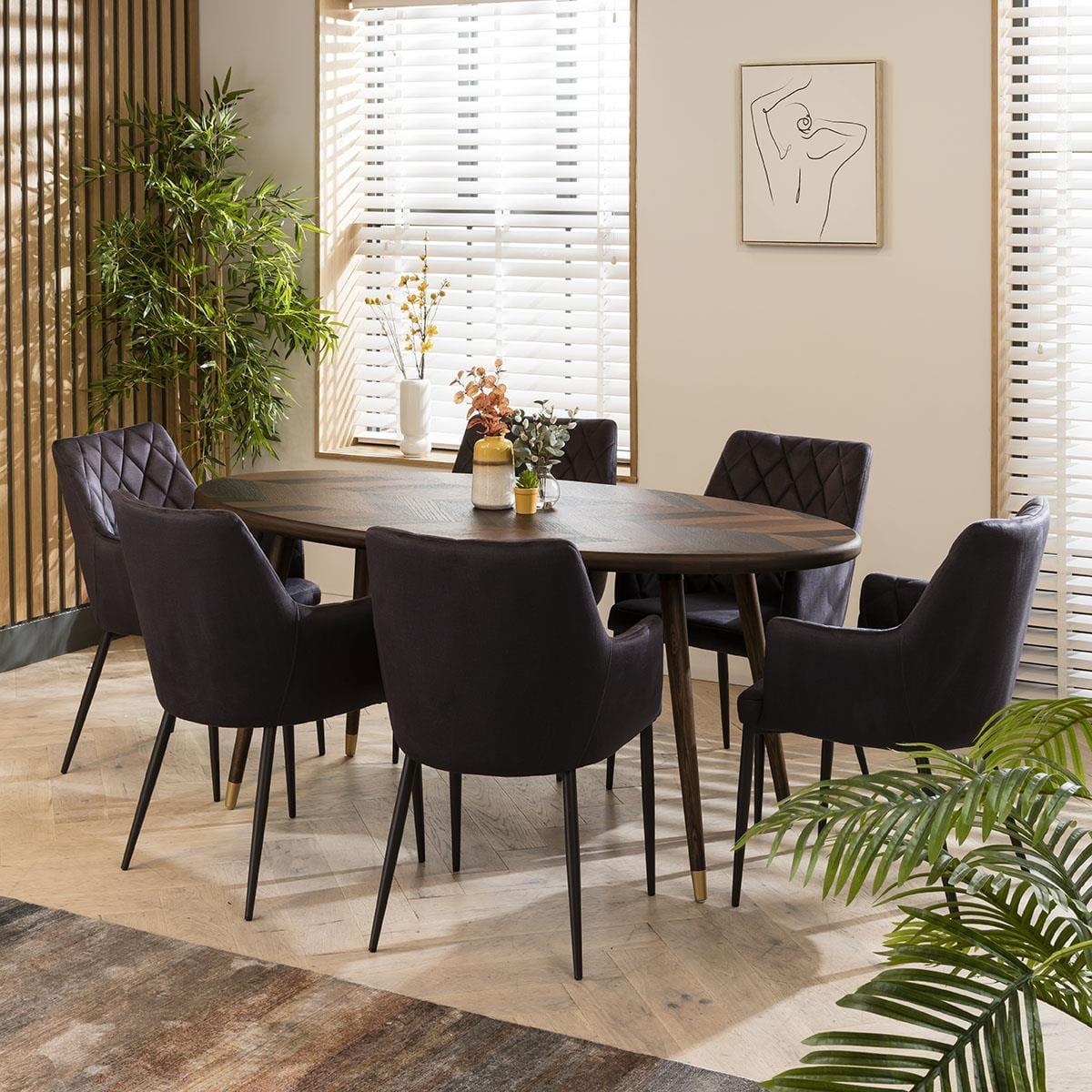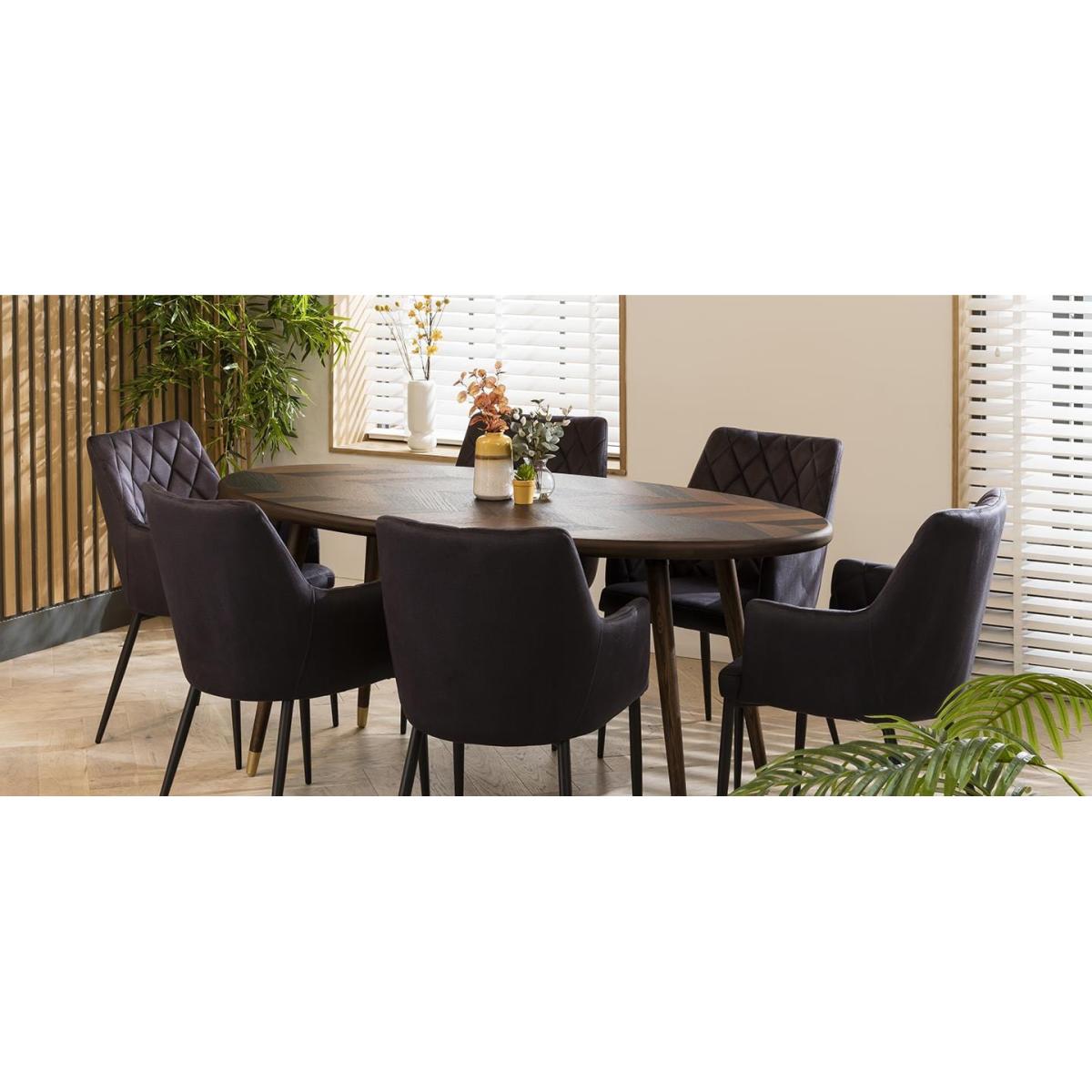 The Duke 6-seater dining set, a harmonious blend of retro flair and modern aesthetics. This exquisite dining ensemble for six includes an elegant oval dining table paired with modern dining chairs and comfortable carver chairs with arms. Elevate your kitchen or dining space with timeless style and contemporary charm. At 180cm long this 6-seater oval dining table and chair set fuses modern elegance and Scandi influence to elevate your dining space to new heights. Crafted with meticulous attention to detail, the chevron wood pattern on the oak veneer top and brass colour metal caps on the legs bring this kitchen dining room table to perfection. Turning the spotlight on classic carver style with a modern industrial twist, the ever-popular Duke carver dining chairs are upholstered in a soft, fine charcoal grey fabric, featuring a stunning diamond quilted design. Complemented by the up-right supportive arms, atop expertly crafted powder coated metal legs. This 6 seater dining set is the perfect blend of modern design, premium materials, and spacious seating, making it an excellent choice for those who appreciate both style and comfort. Transform your dining room into an elegant haven where you can create cherished memories with your loved ones, all centered around this exquisite dining set for 6. Table Size W180cm D90cm H76cm Chair Size W55cm D54cm H87cm 6 Seater Oval Dining Set