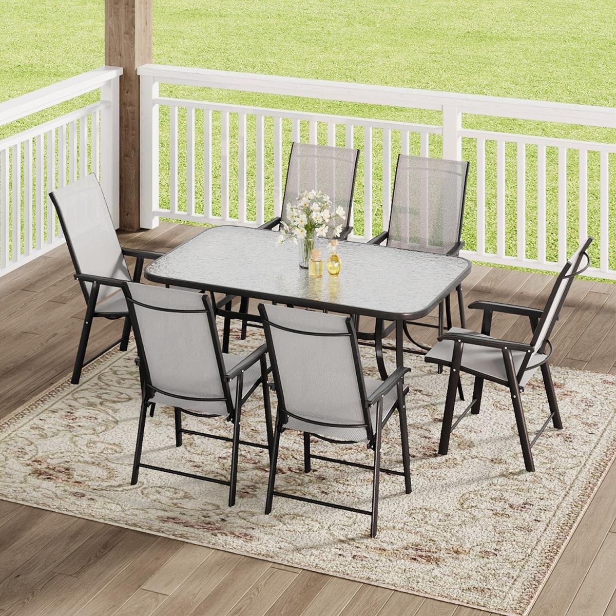 Make the most of summer with this 6-seat garden table set. The rippled tempered glass table is stylish and cool. Six folding chairs offer breathable comfort and full support. A parasol hole lets you enjoy shade during hot days. Sleek, modern, and perfect for patios or balconies. 6 Seater Patio Set with Table and Foldable Chairs - Black / 1 x 150CM Glass Table and 6 x Rattan Chairs / 1 x 150CM Glass Table and 6 x Chairs