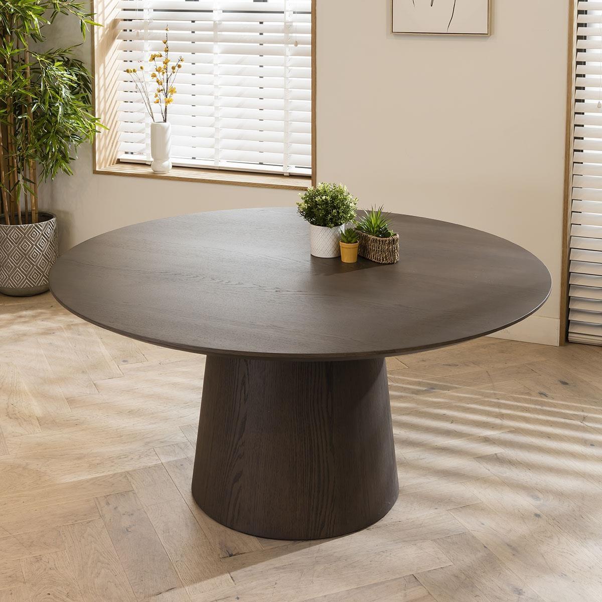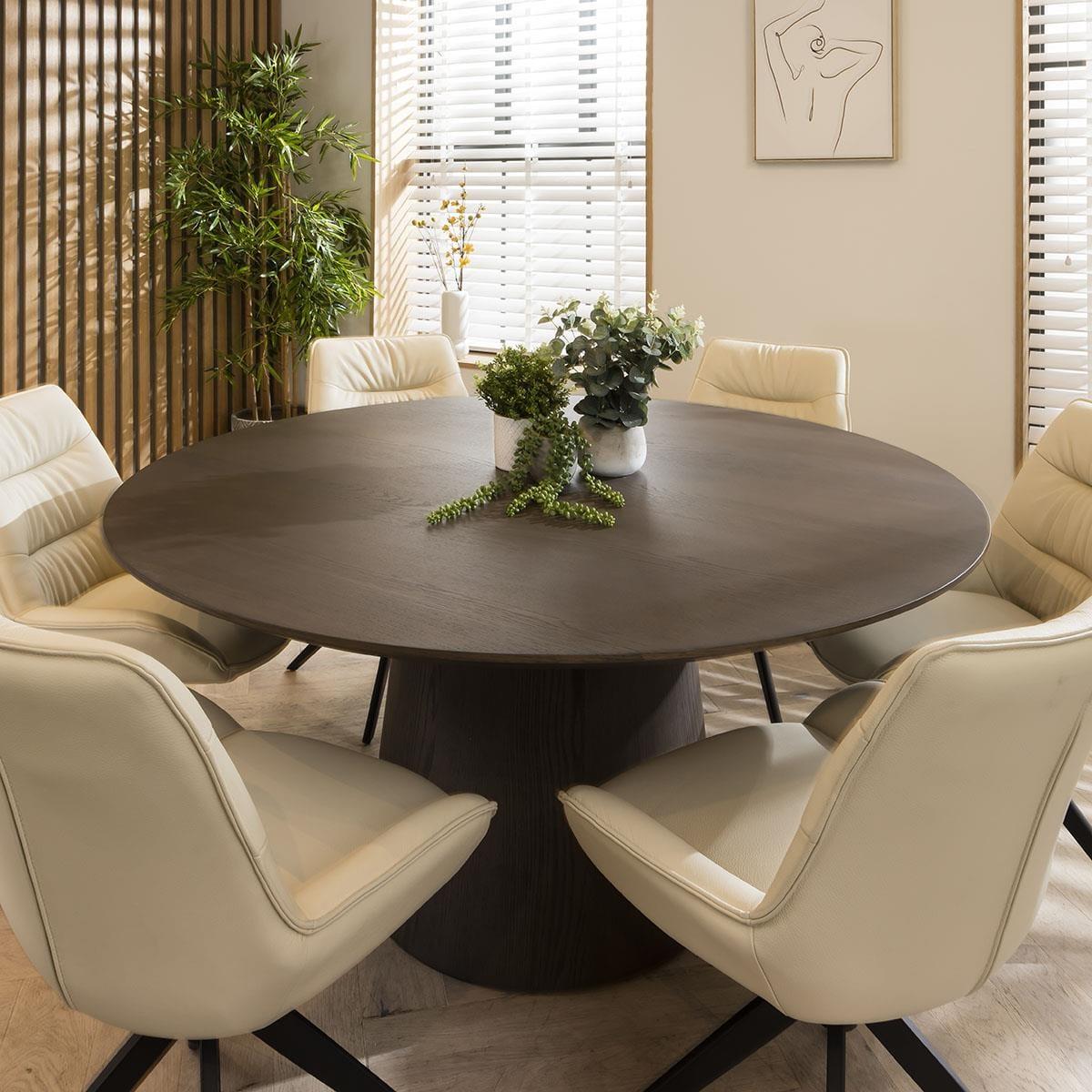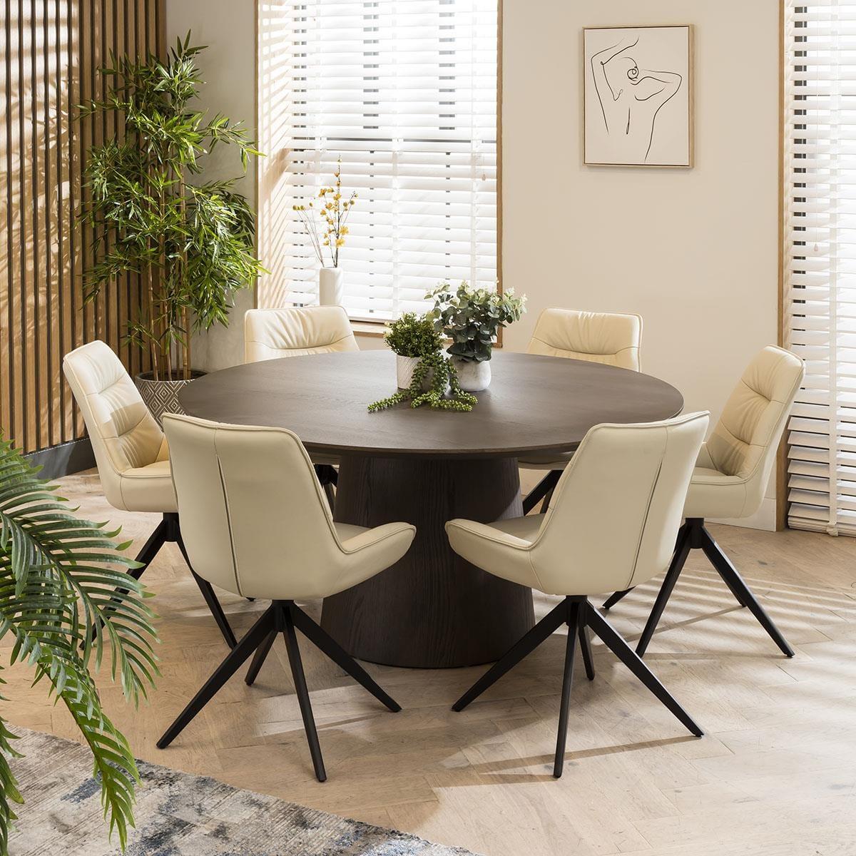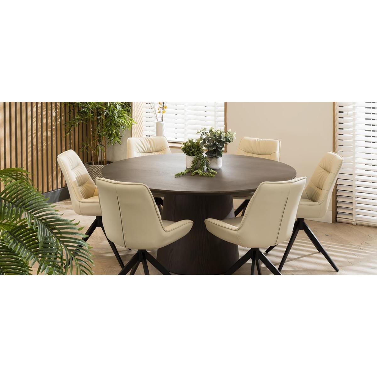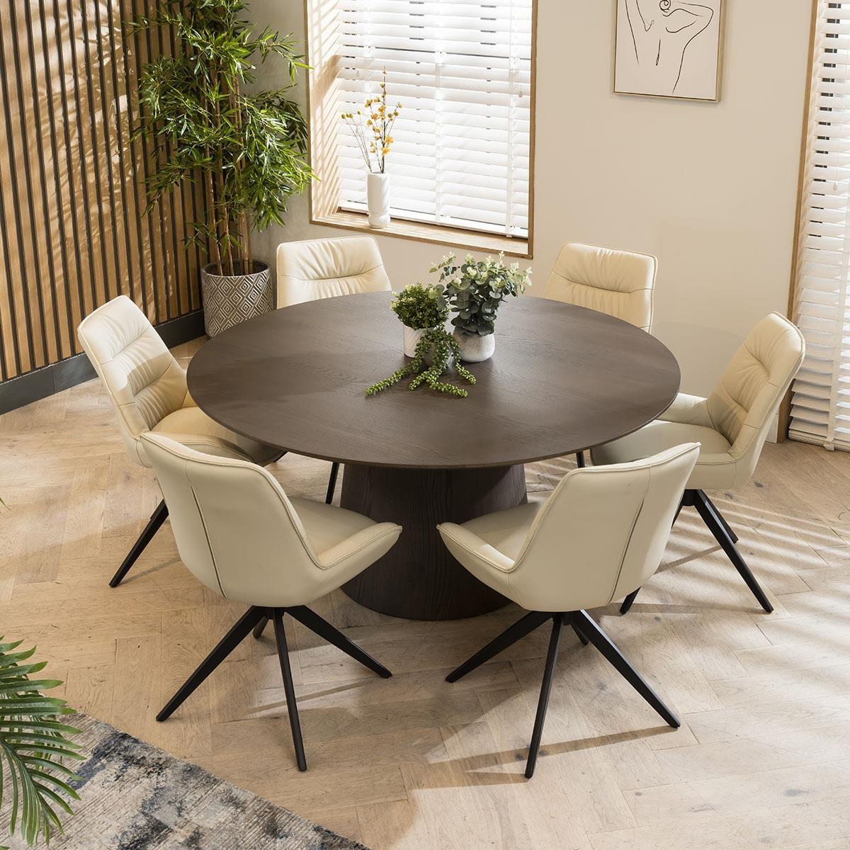 The Nora contemporary 6 seater round dining set combines modern aesthetics with premium functionality. Crafted with meticulous attention to detail, this six person set features a grey oak veneer round dining table and elegant cream leather dining room chairs, the perfect addition to any modern kitchen or dining room. Elevate your dining experience with a modern grey round dining table. Designed with a 150cm diameter, the round kitchen table comfortably accommodates six people, making it ideal for gatherings or family meals. The contemporary design of this wooden dining table for 6 adds a touch of modern style to any dining space. Elegance with comfort is effortlessly blended with the Nora leather dining chairs in this set, crafted with genuine cream leather. These cushioned dining room chairs feature a sleek 4-point swivel base that ensures stability and ease of movement, making the chairs a perfect addition to any contemporary kitchen or dining space. This 6 seater dining set is the perfect blend of modern design, premium materials, and spacious seating, making it an excellent choice for those who appreciate both style and comfort. Transform your dining room into an elegant haven where you can create cherished memories with your loved ones, all centered around this exquisite dining set for 6. Table Size W150cm D150cm H75cm Chair Size W58cm D64cm H85cm 6 Seater Round Dining Set