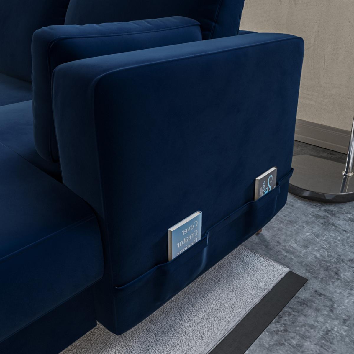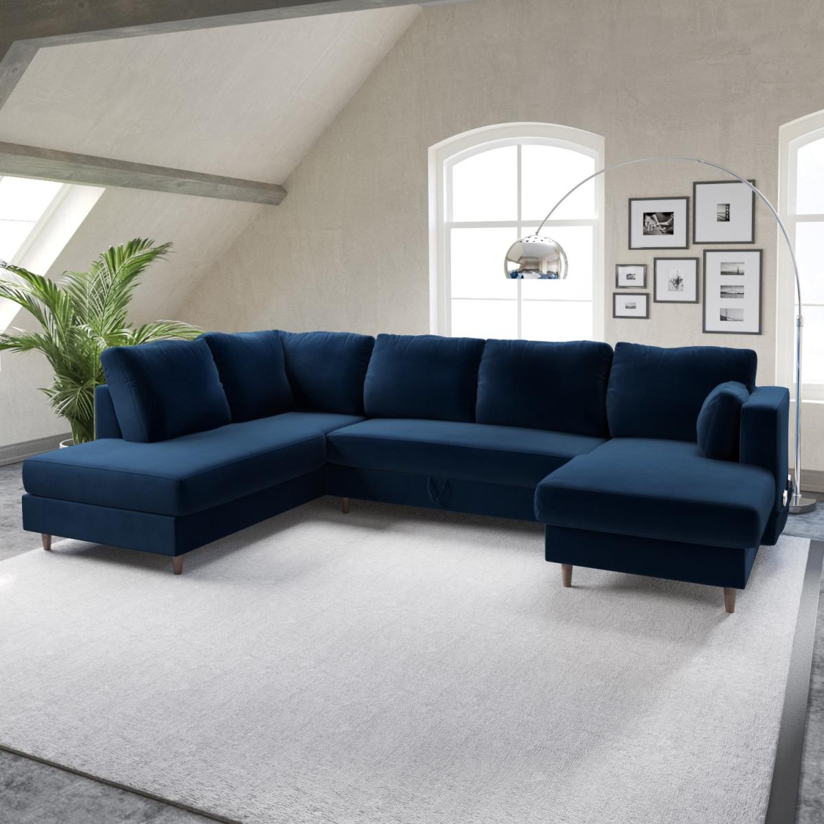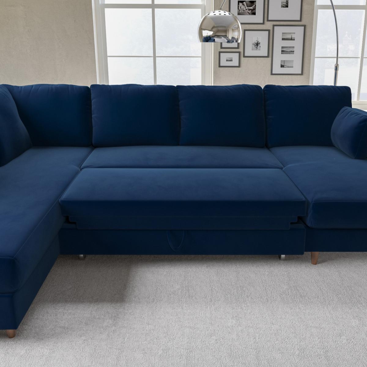 Features we love Navy velvet U-shaped sofa bed with ottoman storage Super comfy sofa with easy pull-out bed mechanism Reversible back cushions provide great back support Frame constructed from sustainably sourced hardwood Filled with high-density foam for ultimate comfort All about me Create the ultimate relaxation space in your living room with the Boe navy u shape sofa. Stylish yet practical, it quickly converts into a bed, plus it has an ottoman storage section which is perfect for keeping blankets and bedding handy. This sofa is very practical, with handy side pockets you will never lose your tv remote again! Minimal assembly is required, just slot the 3 pieces together and screw the legs in. It'll be ready in no time! Need to know Dimensions:W296 x D198 x H86 cm Packaging dimensions (3 boxes):W200 x D88 x H55 cm, H136 x D88 x H57 cm, W144 x D83 x H57 cm Weight:142 kg Seats:6 people Bed size: Double Maximum supported weight:131kg per seat Colour:Navy Finish:Upholstered Material:Velvet fabric, hardwood frame and feet Filling:High-density foam (seats), 100% polyester (back) Alternating chaise: No Assembly required:Yes - just slot 3 pieces together and screw legs in