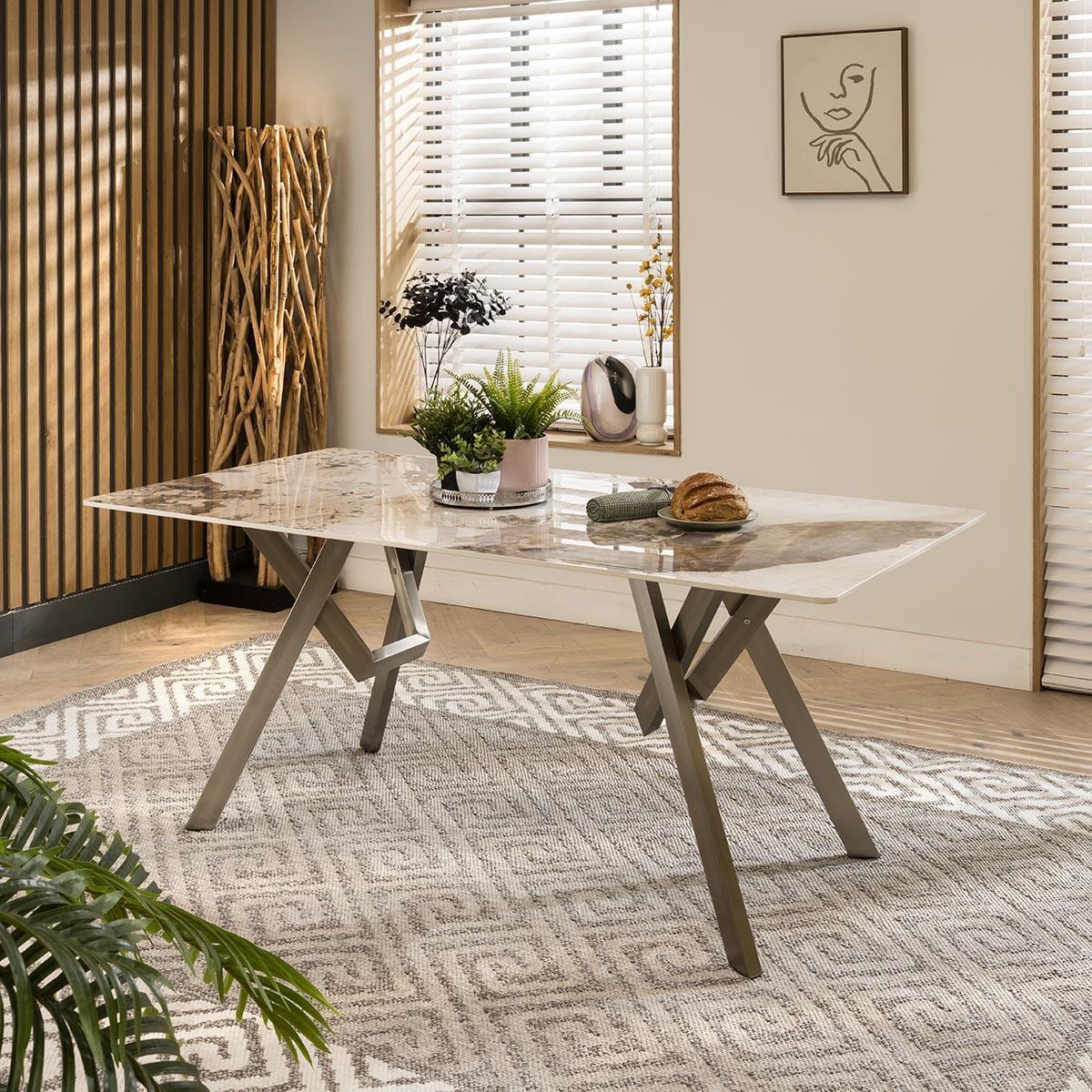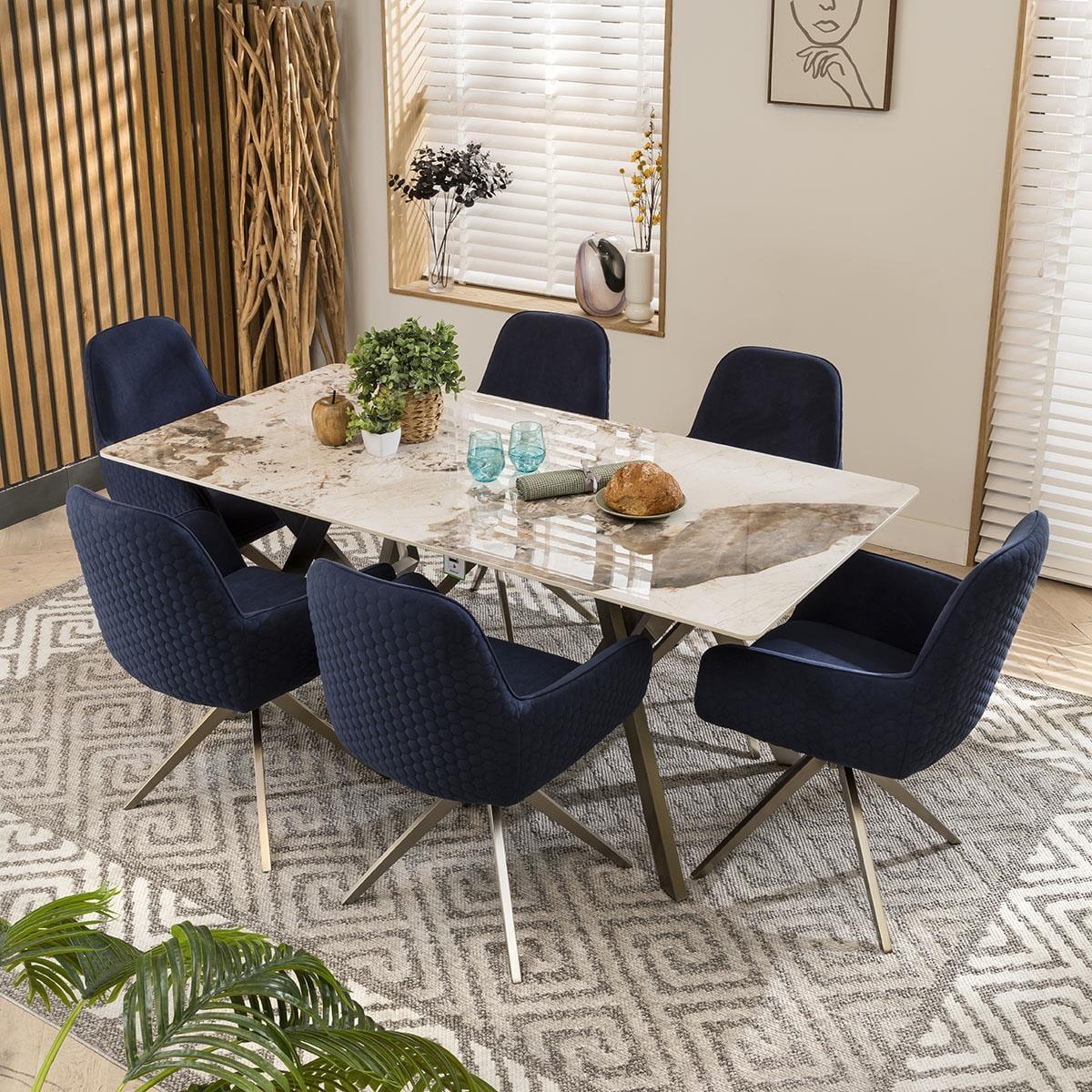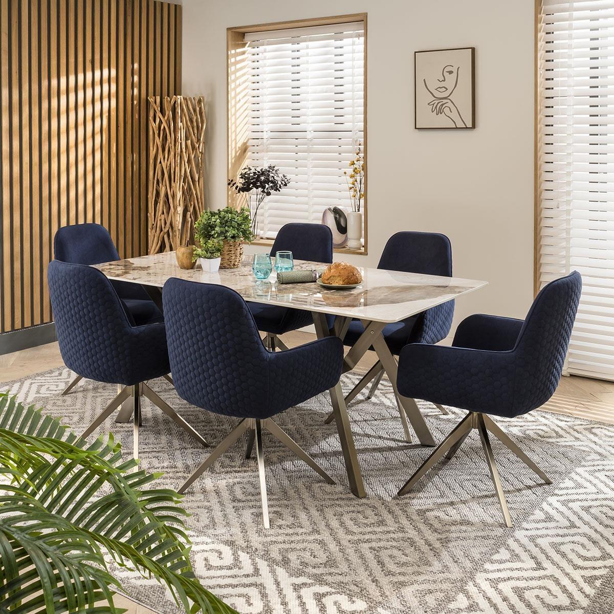 Experience the allure of cutting-edge design meeting opulent charm in our modern dining ensemble. Centred around the Aldgate white ceramic marble dining table are six of our Emma dining chairs, upholstered in a rich navy blue velvet fabric. Transform your kitchen or dining space with this modern 6 seater dining set. Our ultra-modern, ultra-luxurious Aldgate marble-effect dining table has a high-quality white ceramic top that is scratch, stain and heat resistant. The brushed stainless steel legs have an edgy design, perfect for any contemporary kitchen or dining space. This 180cm dining room table will comfortably accommodate the 6 chairs in this set. Crafted with a simple yet thoughtful outline, the Emma carver dining chairs with arms are designed for comfortable dining. Upholstered in navy velvet that adds a touch of opulence to any setting. The dining room chair features a swivel base with a brushed metal finish for a blend of modern aesthetics and plush comfort. This 6 seater dining set combines modern Emma chairs with the stunning Aldgate table. Whether you love the Emma chairs and would like to purchase them individually, or you think the Aldgate table would complete your interior scheme better with another chair, you can easily mix and match our modern dining tables and chairs to curate something truly unique. Table Size W180cm D90cm H76cm Chair Size W62cm D62cm H87cm Dining Table And Chair Set For 6