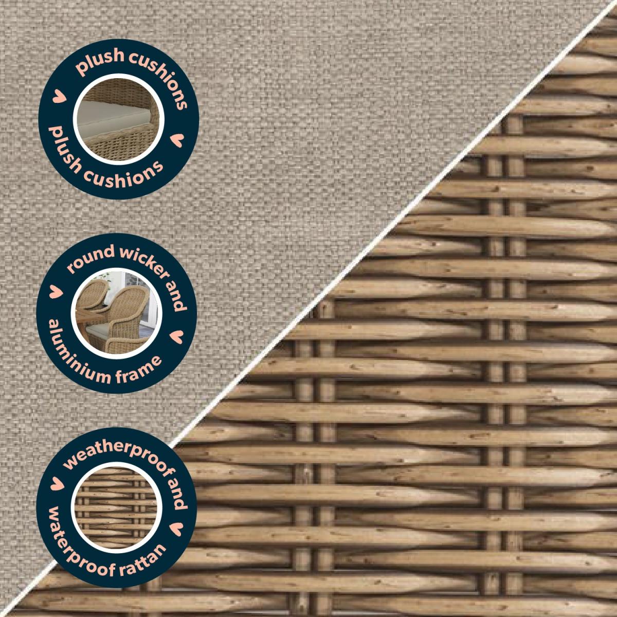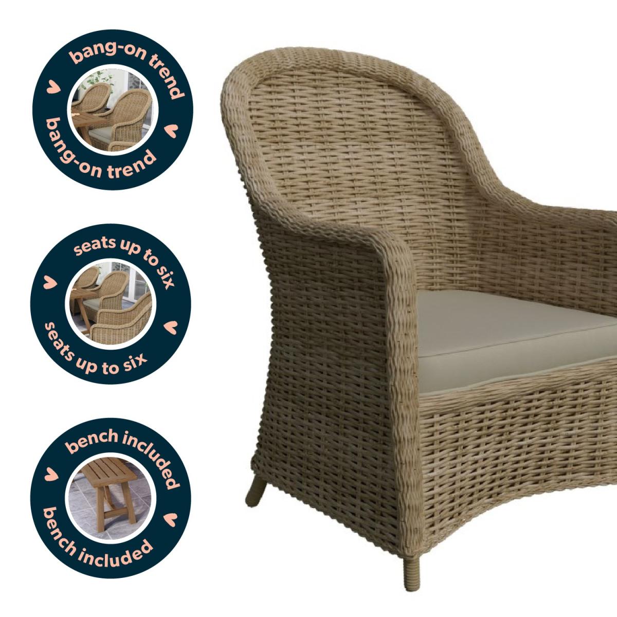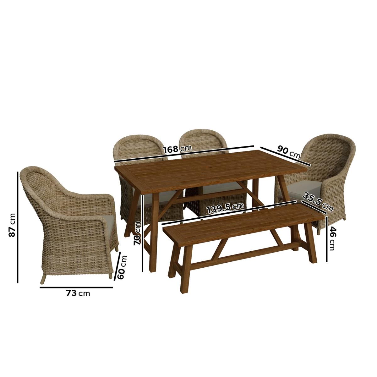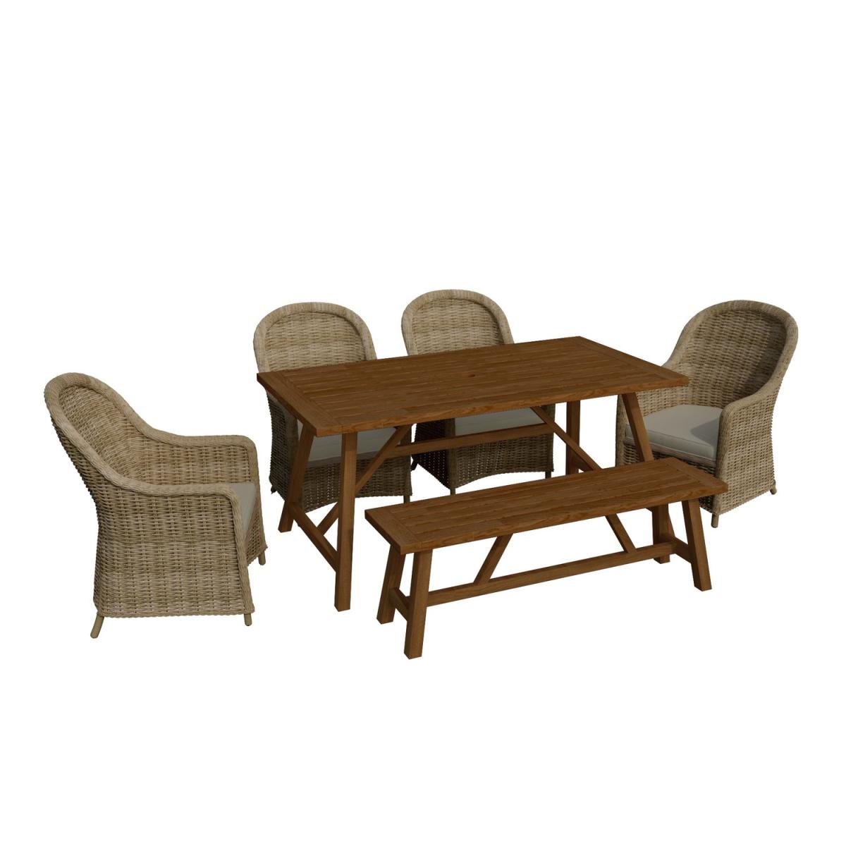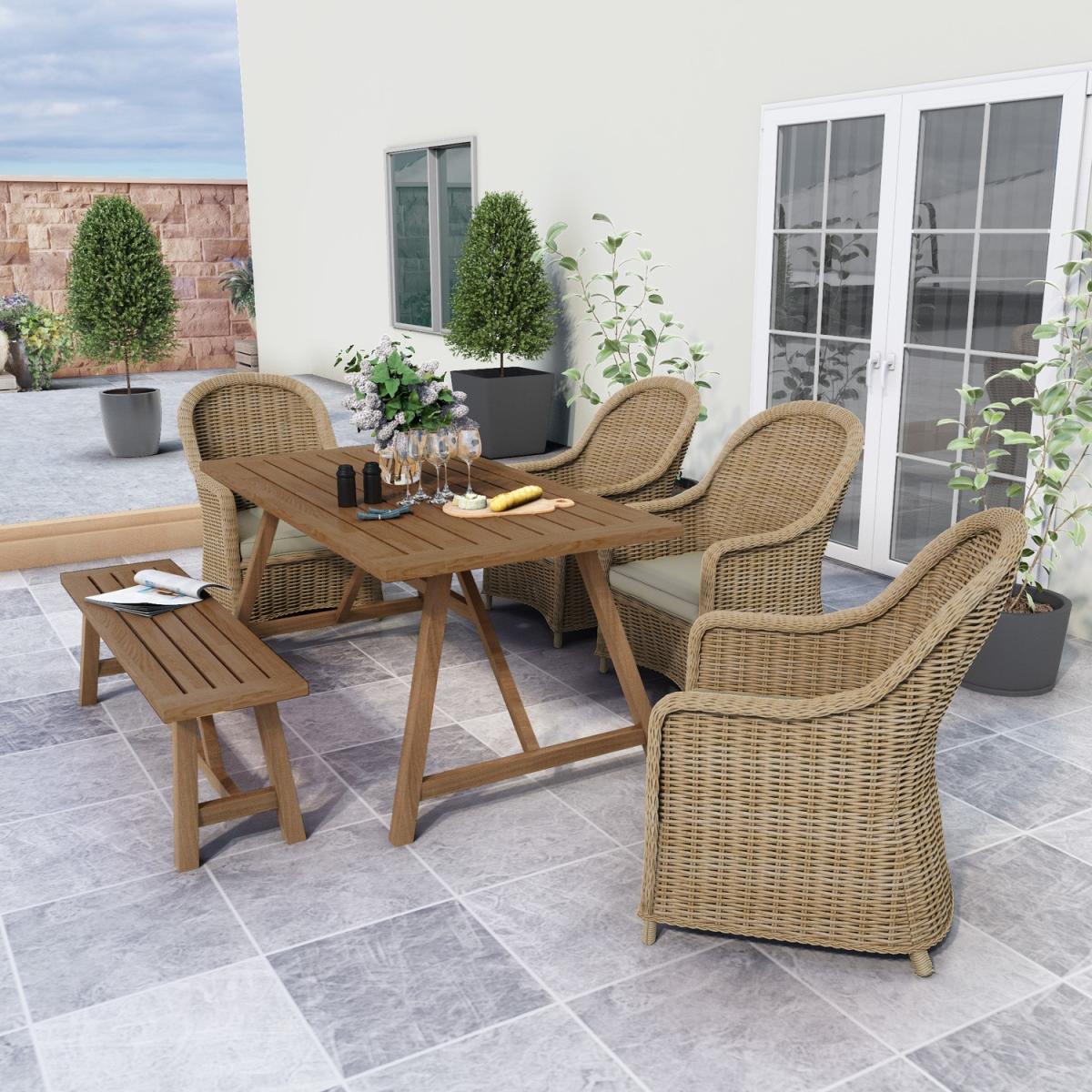 Dine in style with this modern wicker and wood dining set. The beige and brown add warmth to any outdoor or indoor space. It features cosy seating thanks to the traditionally designed woven wicker chairs and contrasting wooden bench and table; it's sure to be a hit with guests. It's weather-resistant, too, making it a durable addition to your garden. Enhance the life of your garden furniture- This product has been designed to be used outdoors. To make the most of your furniture, we recommend that you store it indoors, move it in a sheltered position or protect it by covering it up in bad weather and over the winter period. Why not invest in one of our garden stores to help keep upholstery (cushions) dry and prevent any mould or mildew from forming.