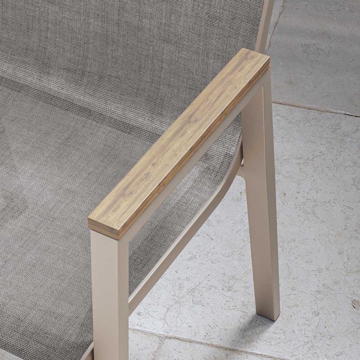 Features we love 6-seater aluminium and wood effect outdoor dining set Stackable chairs for easy storage and to save space Comfy chairs with armrests for extra comfort Made with waterproof, hard-wearing Textilene fabric Wood effect tabletop with powder coated legs All about me This stylish six-seater garden set is perfect for entertaining guests outdoors. The set features a sturdy wooden-top garden table with a metal frame and legs, plus metal framed chairs made with water-resistant Textilene fabric. The champagne powder coated finish adds a stylish touch to create the perfect on-trend garden furniture set. Enhance the life of your garden furniture- This product has been designed to be used outdoors. To make the most of your furniture, we recommend that you store it indoors, move it in a sheltered position or protect it by covering it up* in bad weather and over the winter period. Why not invest in one of our garden stores to keep upholstery (such as cushions) dry, and to prevent mould and mildew forming. *Did you know we now have our own range of garden covers, consisting of 4 different sizes. Need to know Table dimensions:W150 x D90 x H74.2 cm Each chair dimensions:W57 x D62 x H87 cm Max supported weight per seat: 150 kg Overall weight: 46.8 kg Seats: 6 Colour: Wood, grey and champagne Finish: Wood, mesh fabric and powder-coated Material:Powder coated aluminium (chair frames and table legs), Textilene fabric (chairs), Polywood (chair arms and tabletop) For use: Outdoors or indoors (suitable for wooden floors) Assembly required: Yes - attach table legs Total number of boxes: 2 What's included? 1 x Table 6 x Chairs