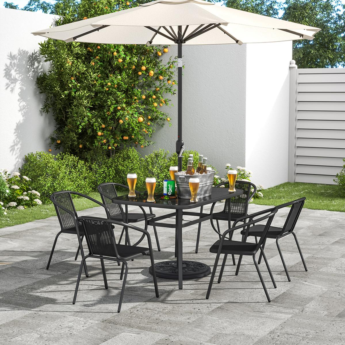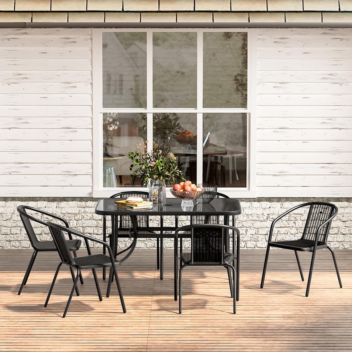 This outdoor bistro set, with its delicate appearance and high quality, can make a great experience for you. Modern and practical 7-piece patio furniture set increases a fashion style to your garden or porch. It includes a tempered table silked in black and 6 plastic stacking chairs. There's a hole in the middle of the table, where you can place a parasol to protect you from the sunlight. In a contemporary style, it's perfect to compliment your garden or balcony.